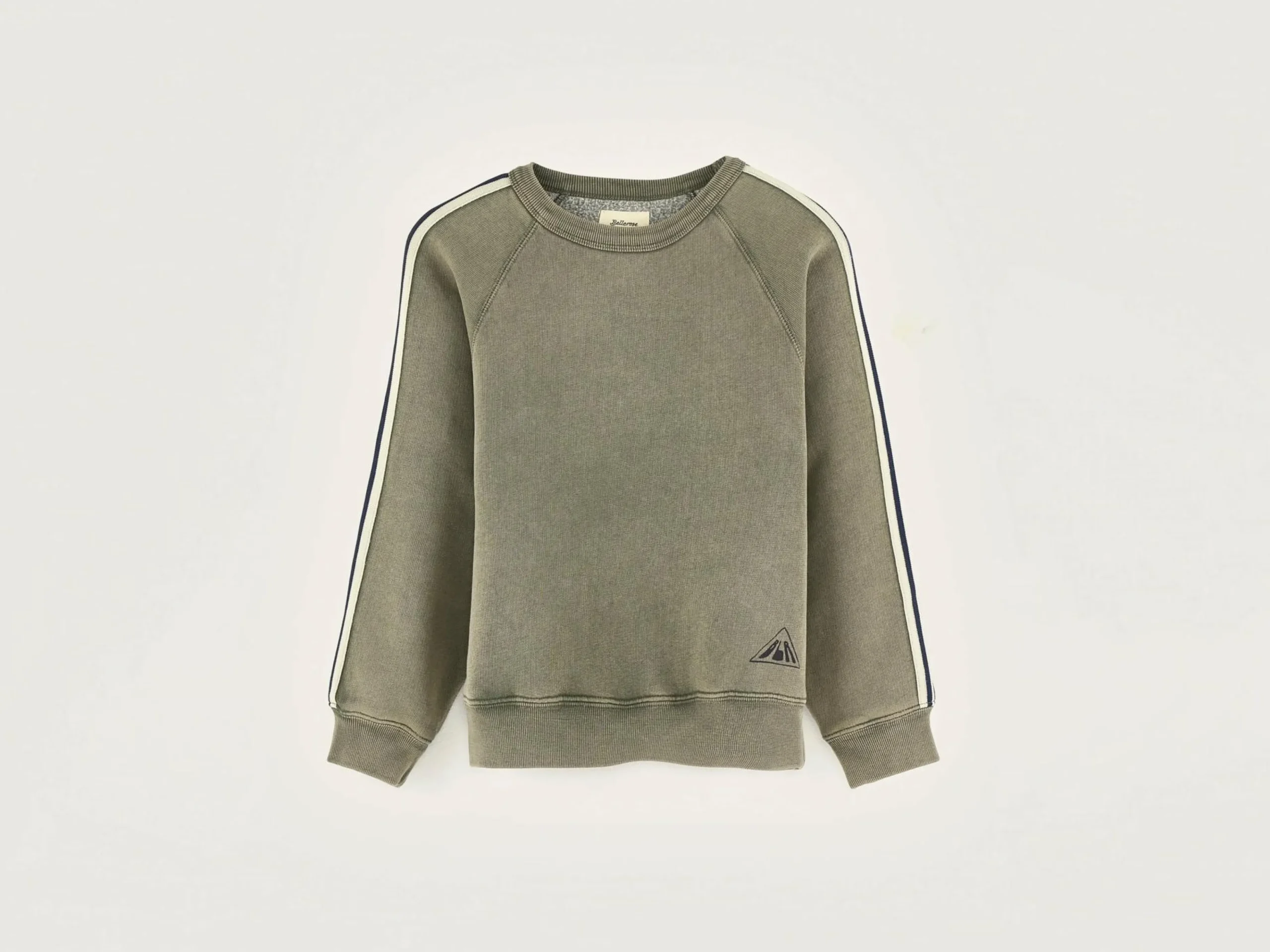 Klassiek mosgroen sweatshirt met contrasterende strepen langs de mouwen.