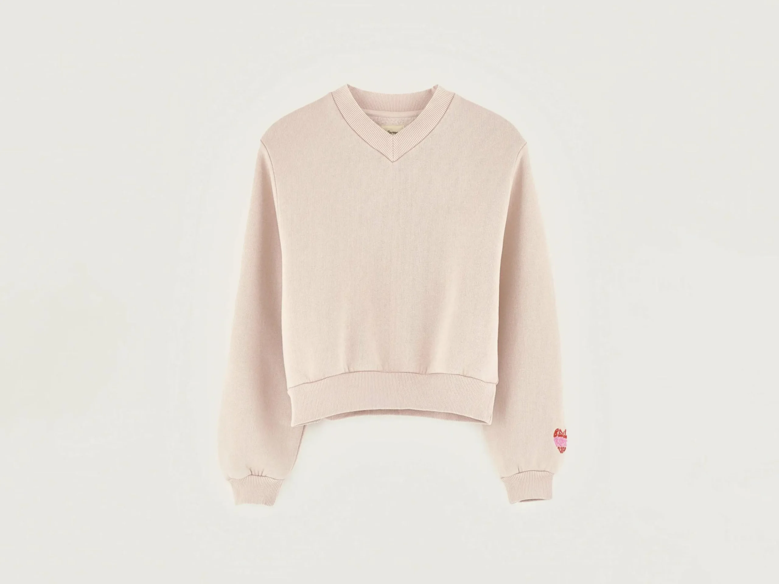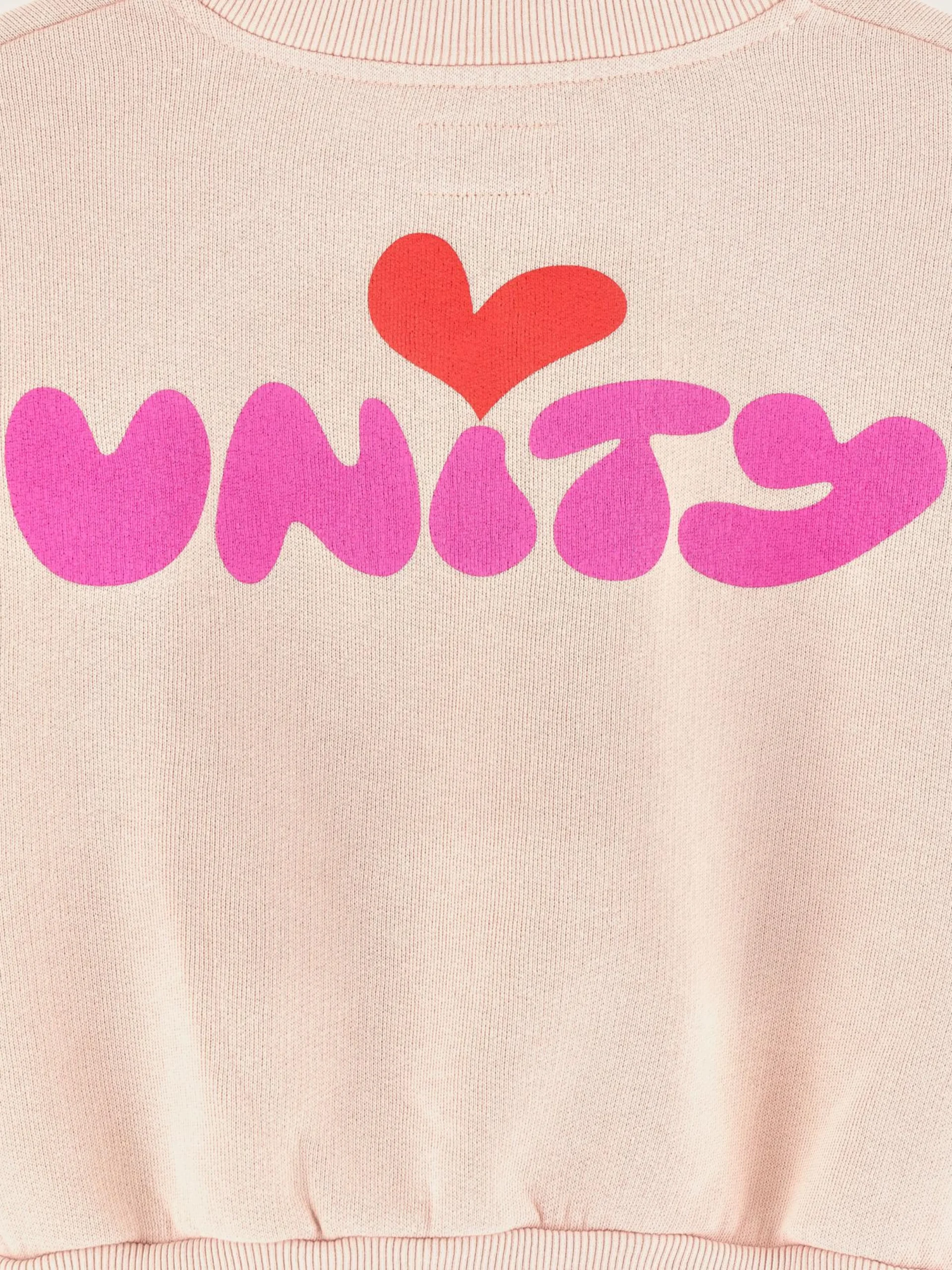 Blushroze, comfortabel sweatshirt met V-hals en met “Unity”-print vooraan.