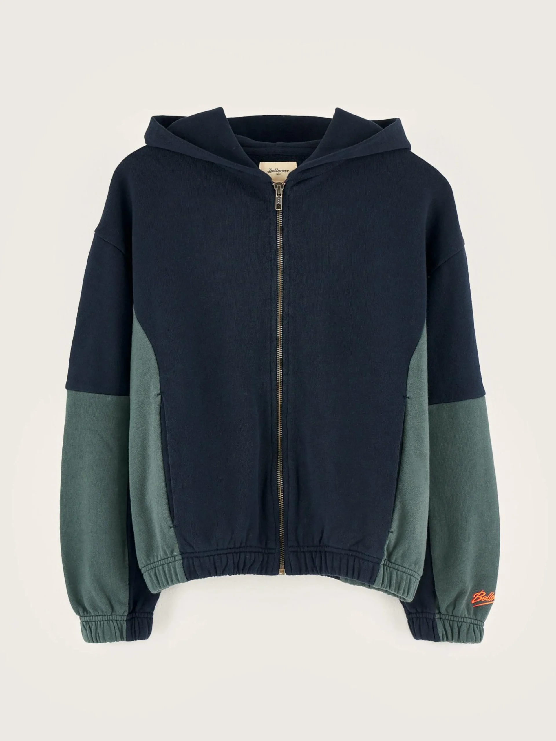 Comfortabele hoodie in colorblockstijl, met ritssluiting vooraan, van donkerblauwe en mosgroene jerseyfleece