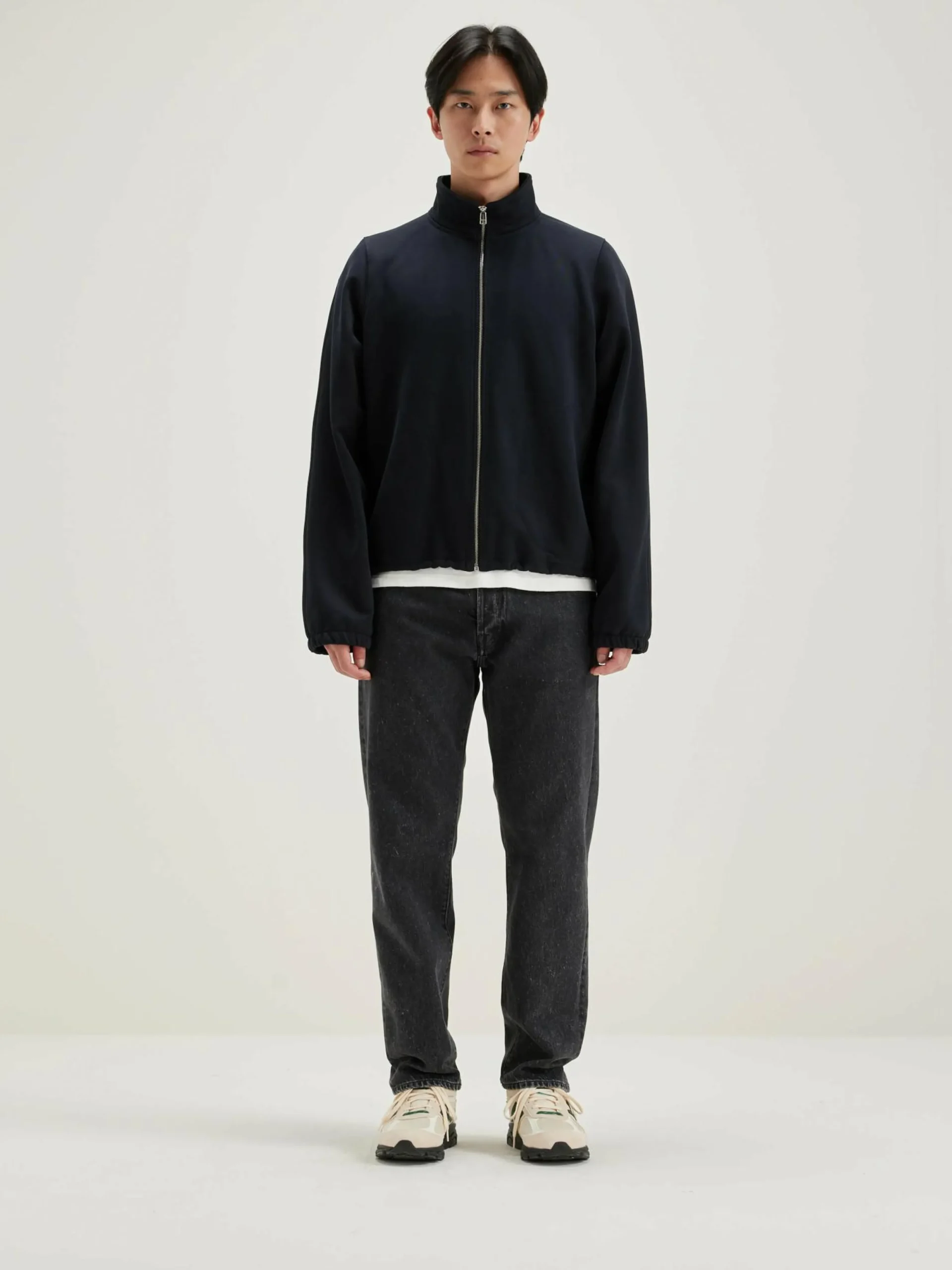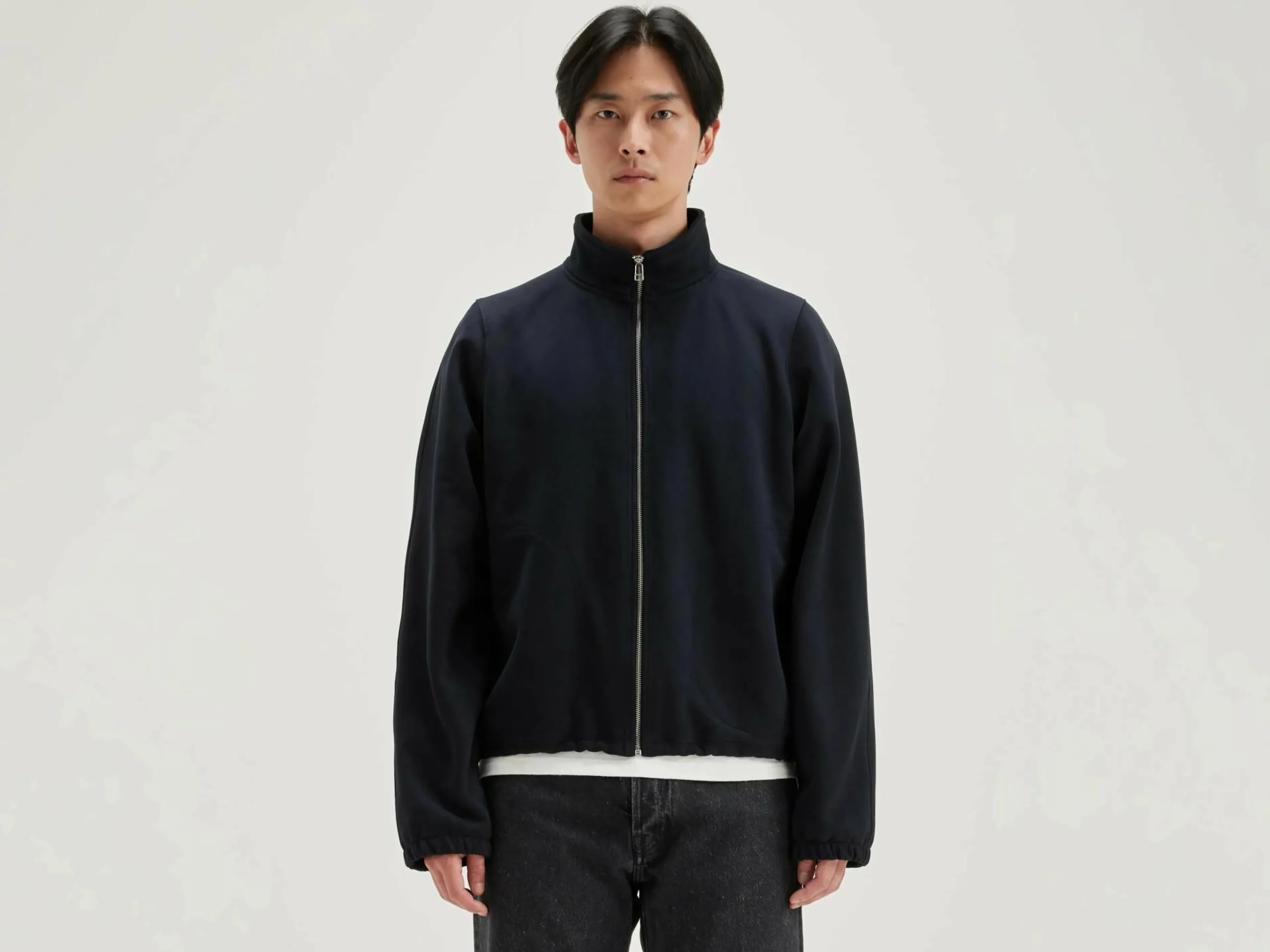 Relaxed sweatshirt met ritssluiting vooraan, van zwartblauwe jersey met neopreeneffect.