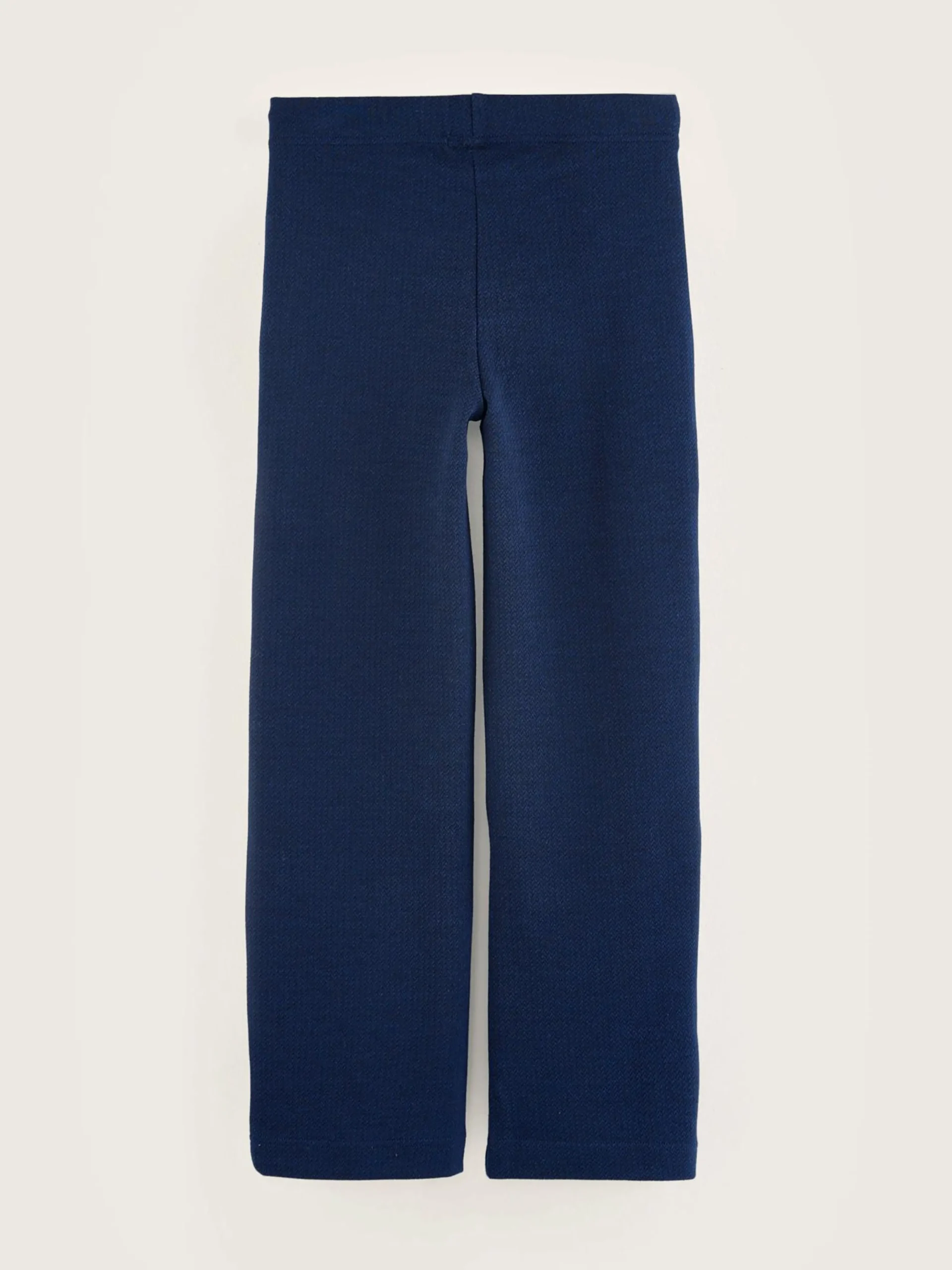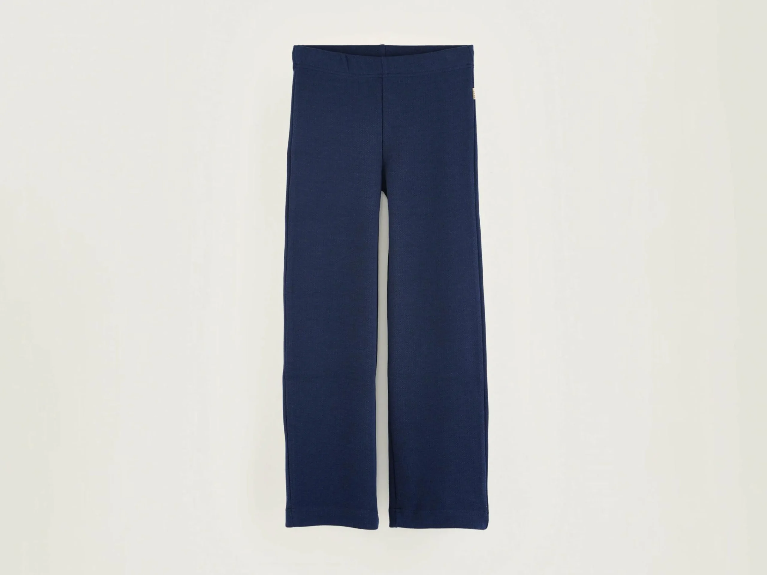 Marineblauwe broek met flared pijpen en elastische tailleband.