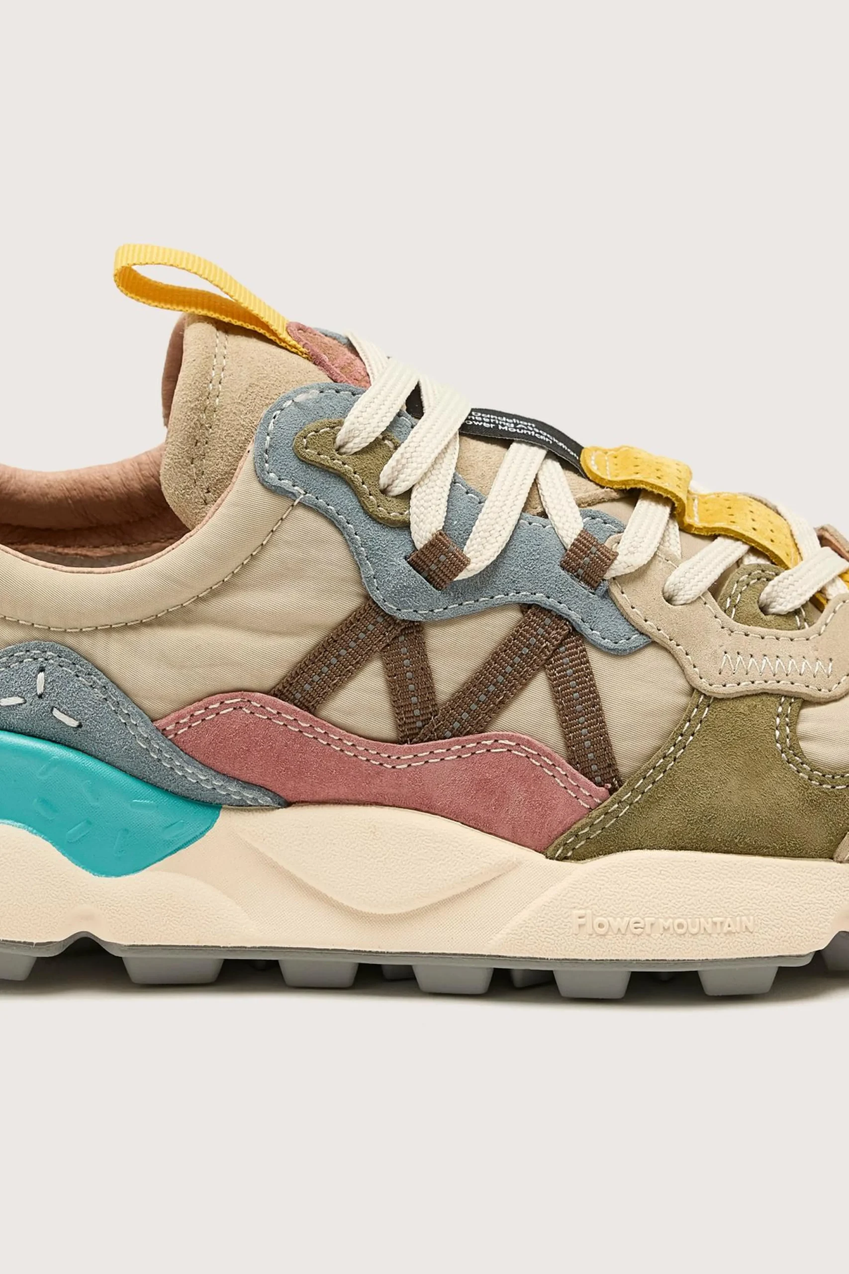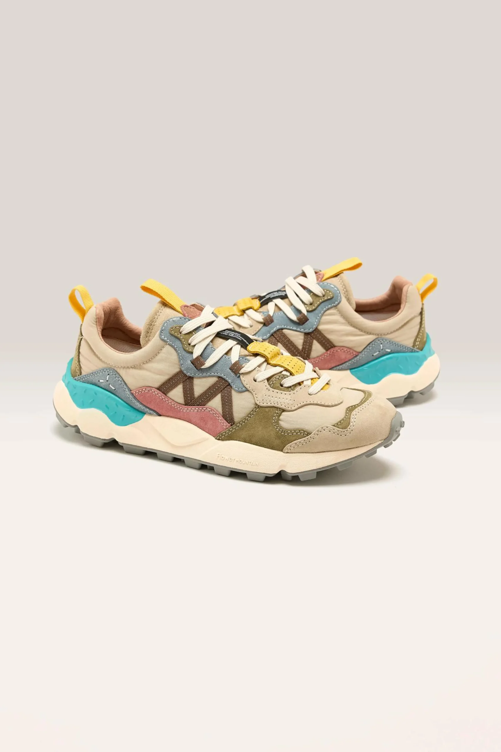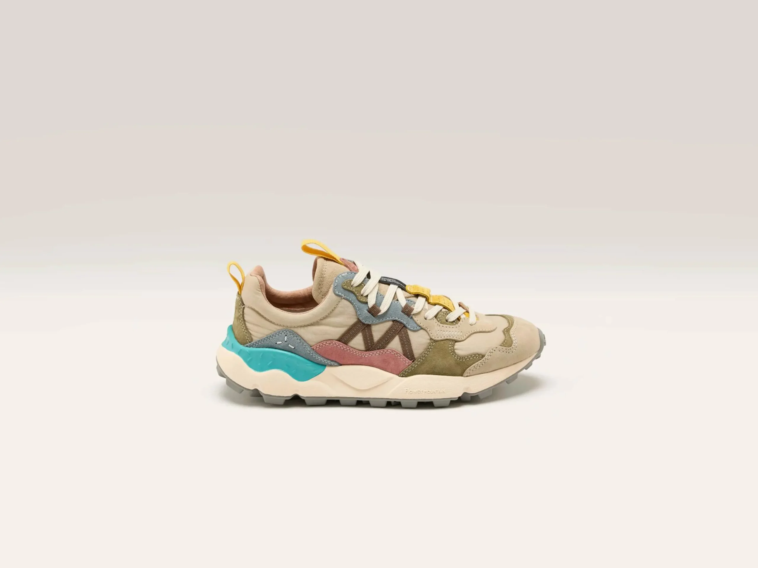 The Flower Mountain LENZAN outdoor sneakers feature a suede upper with technical fabric, removable insoles, and a lightweight rubber sole.