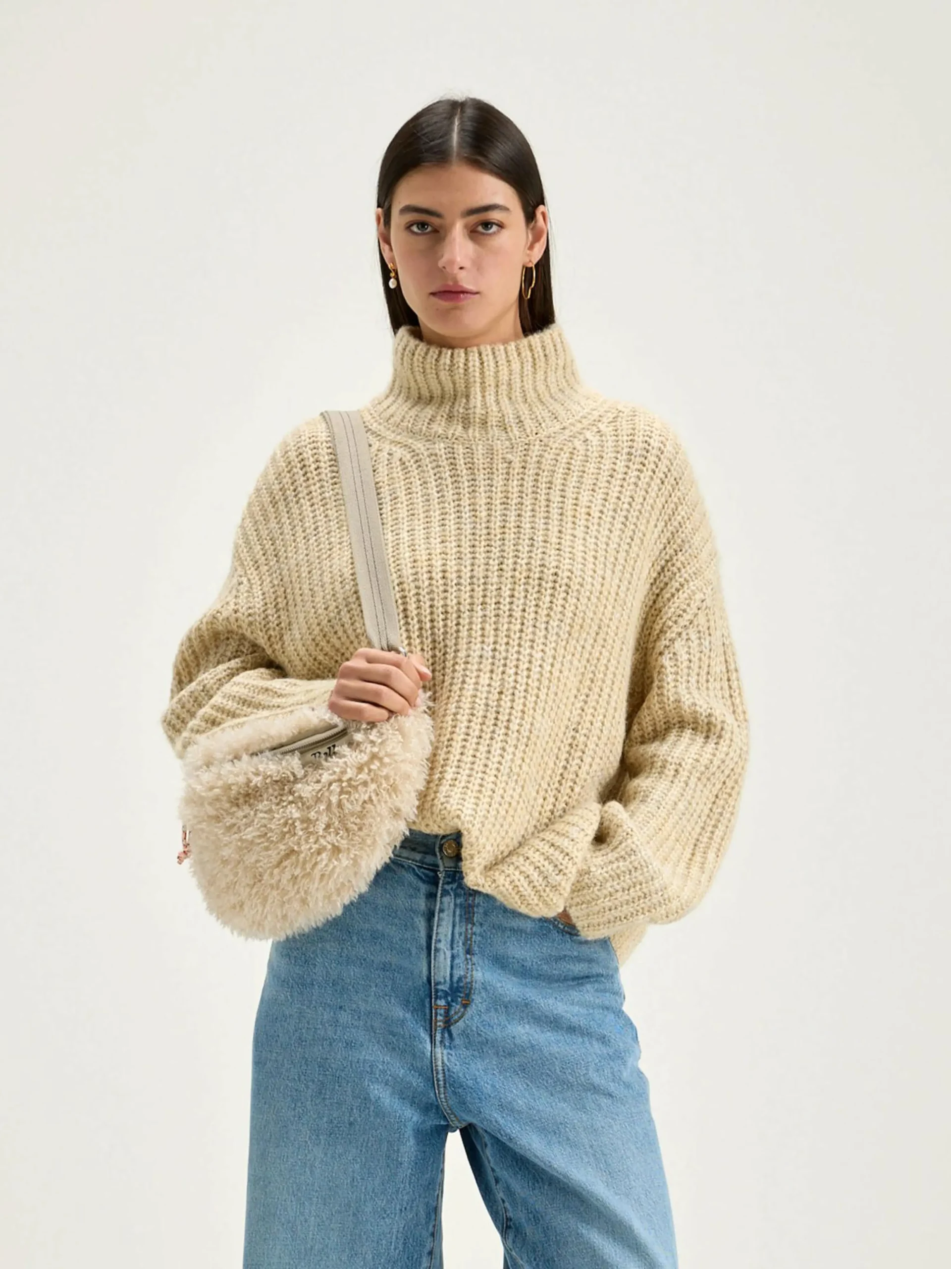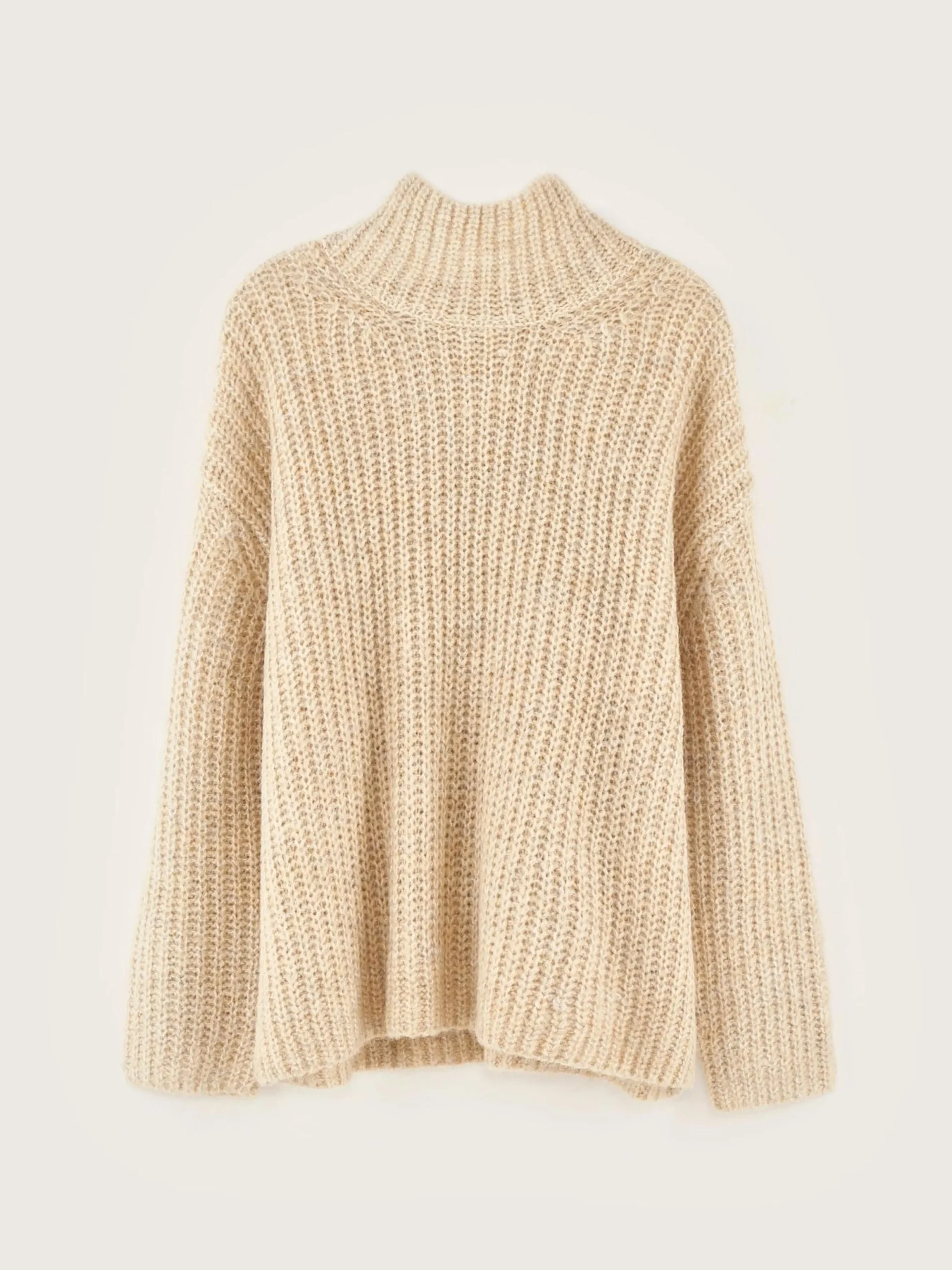 Beige gemêleerde, oversizede trui, recht model met trechterhals.