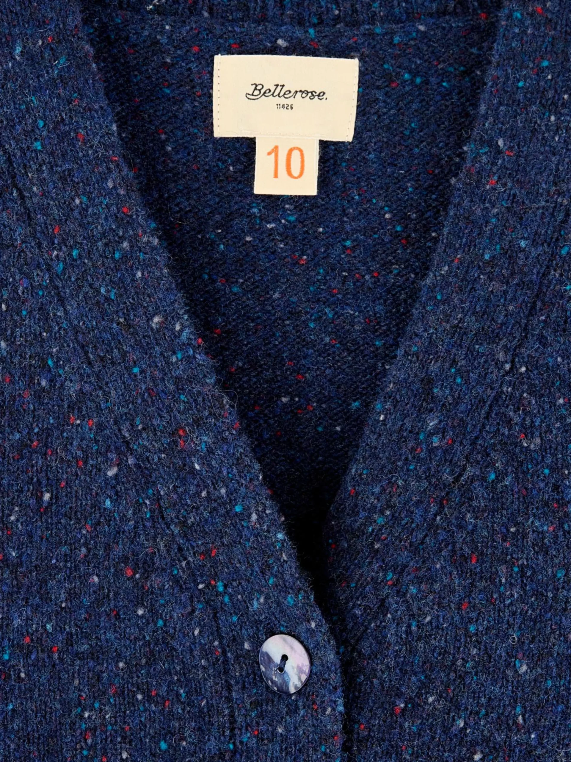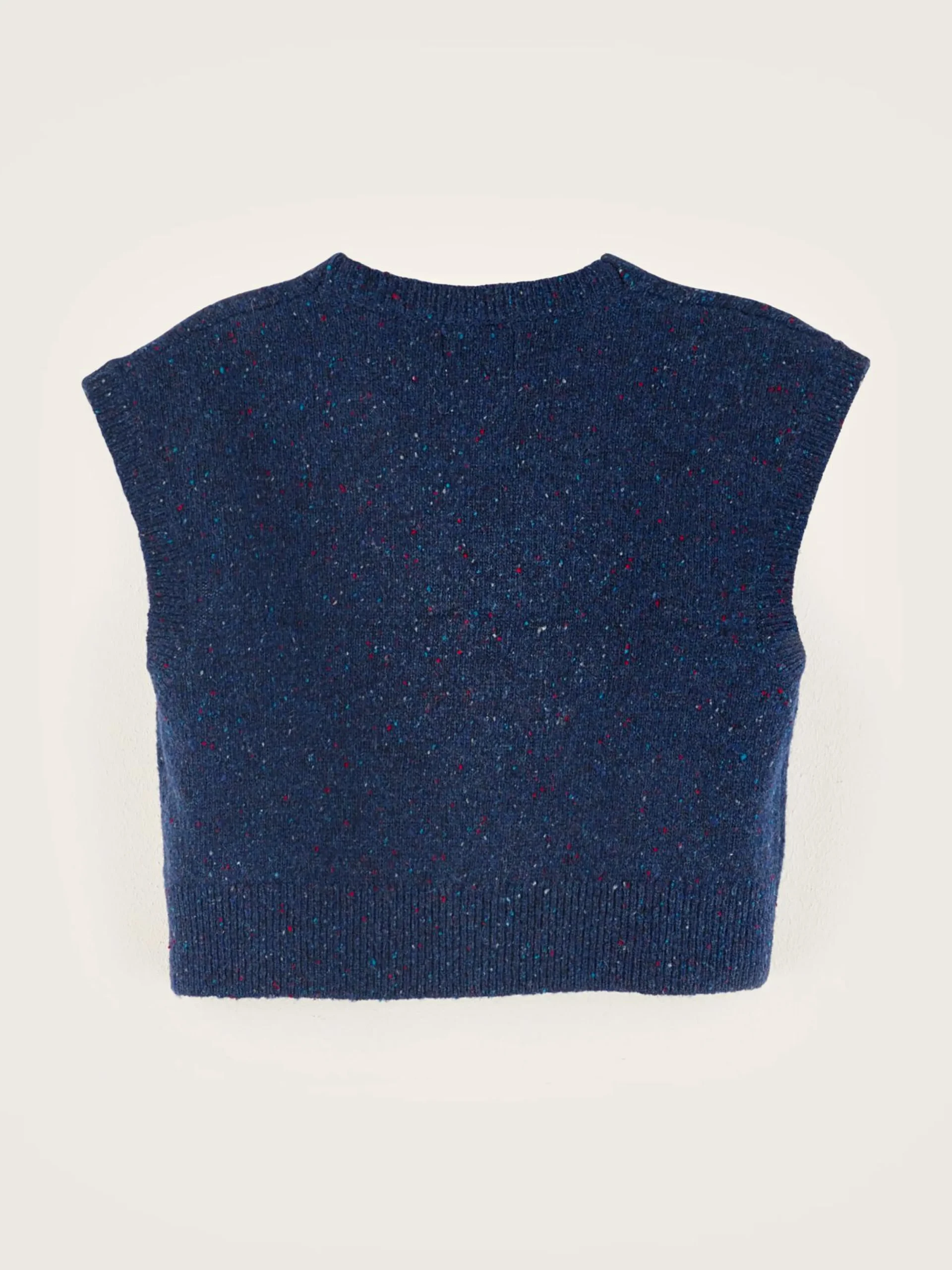 Donkerblauw, mouwloos, cropped en gebreid vest.