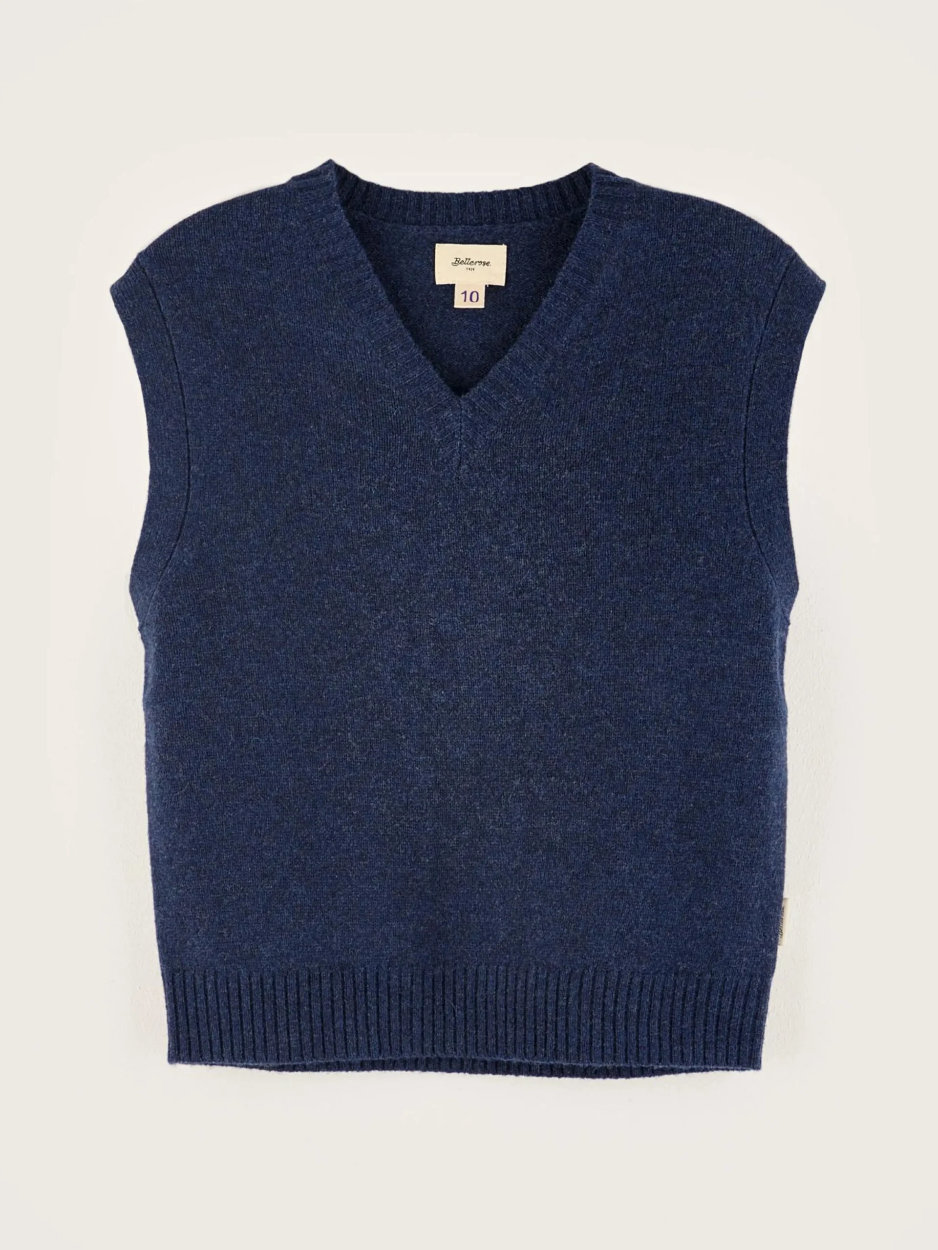 Comfortabele, mouwloze debardeur met V-hals, van inktblauwe merinowol.