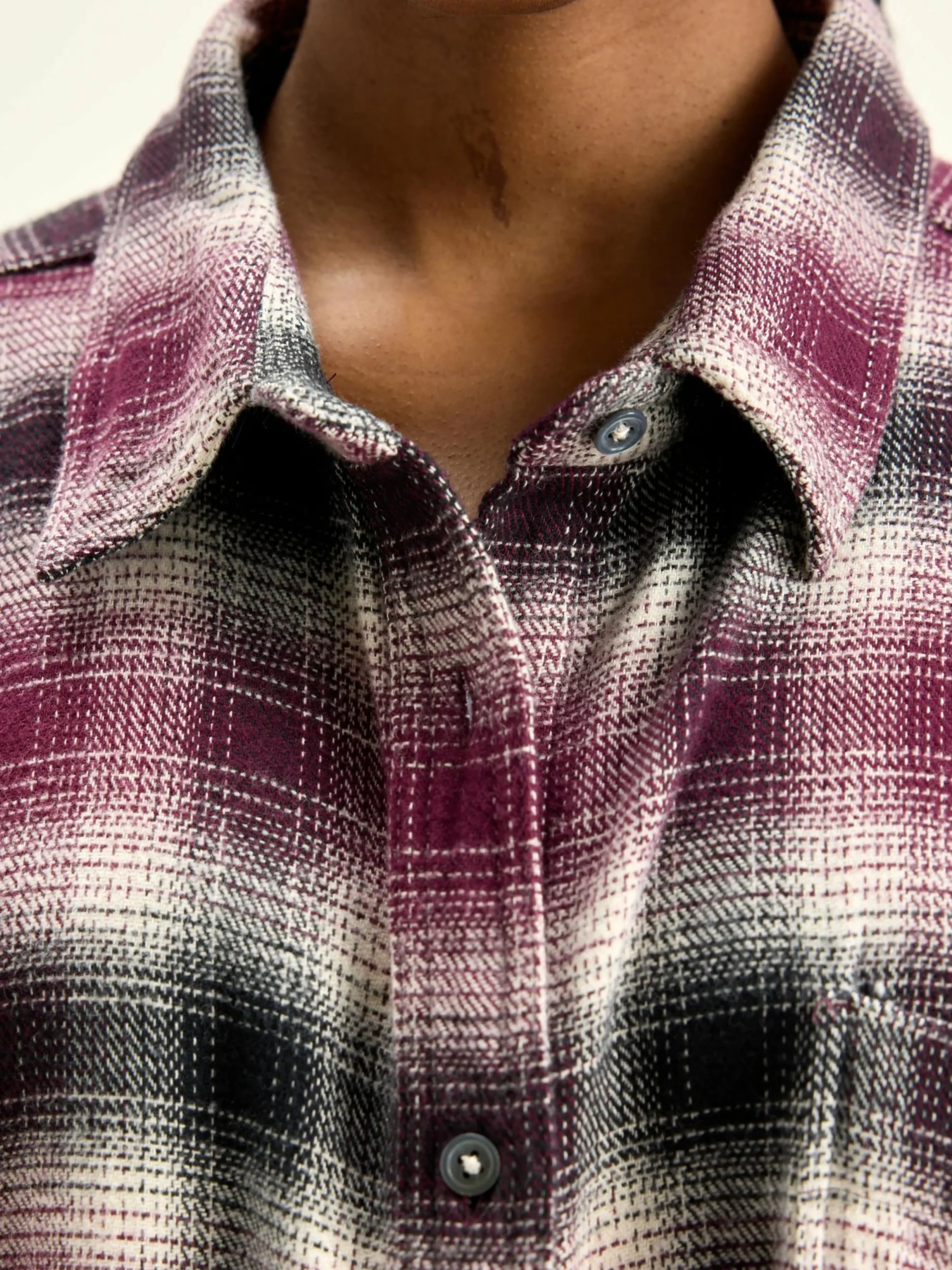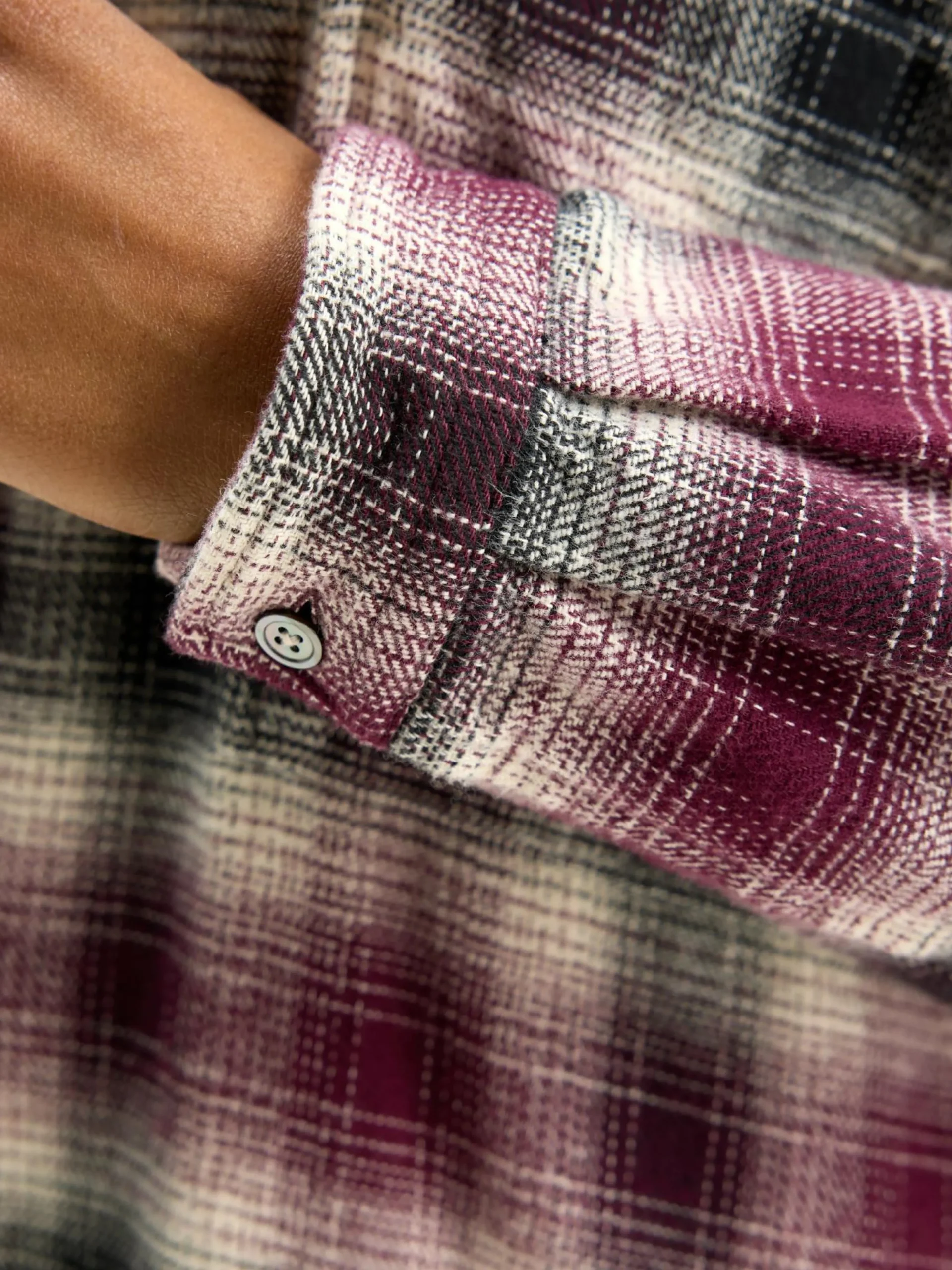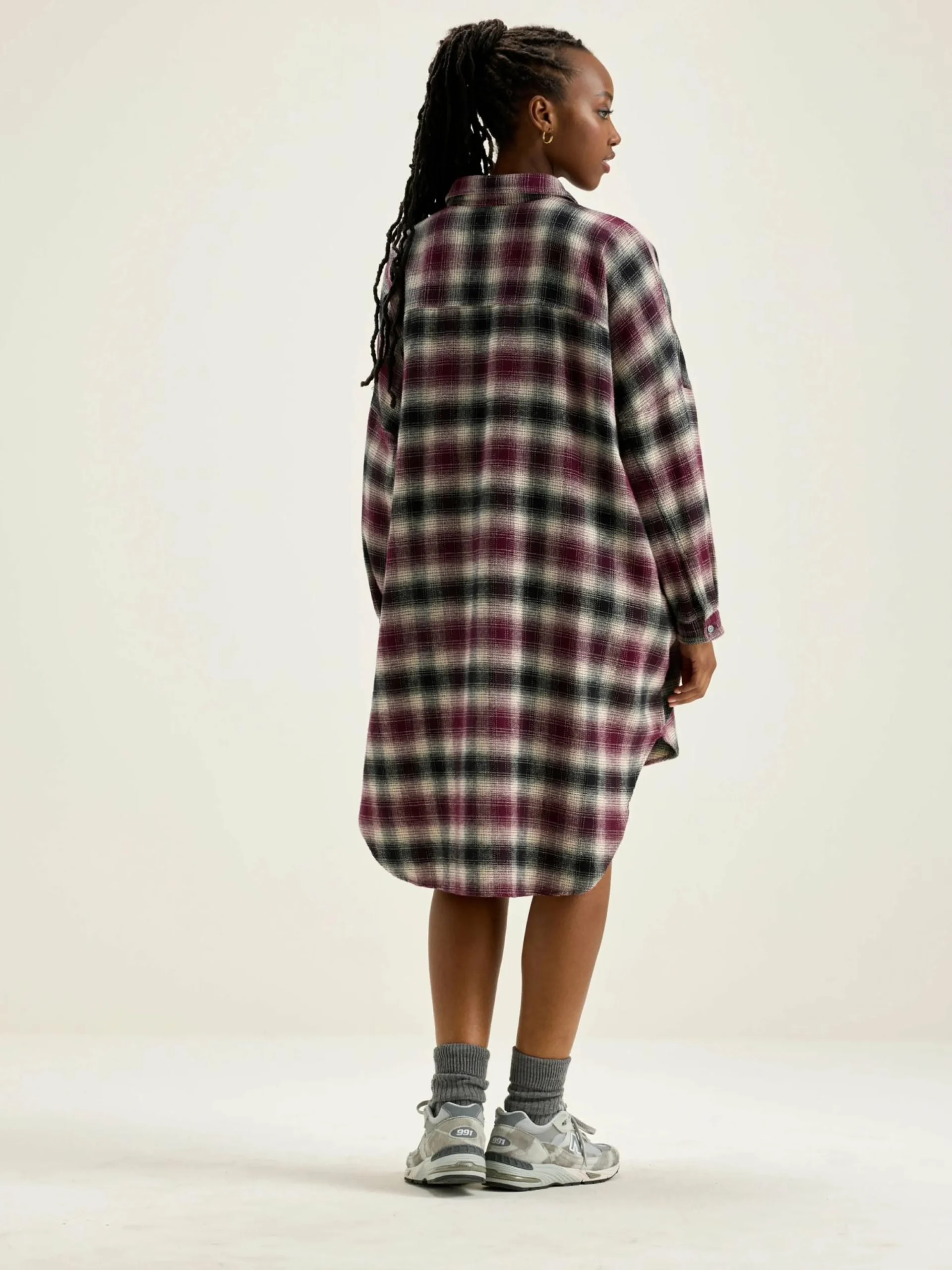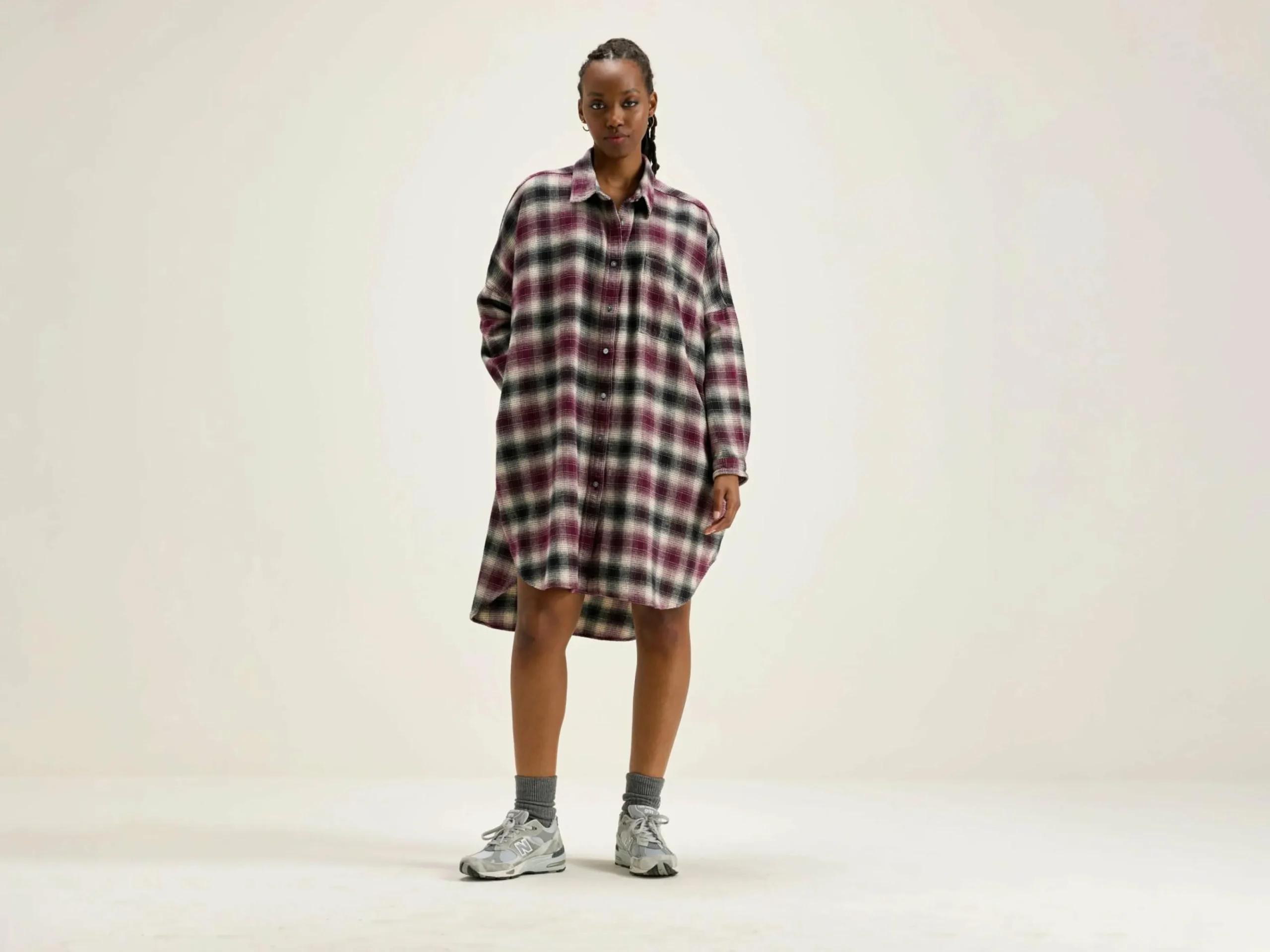 Oversizede hemdjurk van geborsteld katoen, met wijnrood, zwart en lichtbeige ruitpatroon met schaduw.