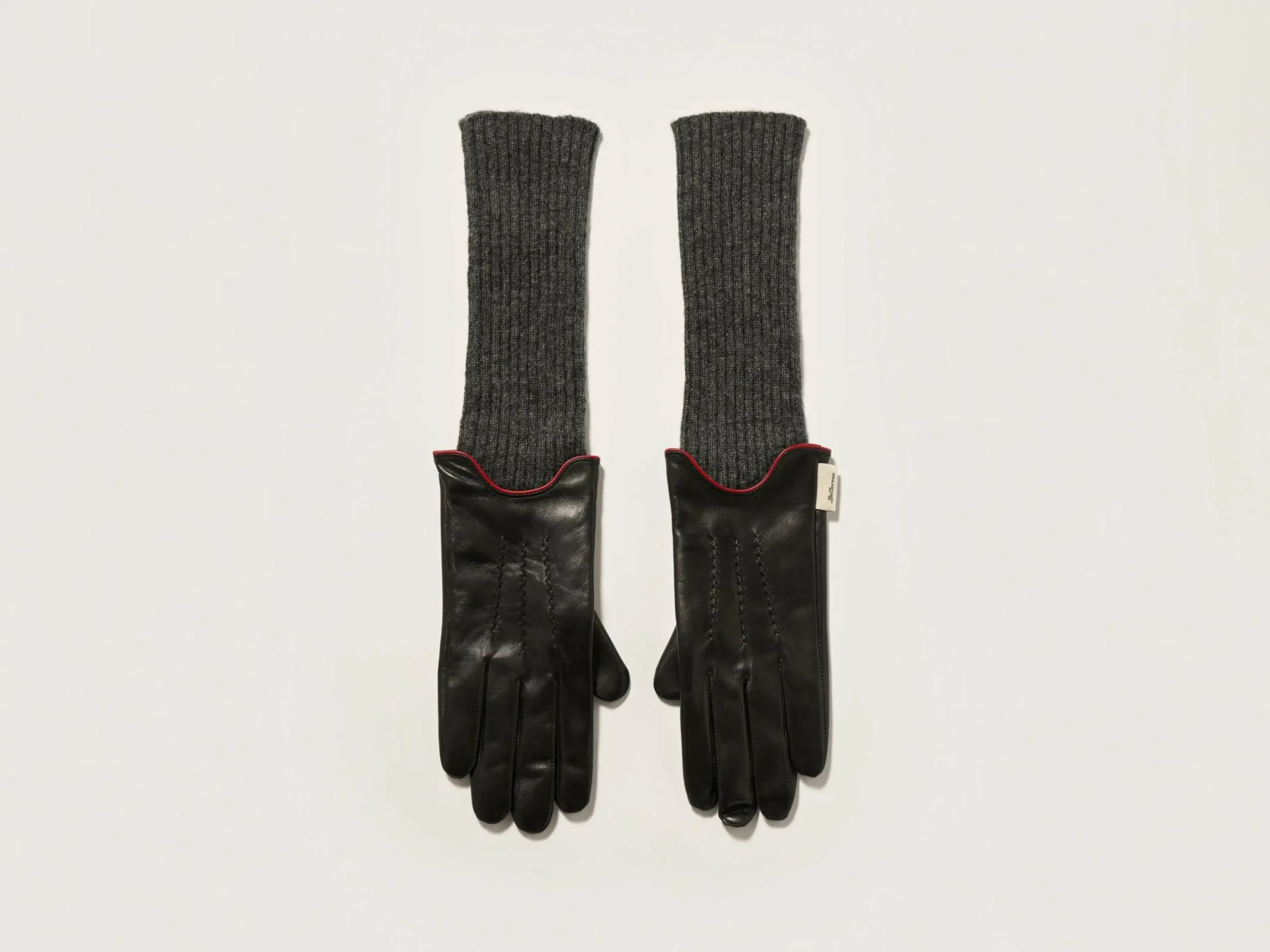 Zwartleren handschoen met grijze ribgebreide polsen.