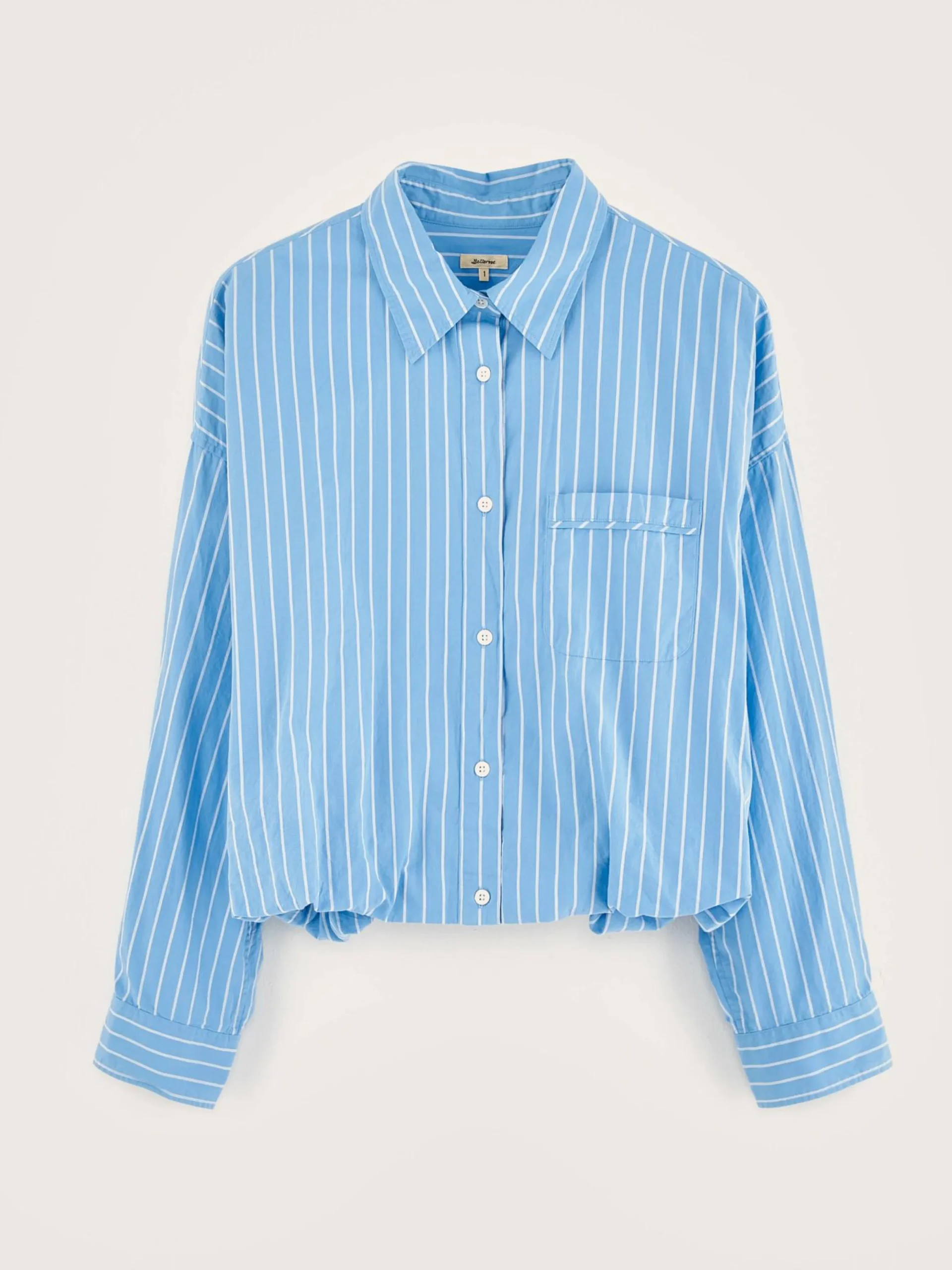 Volumineus overhemdvan gestreept katoen en linnen, met twee lagen.