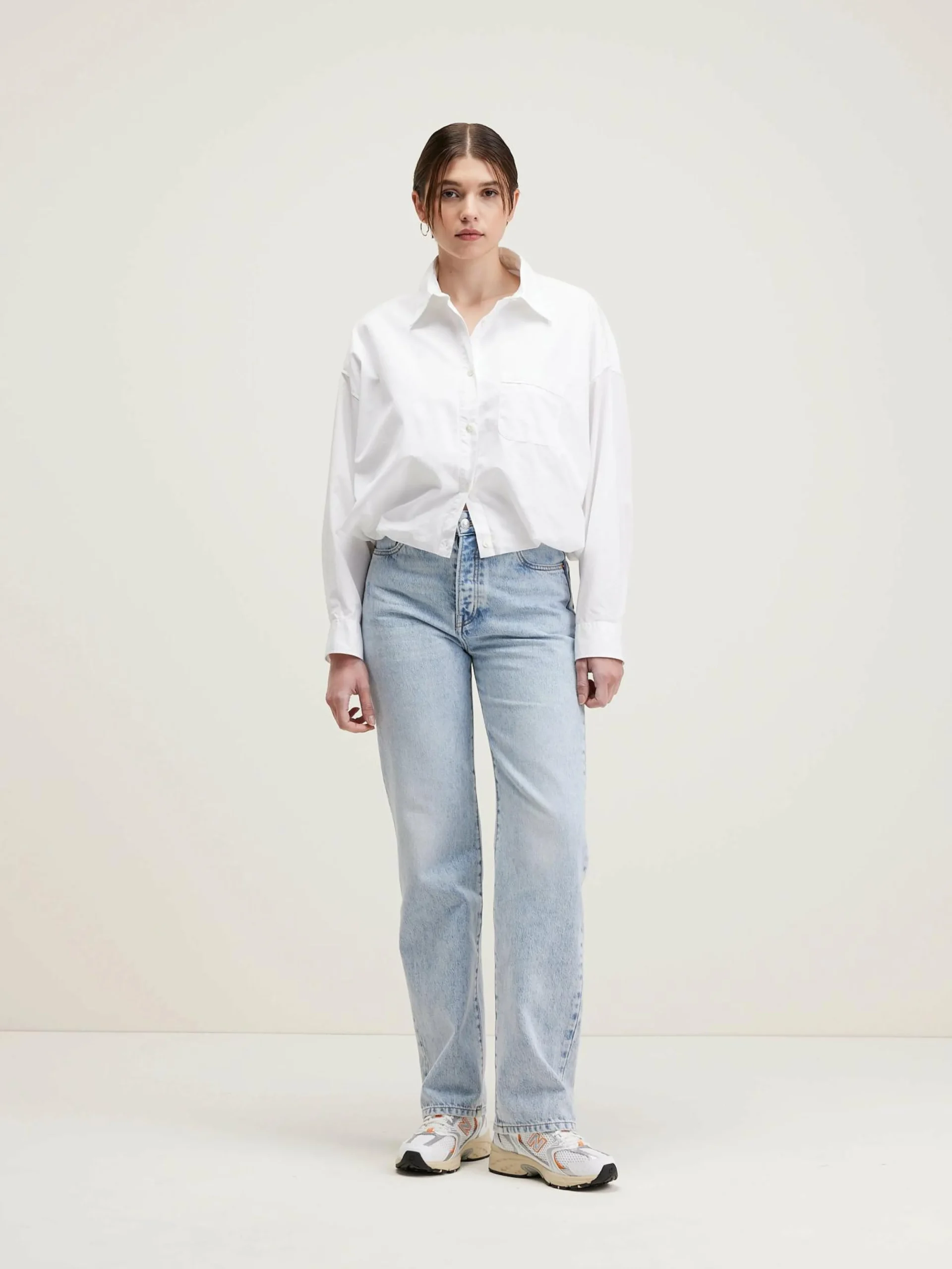 Volumineus overhemd van wit katoenpopeline met twee lagen.