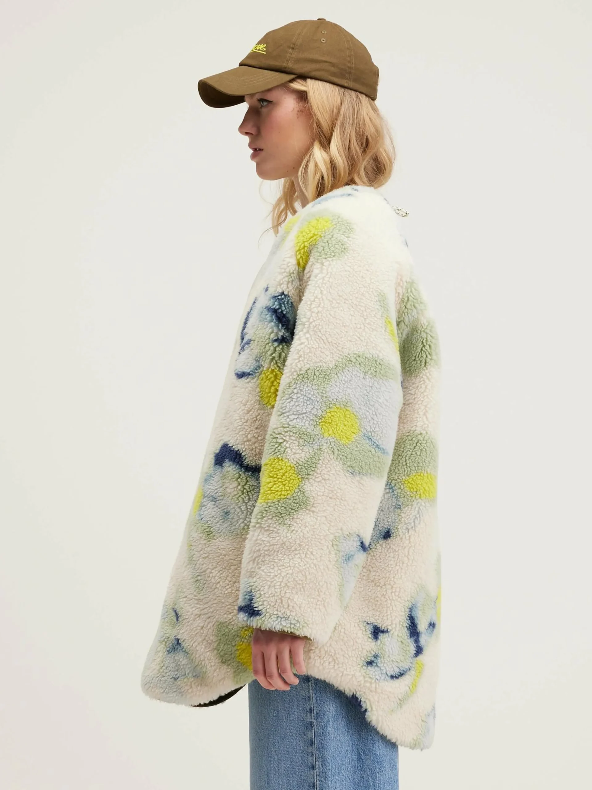 Omkeerbare en oversizede blauwe gewatteerd jas met bloemenprint en teddyvoering.