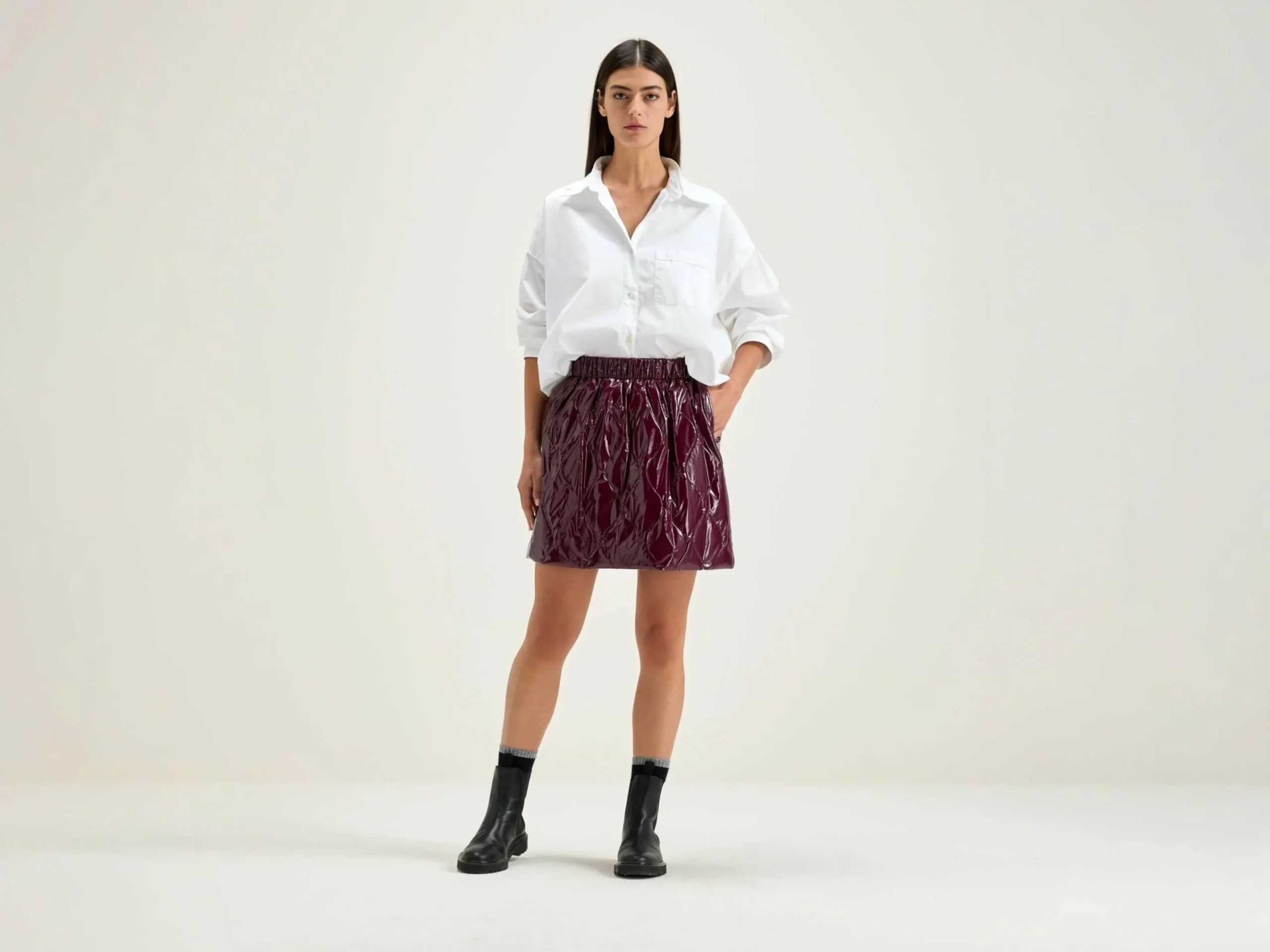 Gewatteerde minirok met elastische taille, van glanzende bordeaux ripstop stof.