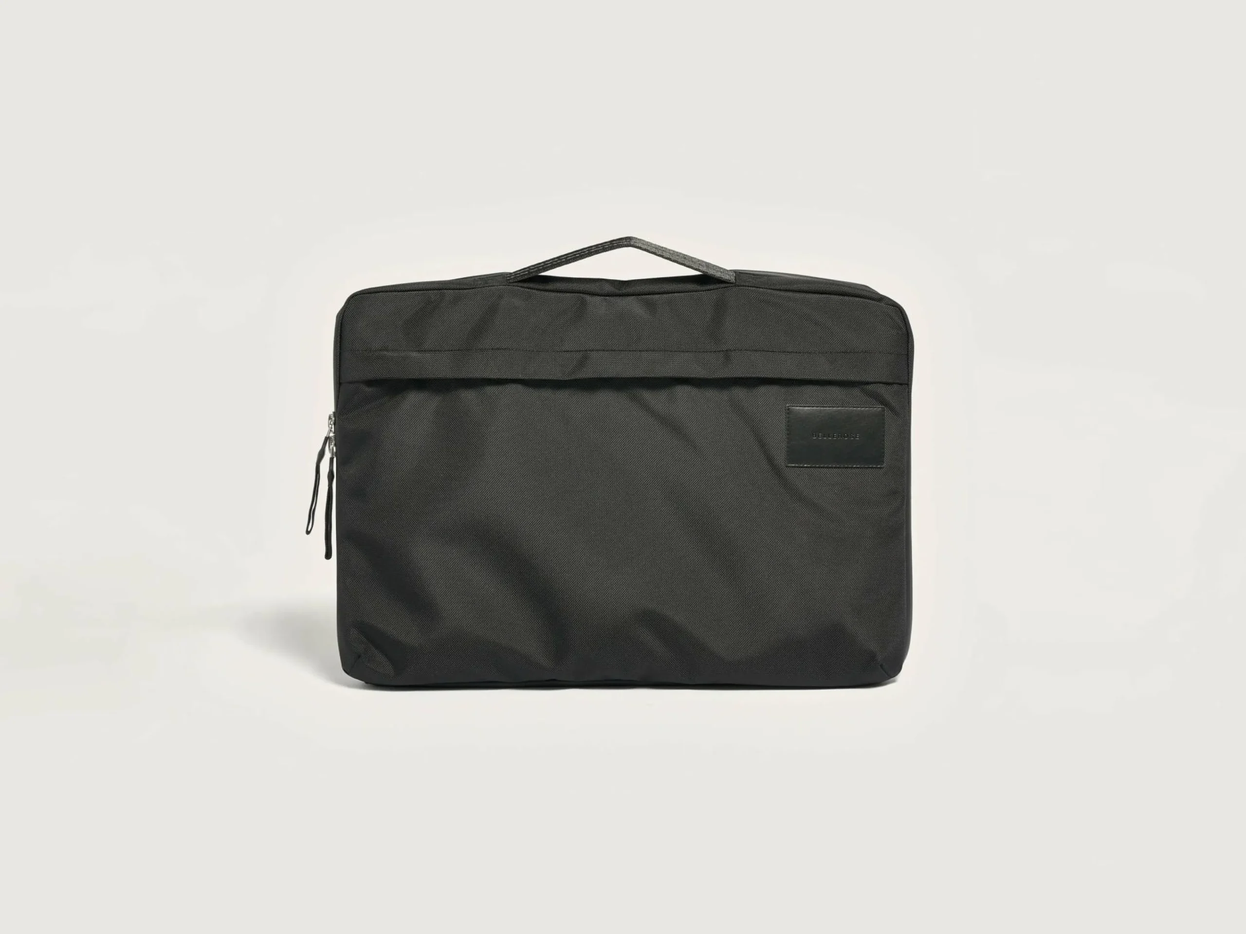 Laptoptas van zwart gecoat nylon met ritssluiting bovenaan, een zijtas met ritssluiting voor telefoonlader en kabel, en een handvat bovenaan.