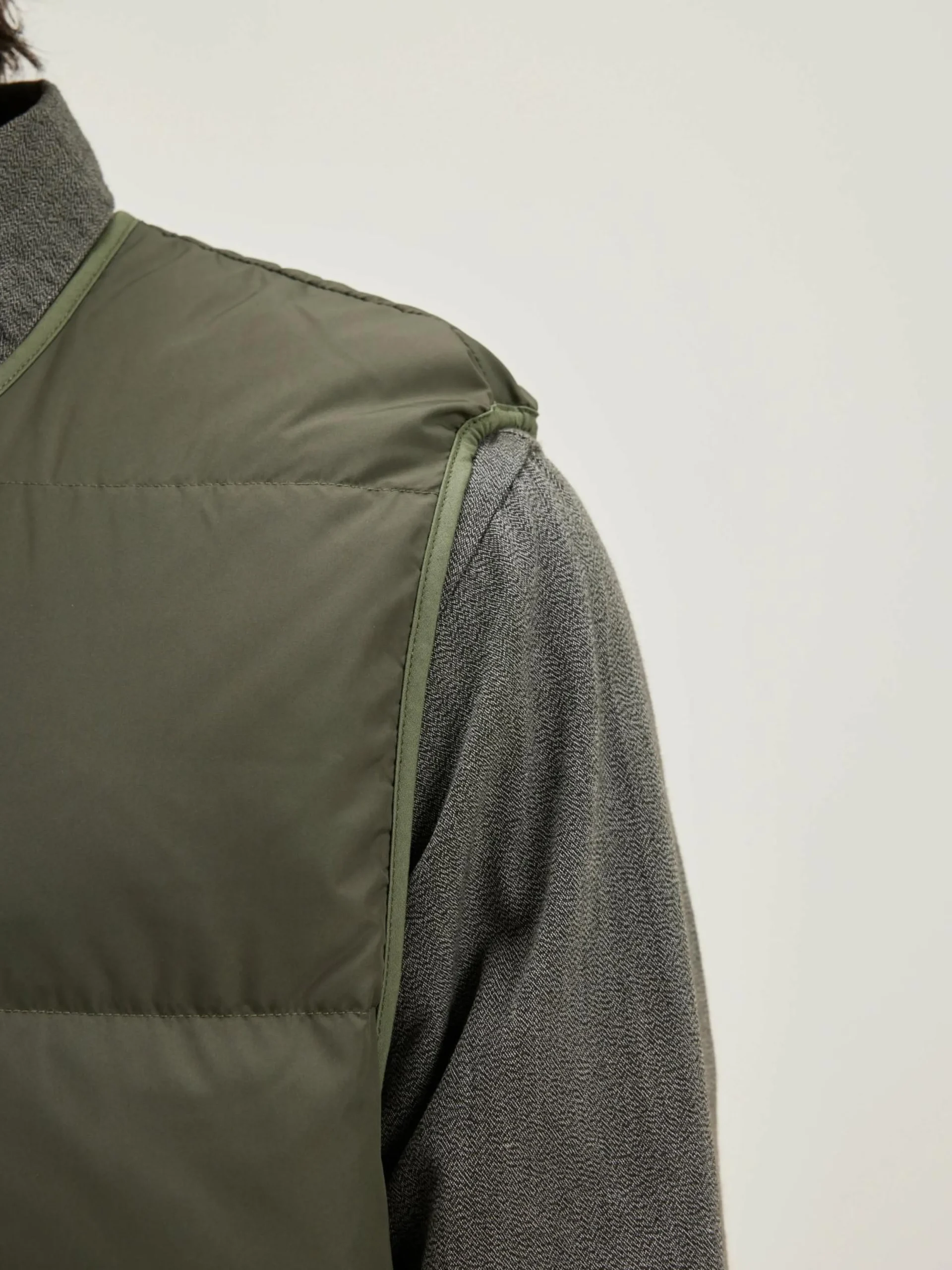 Omkeerbare bodywarmer met rits in donker olijfkleurig gewatteerd polyester.