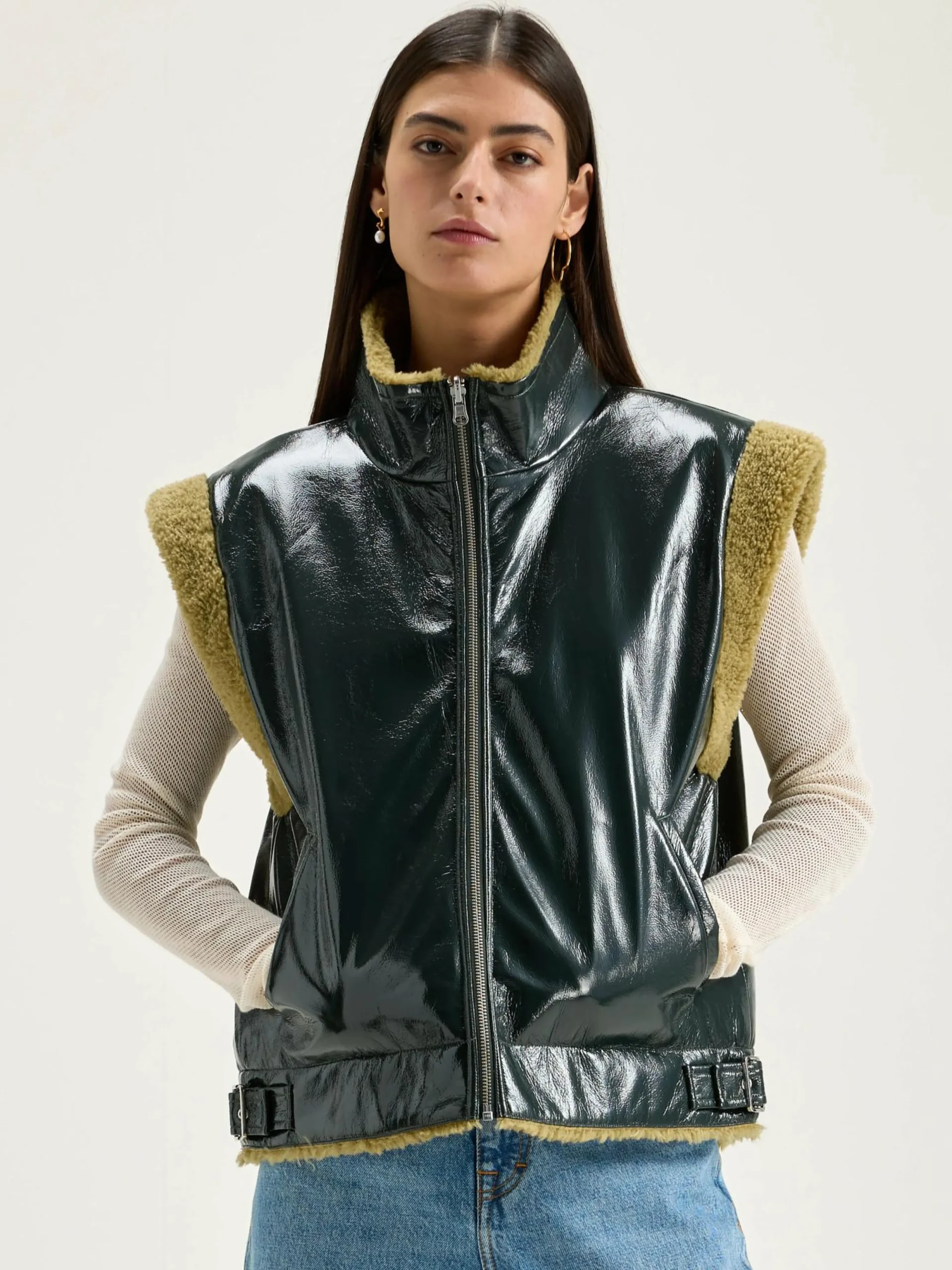 Mouwloze bodywarmer met een ritssluiting vooraan, van grijs imitatieleer en een voering van teddystof.