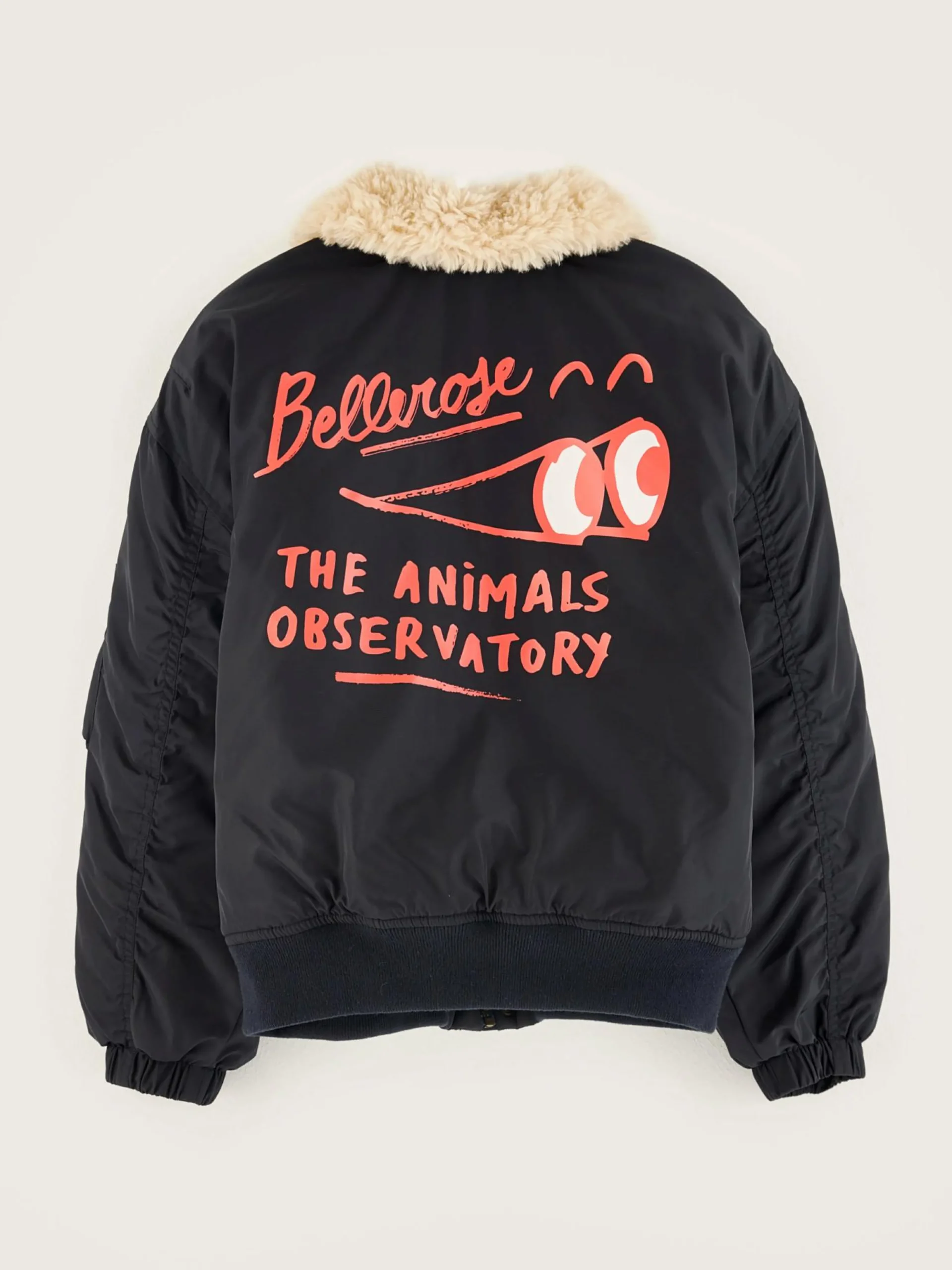 Klassieke jas in pilotenstijl, met kraag van teddystof, verborgen ritssluiting vooraan, afgewerkt met een contrasterende Bellerose X The Animal Observatory-print op de borst.