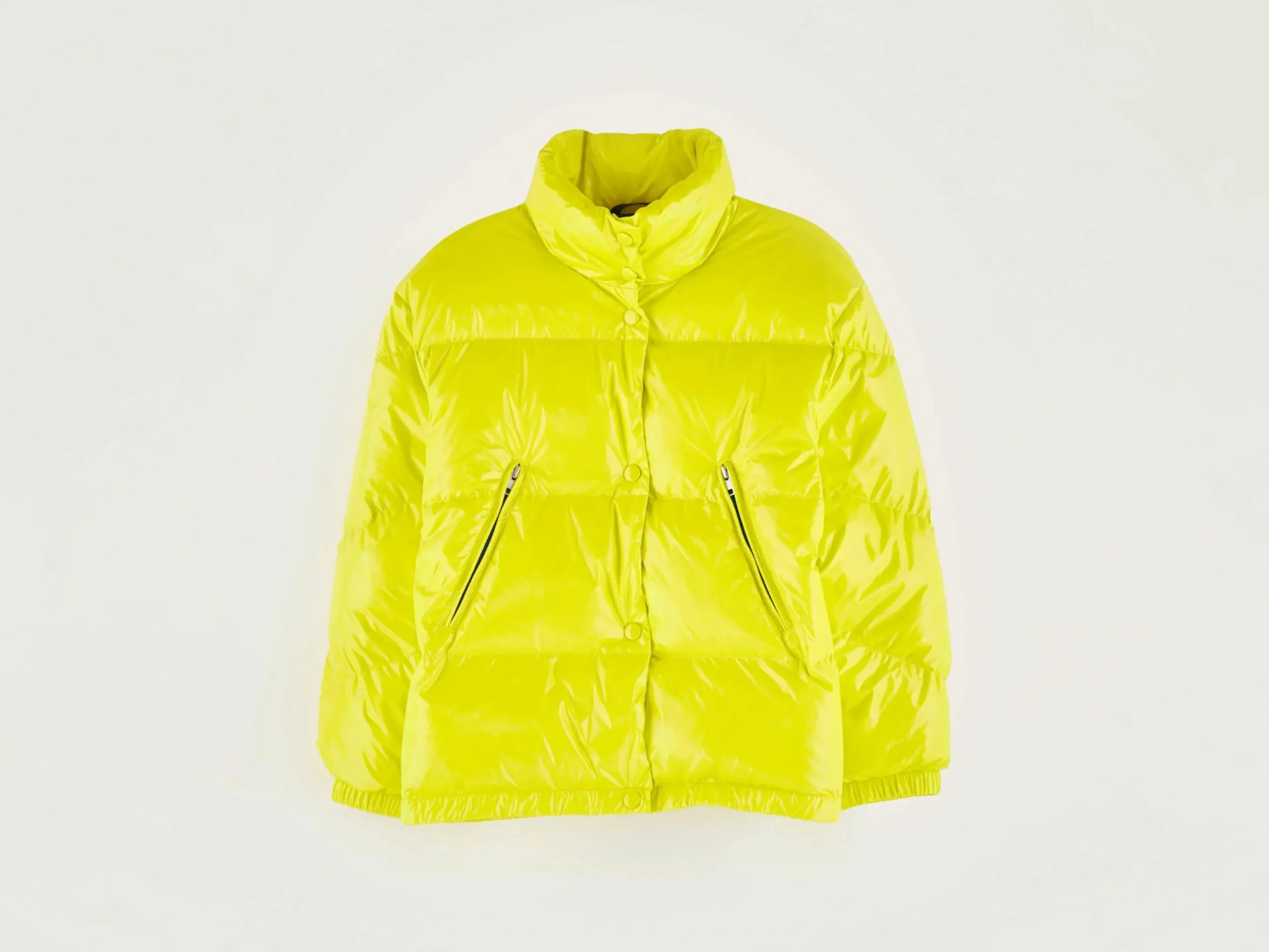 Gloeiend gele pufferjas met ritssluiting vooraan, aanpasbare lengte dankzij drukknopen.