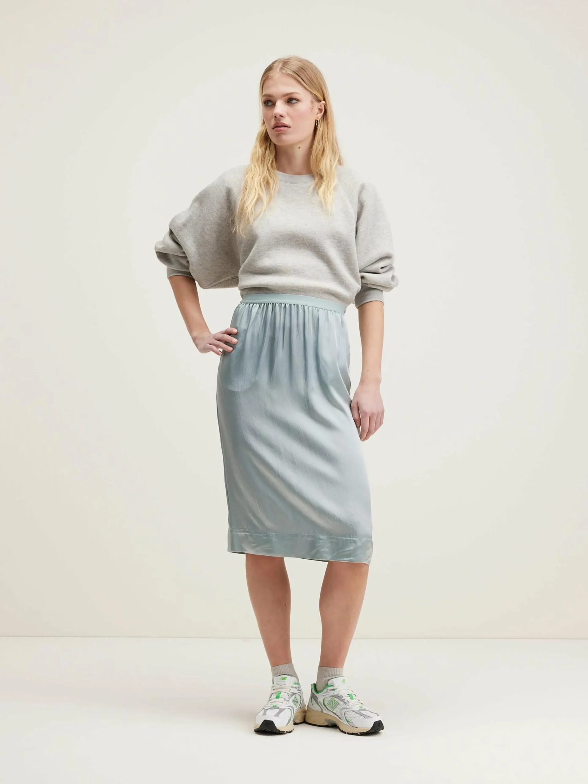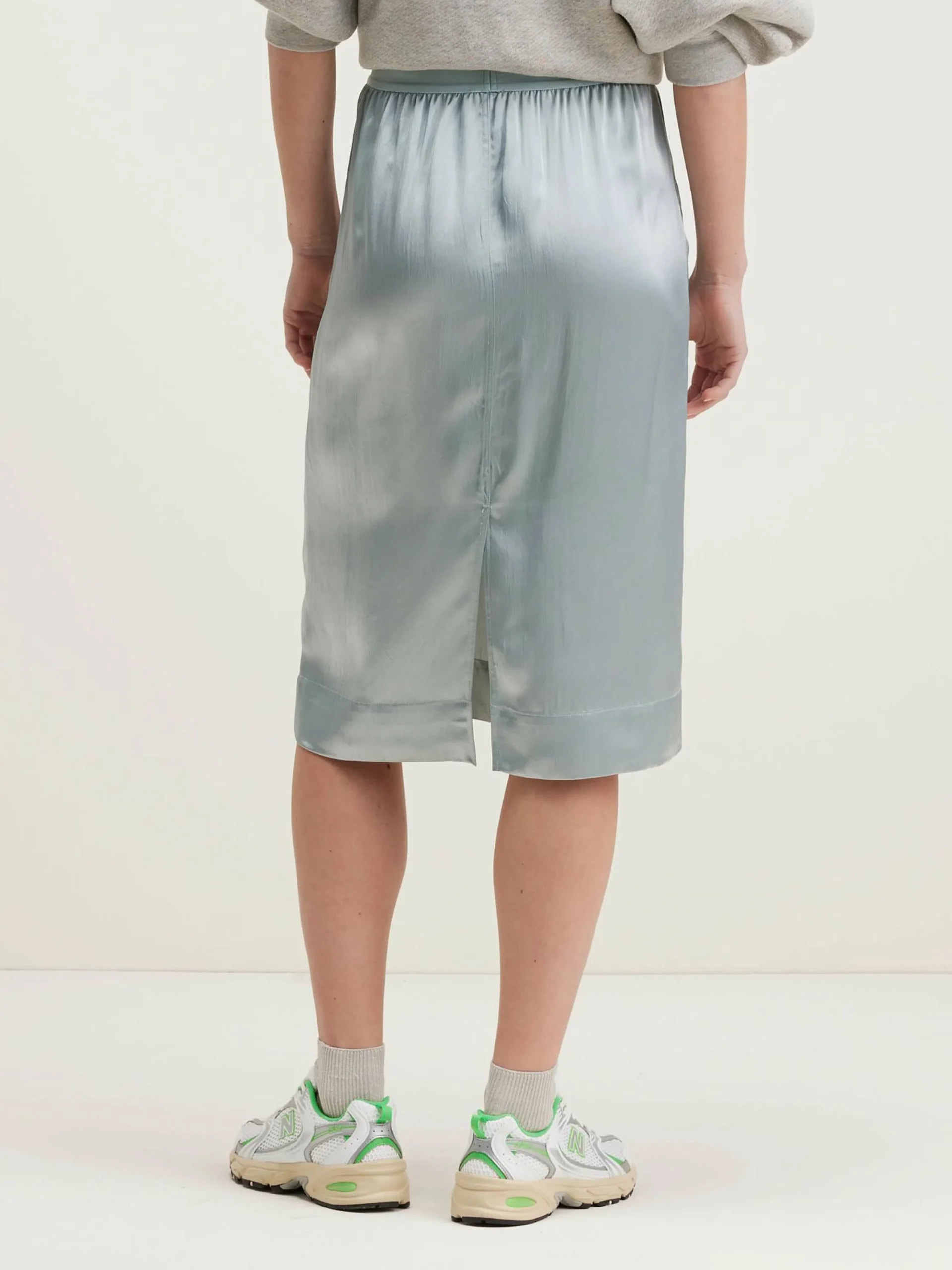 Lichtblauwe midi kokerrok met satijnen finish.