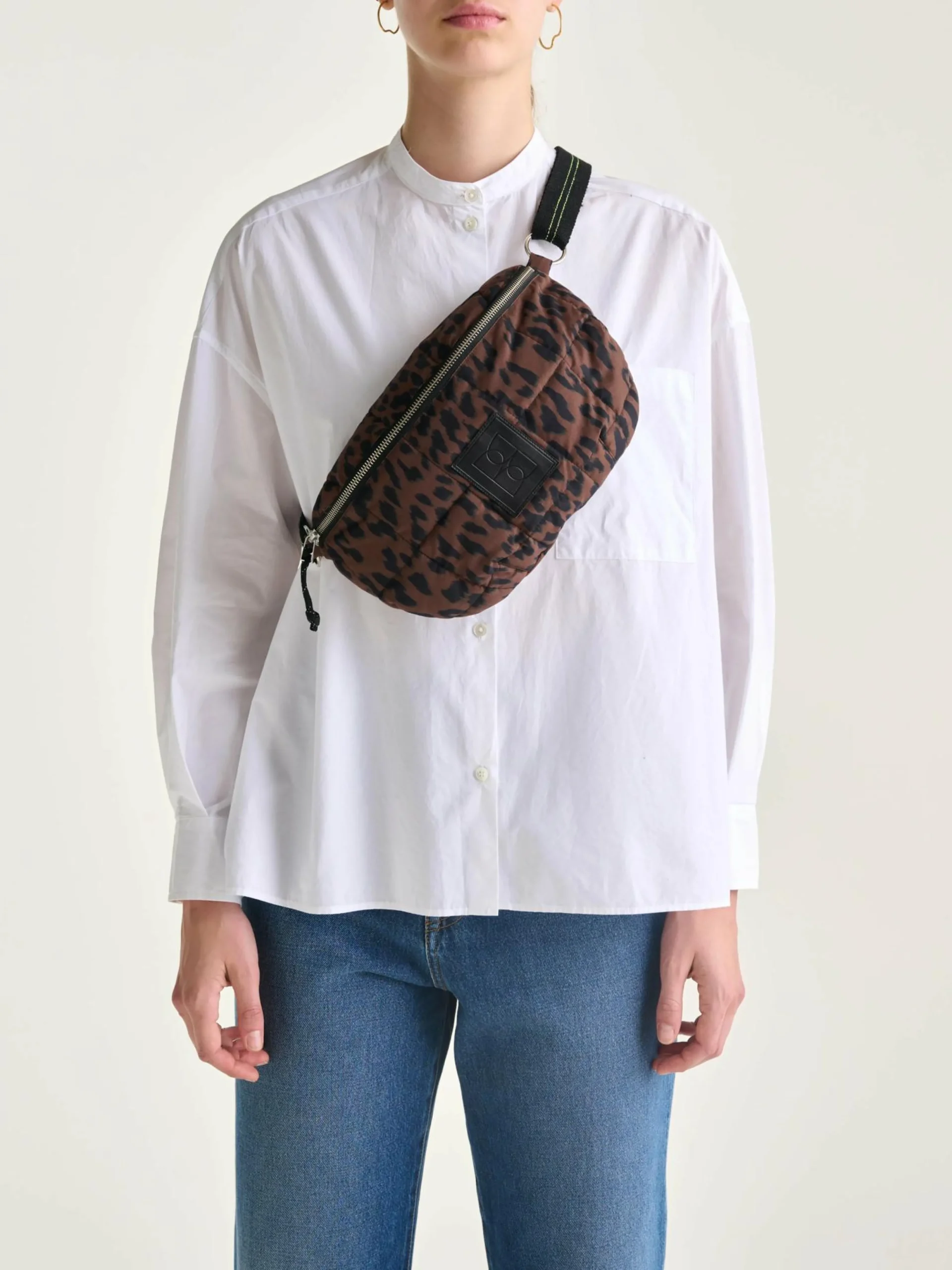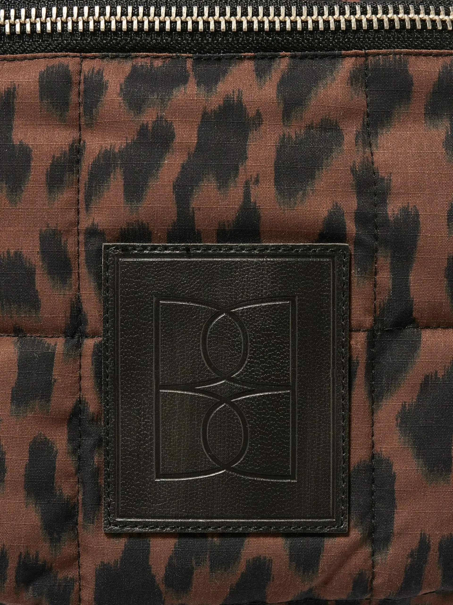 Heuptas met rits vooraan, van gewatteerde ripstop met luipaardprint.