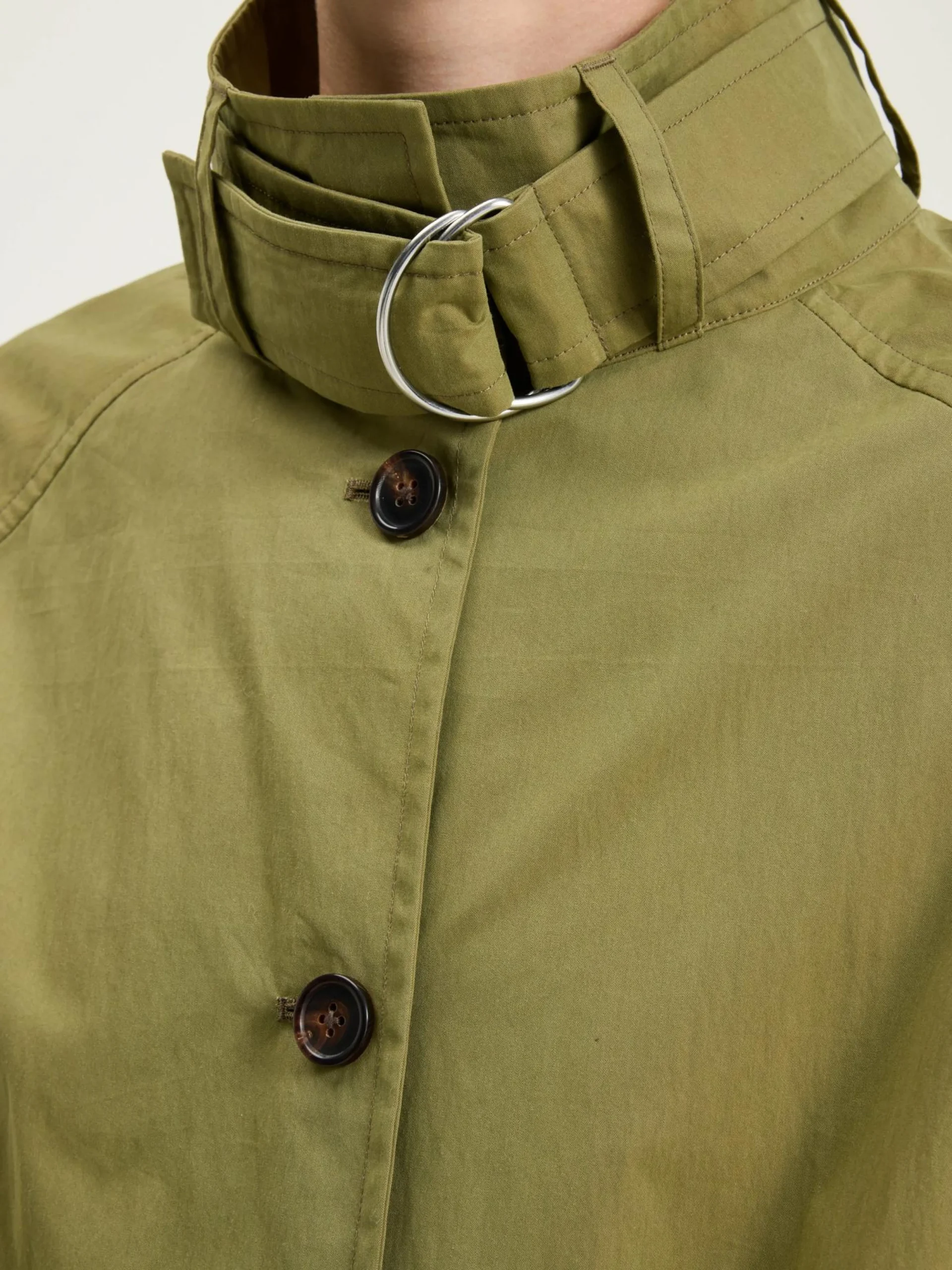 Korte, donkergroene oversizede jas in trenchcoatstijl.