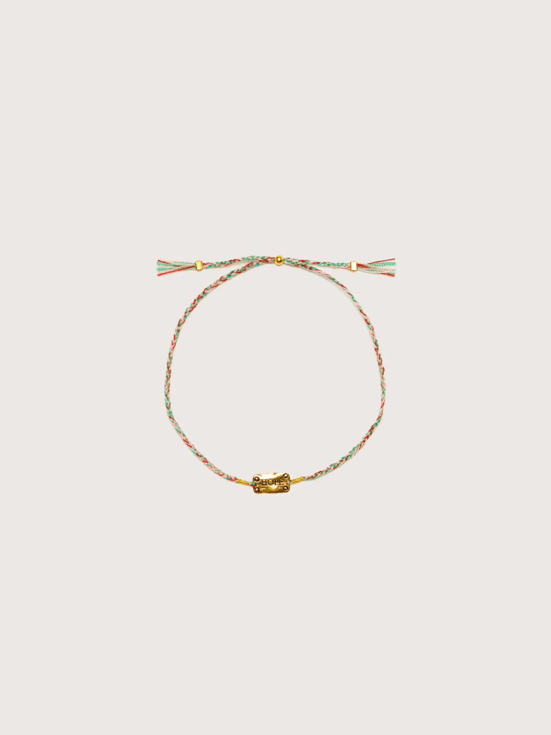 De Hope armband is een handgemaakte, verstelbare vlecht van fijn koord versierd met een vergulde “Hope” bedel.