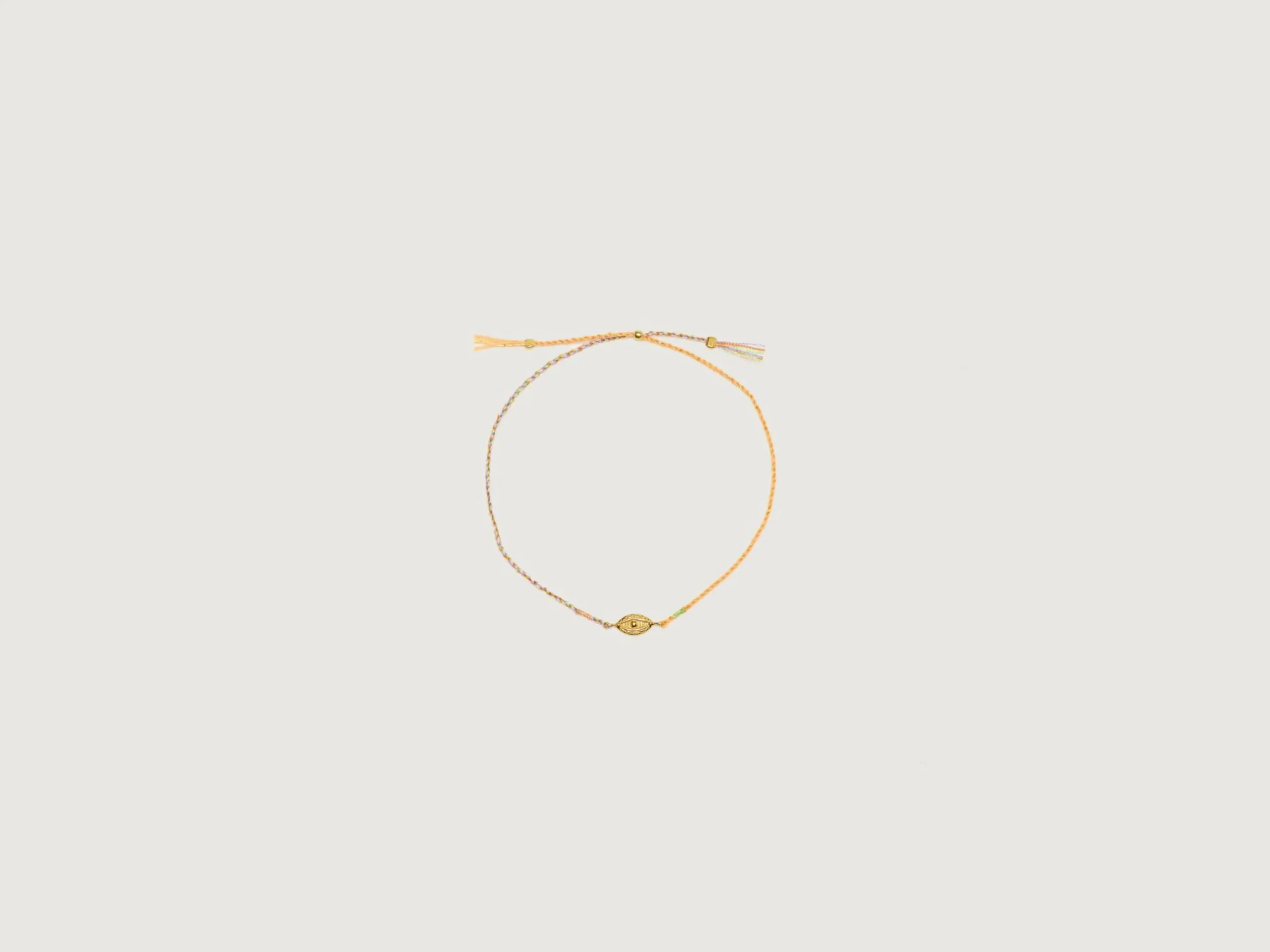 De Ojo armband is een handgemaakte, verstelbare vlecht van fijn koord versierd met een vergulde bedel.