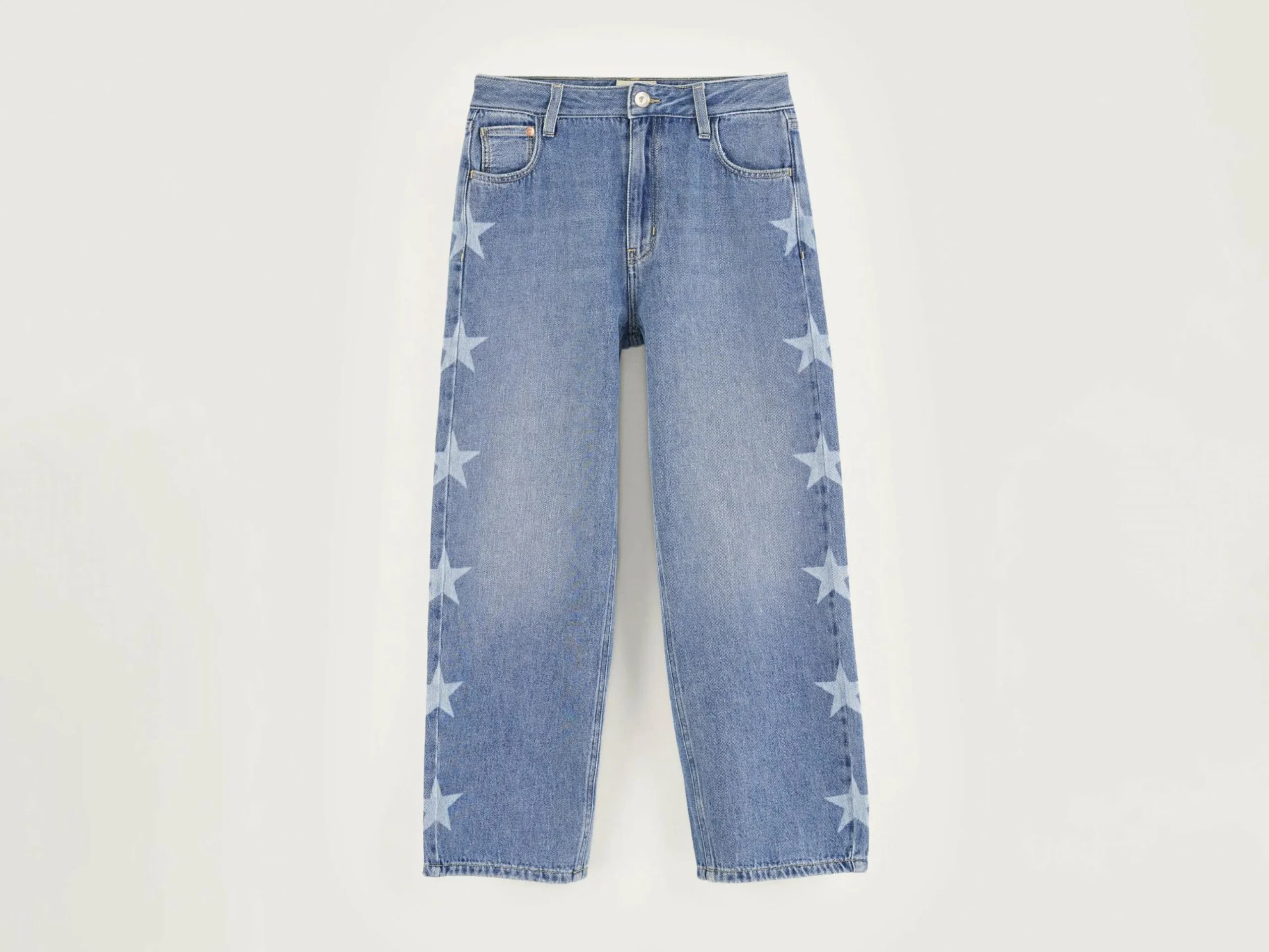 Comfortabele jeans met lage taille, in middenblauw met gelaserprinte sterren.