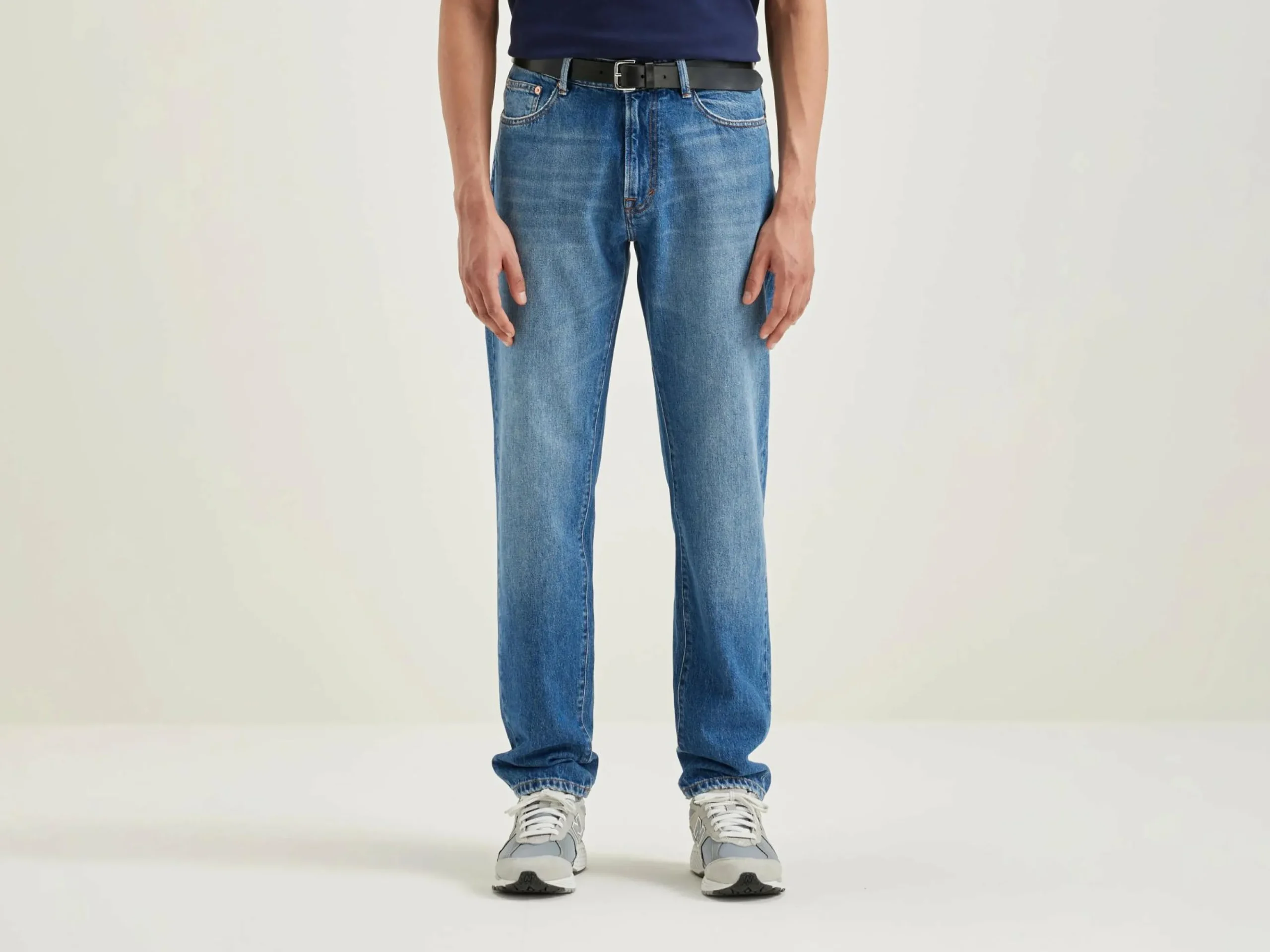 Regular fit jeans met normale taille, van middenblauw gebleekt katoendenim.