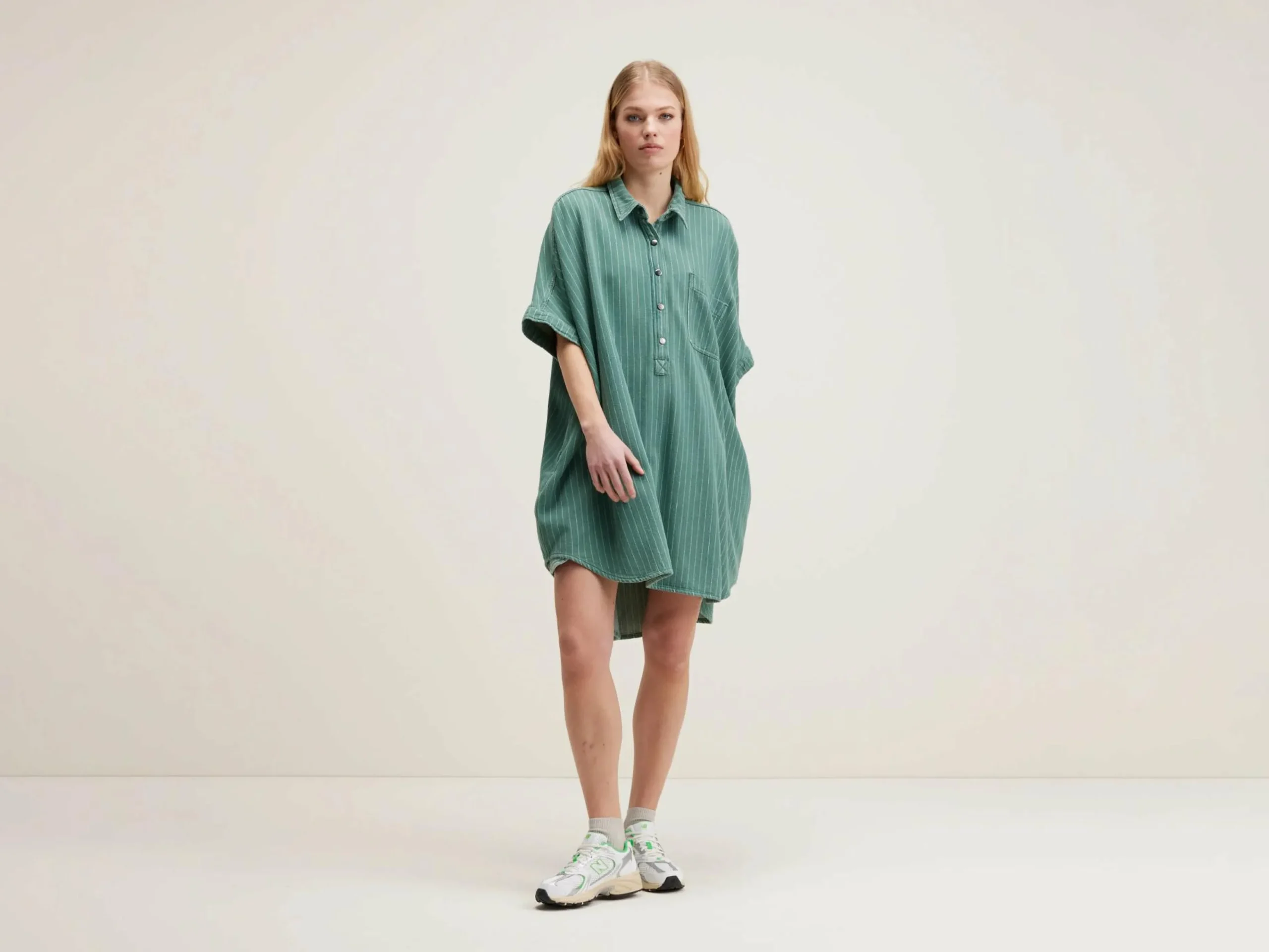 Oversizede hemdjurk van gestreept, licht stonewashed denim.