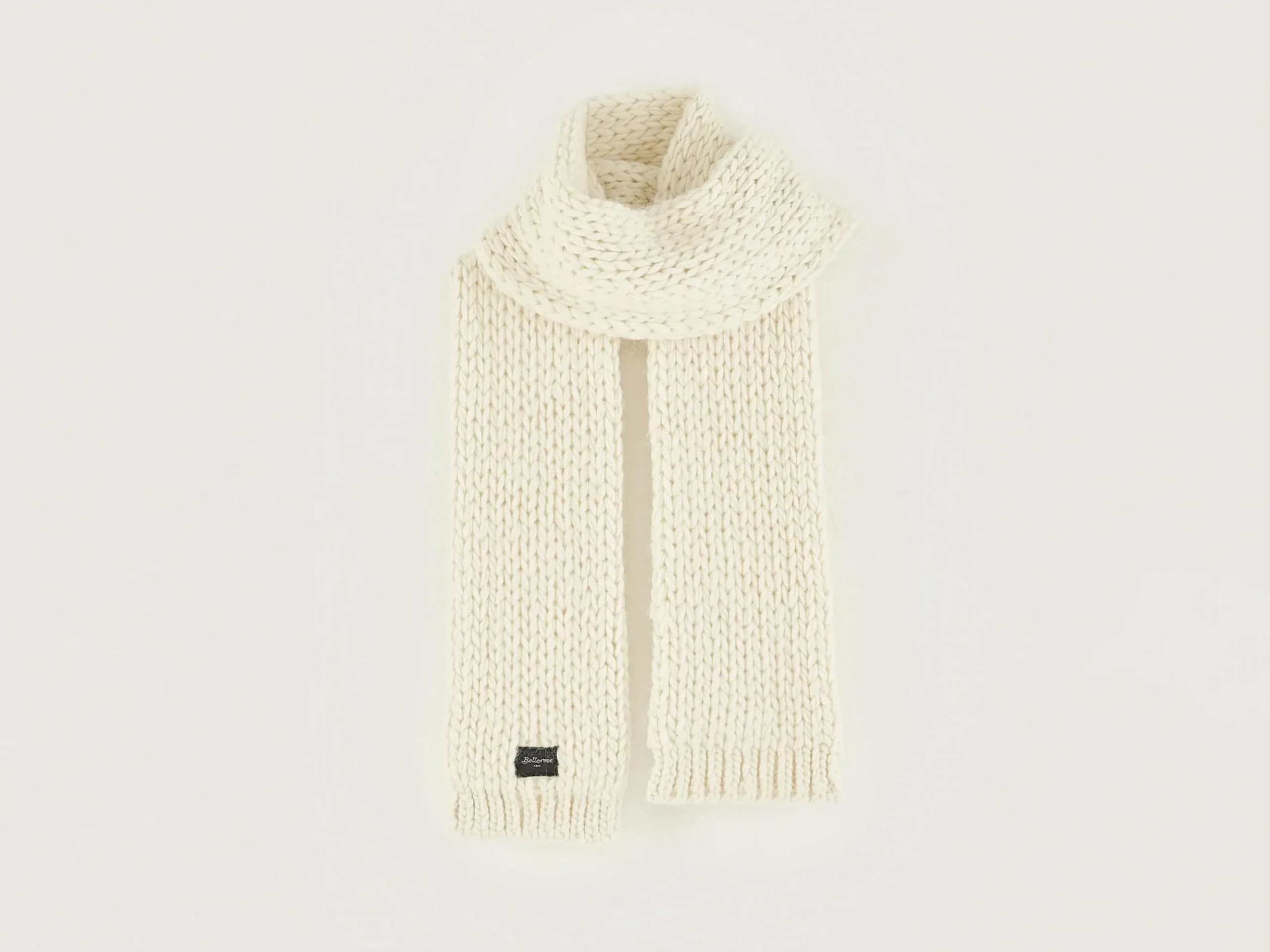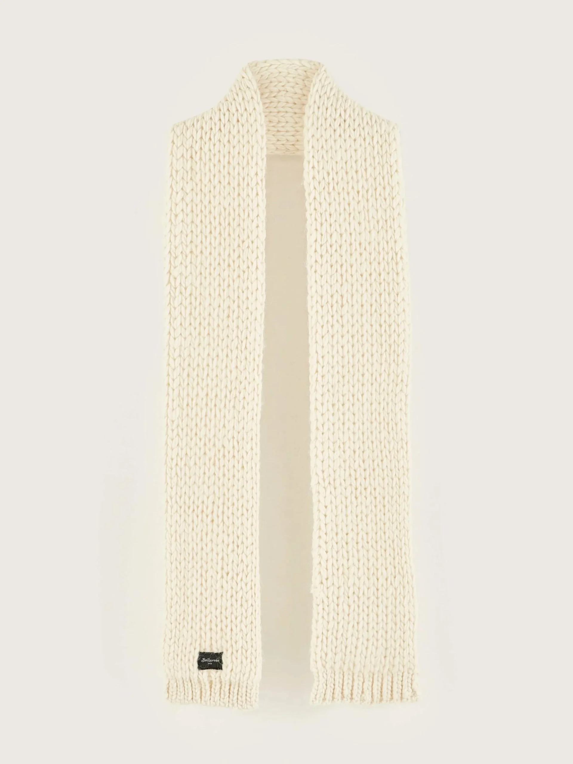 Ivoorwitte, jersey gebreide sjaal met dik garen.