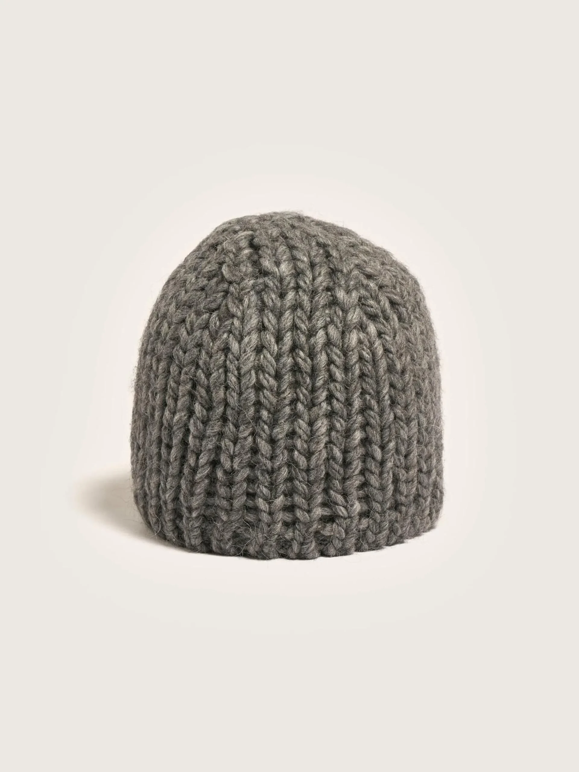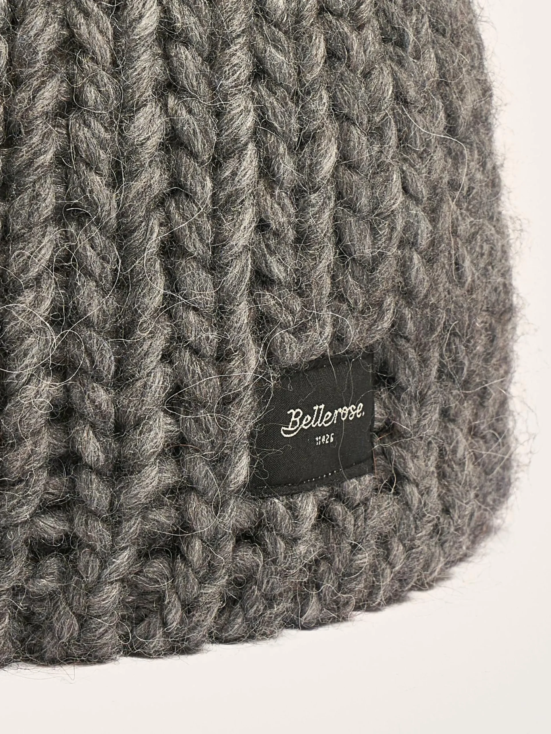 Middengrijze, gebreide muts van dik garen, met Bellerose-label op de voorkant.
