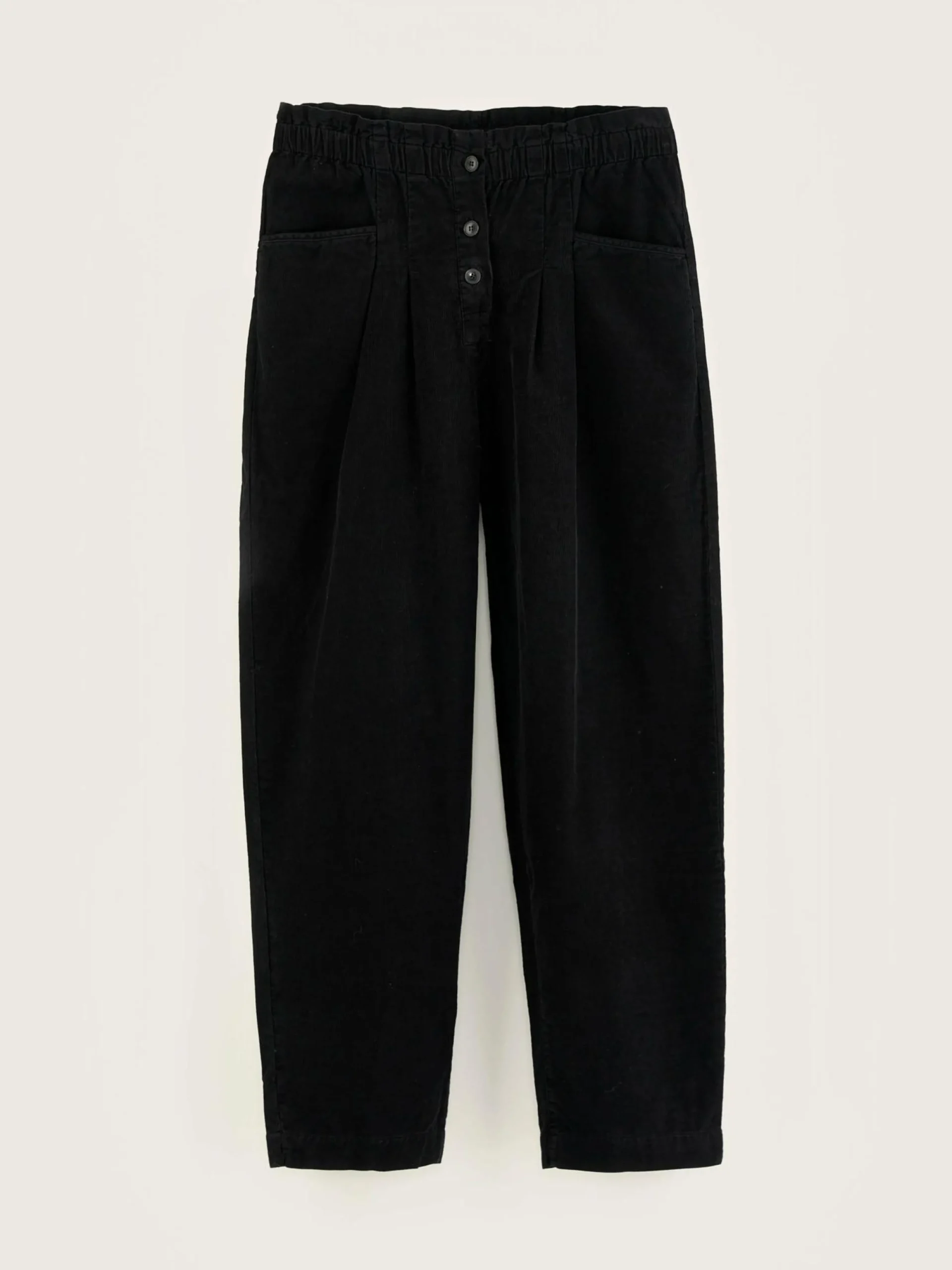 Zwart paperbagbroek van katoen- en linnencanvas, met ruimere, toelopende pijpen.