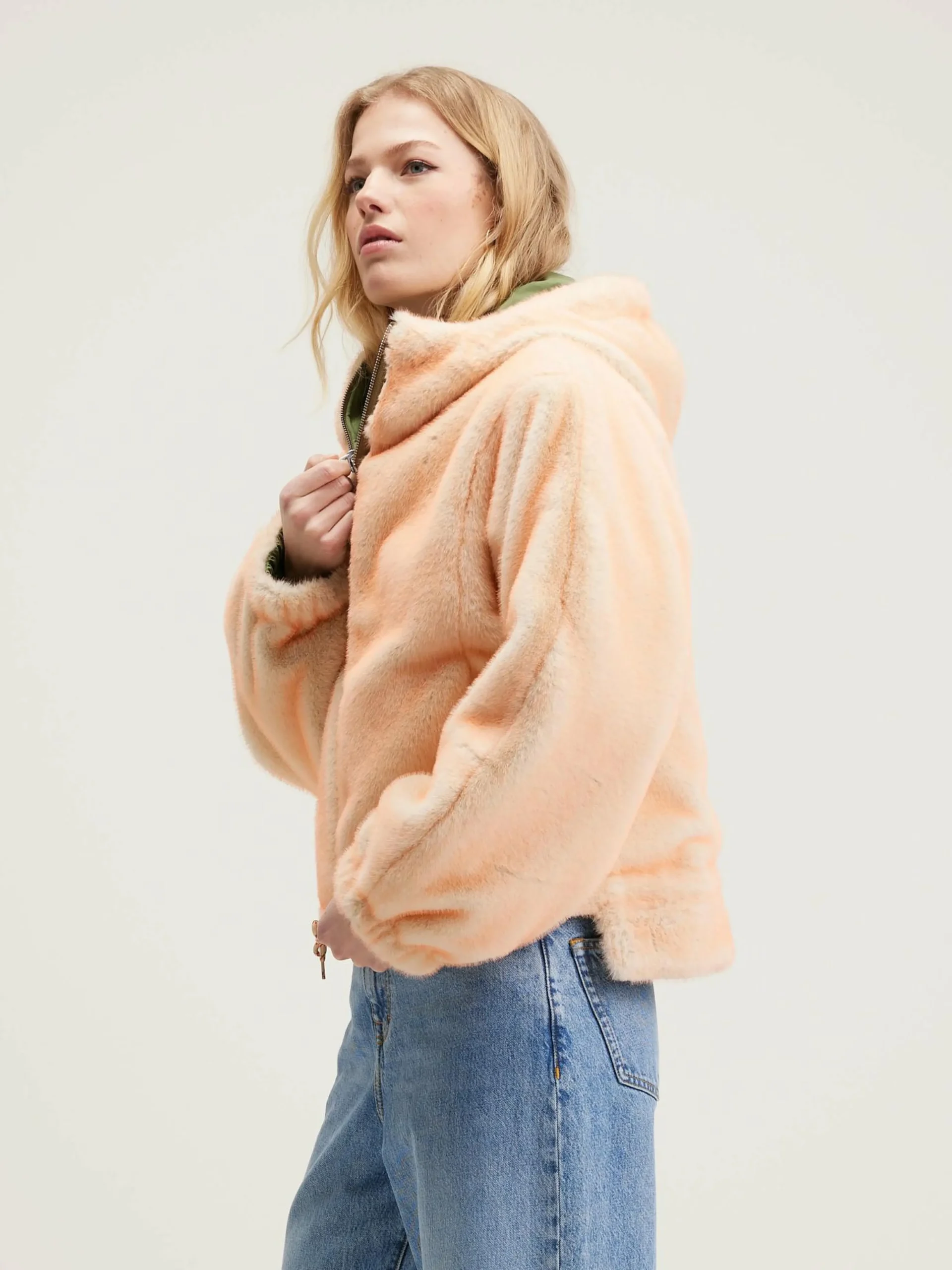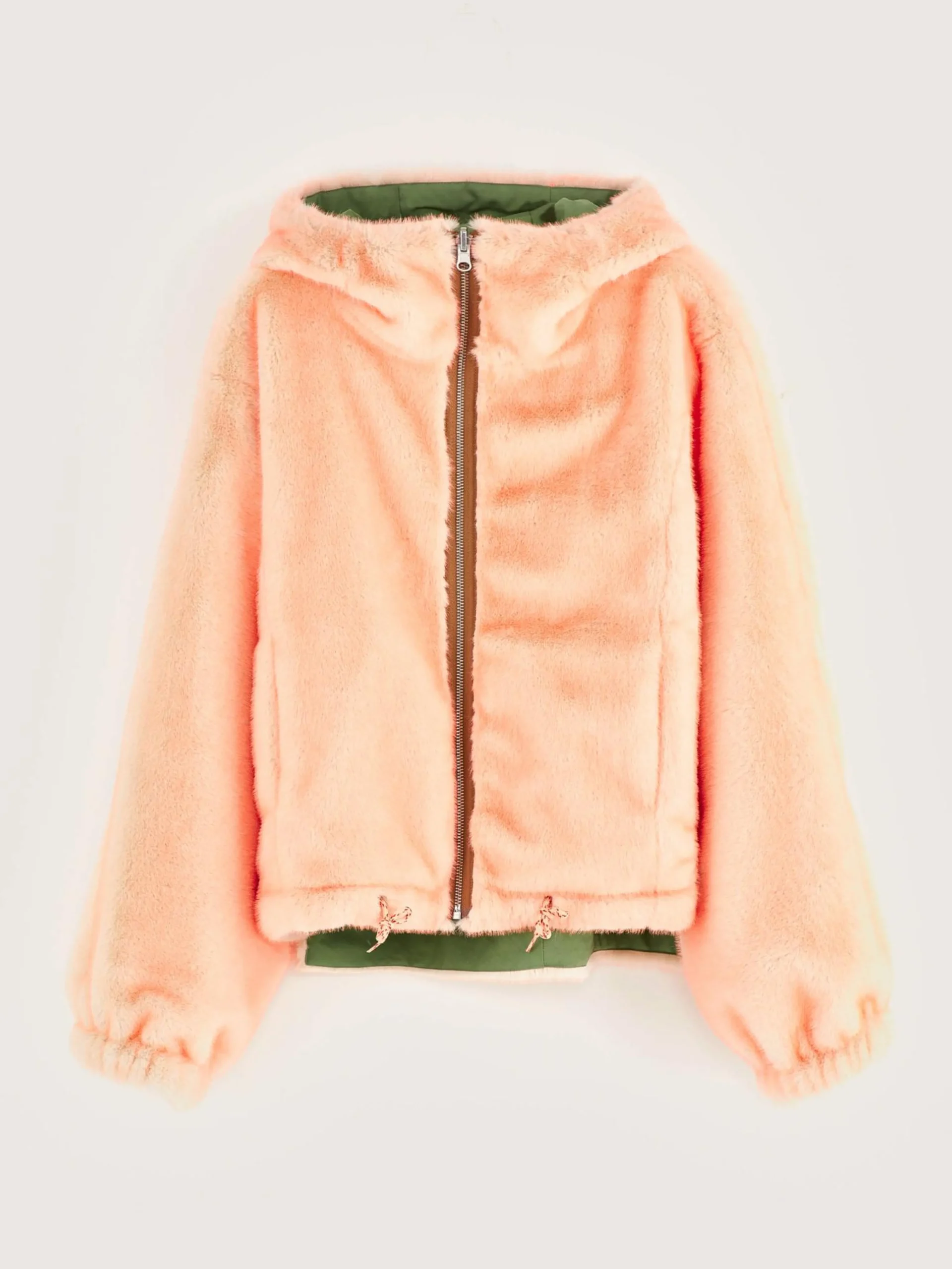 Omkeerbaar jasje met capuchon, van groen canvas met voering in nepbont.