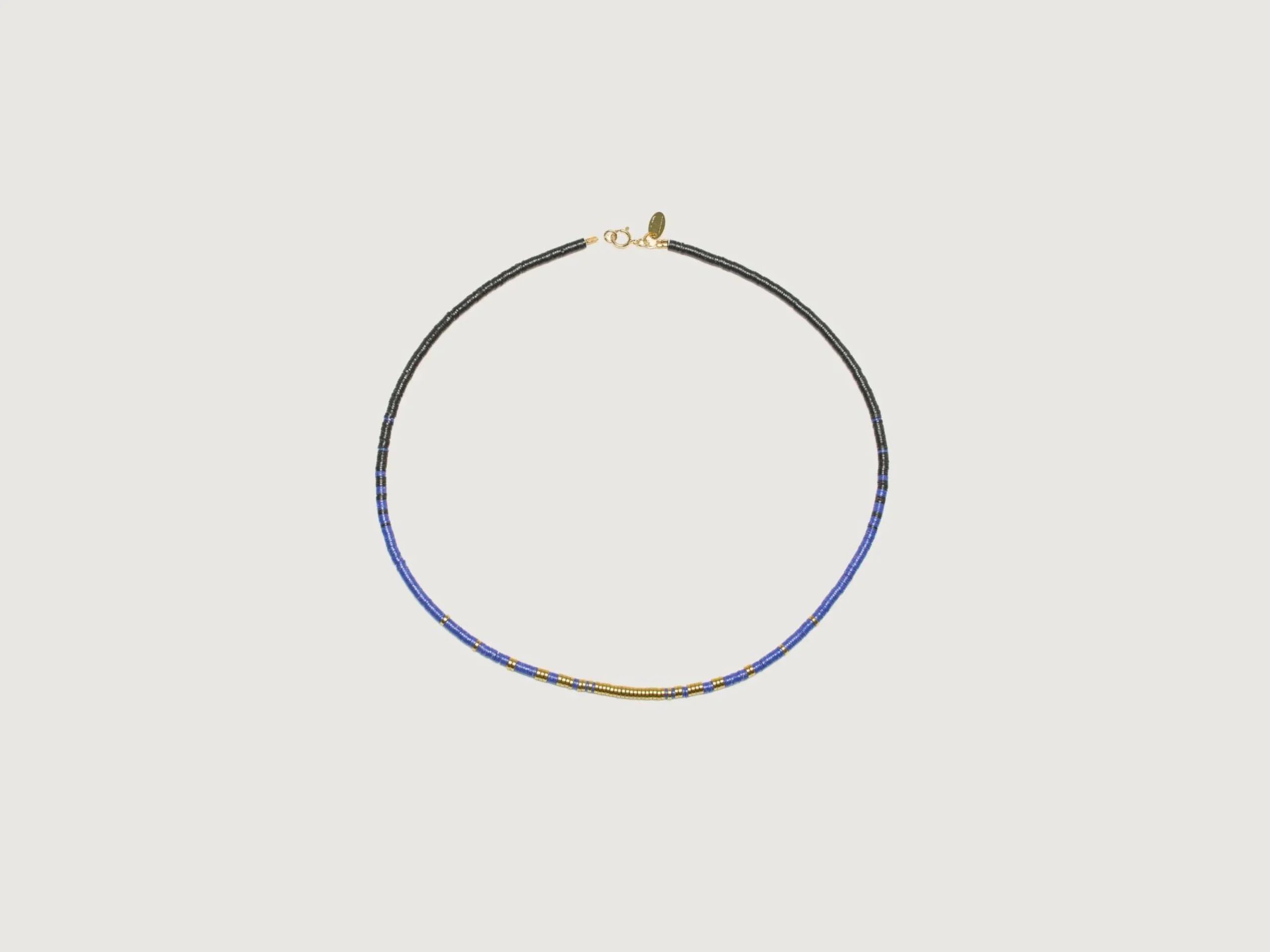 De Maison Mönik Indigo 3 handgemaakte ketting is gemaakt van gerecycled Ghanees vinyl en metallic hematietkralen.