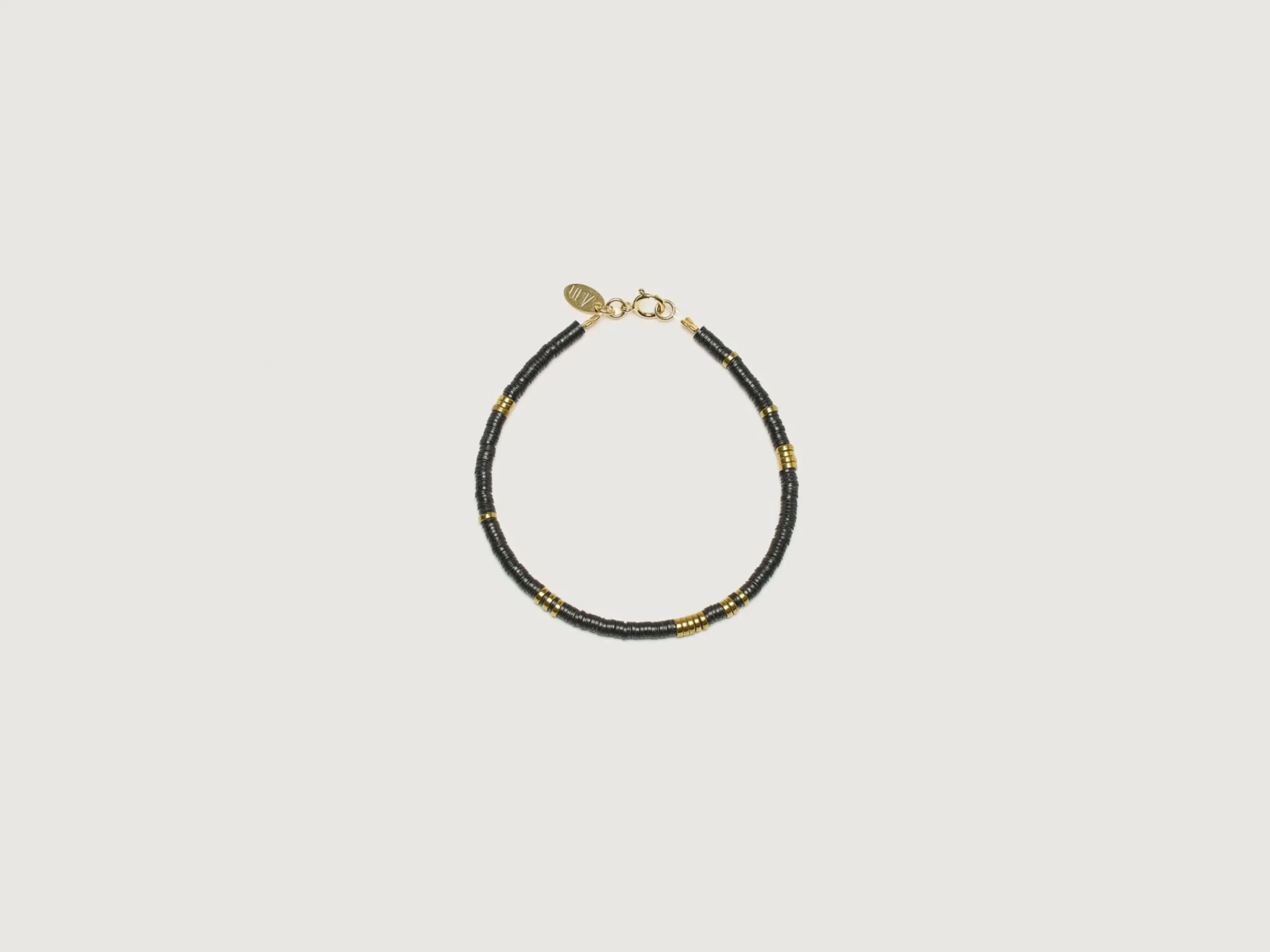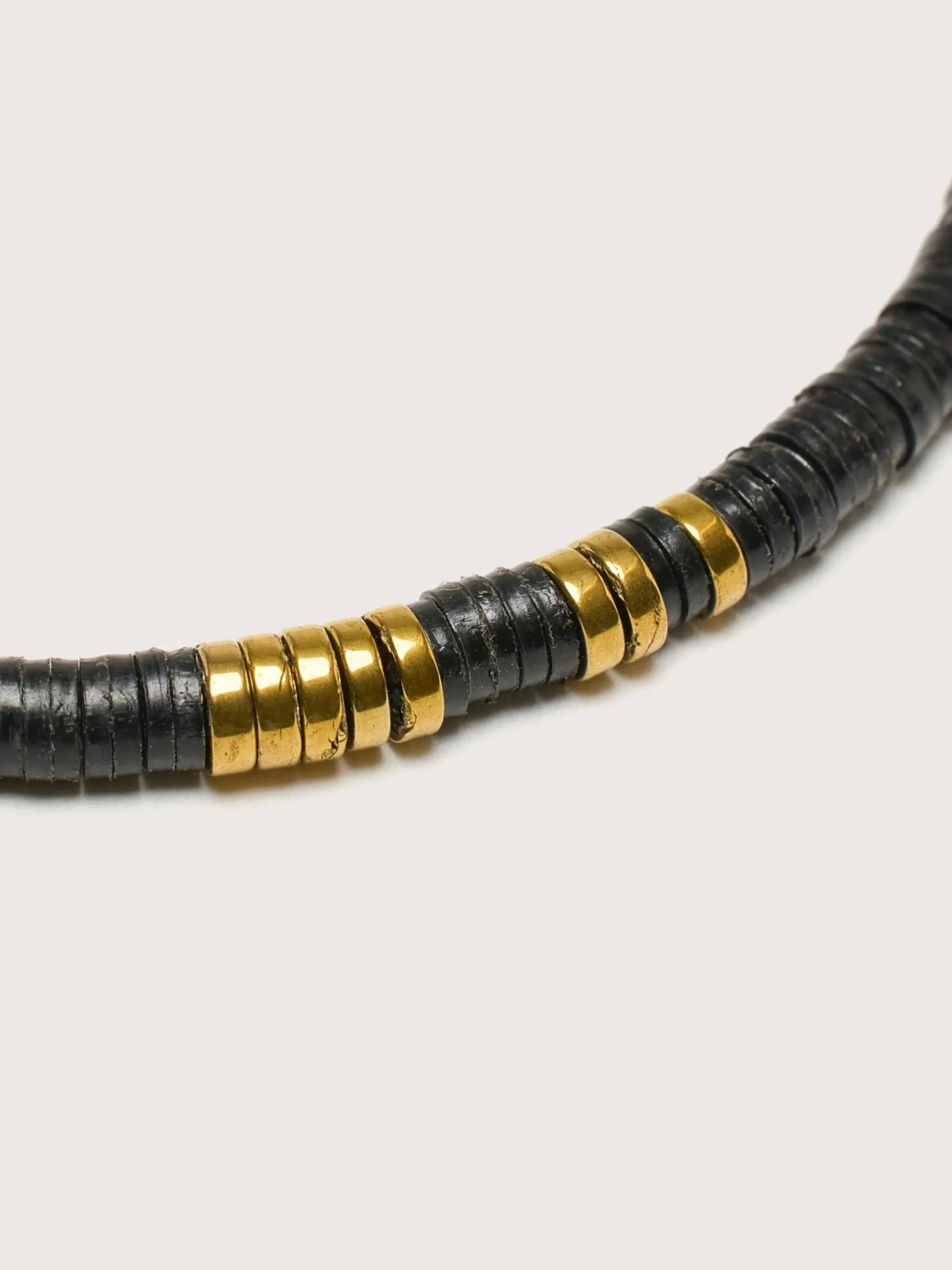 De Maison Mönik Shakku Noir handgemaakte armband is gemaakt van gerecycled Ghanees vinyl en metallic hematietkralen.