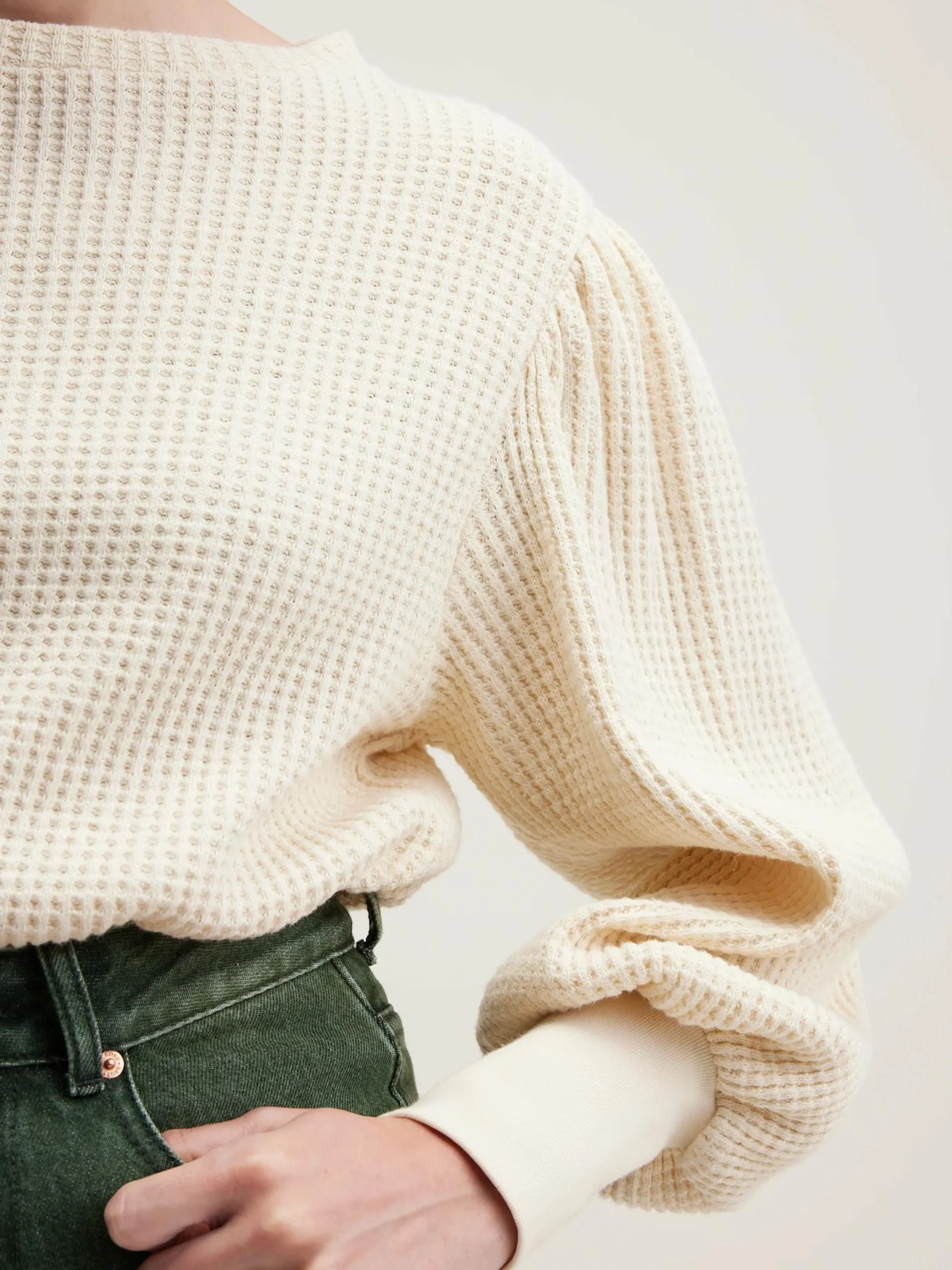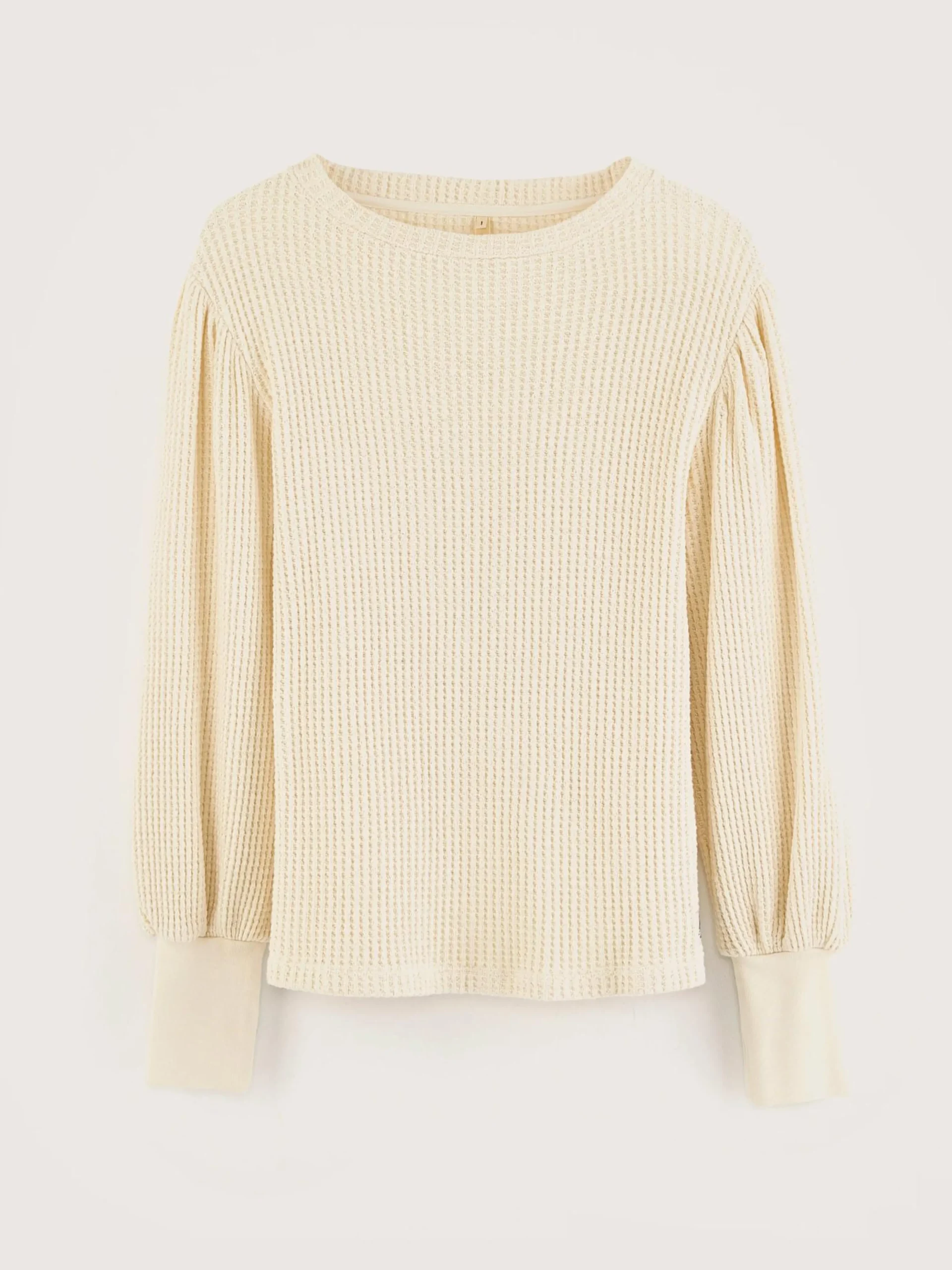Gewafeld t-shirt met lange pofmouwen, van crèmekleurig katoen.