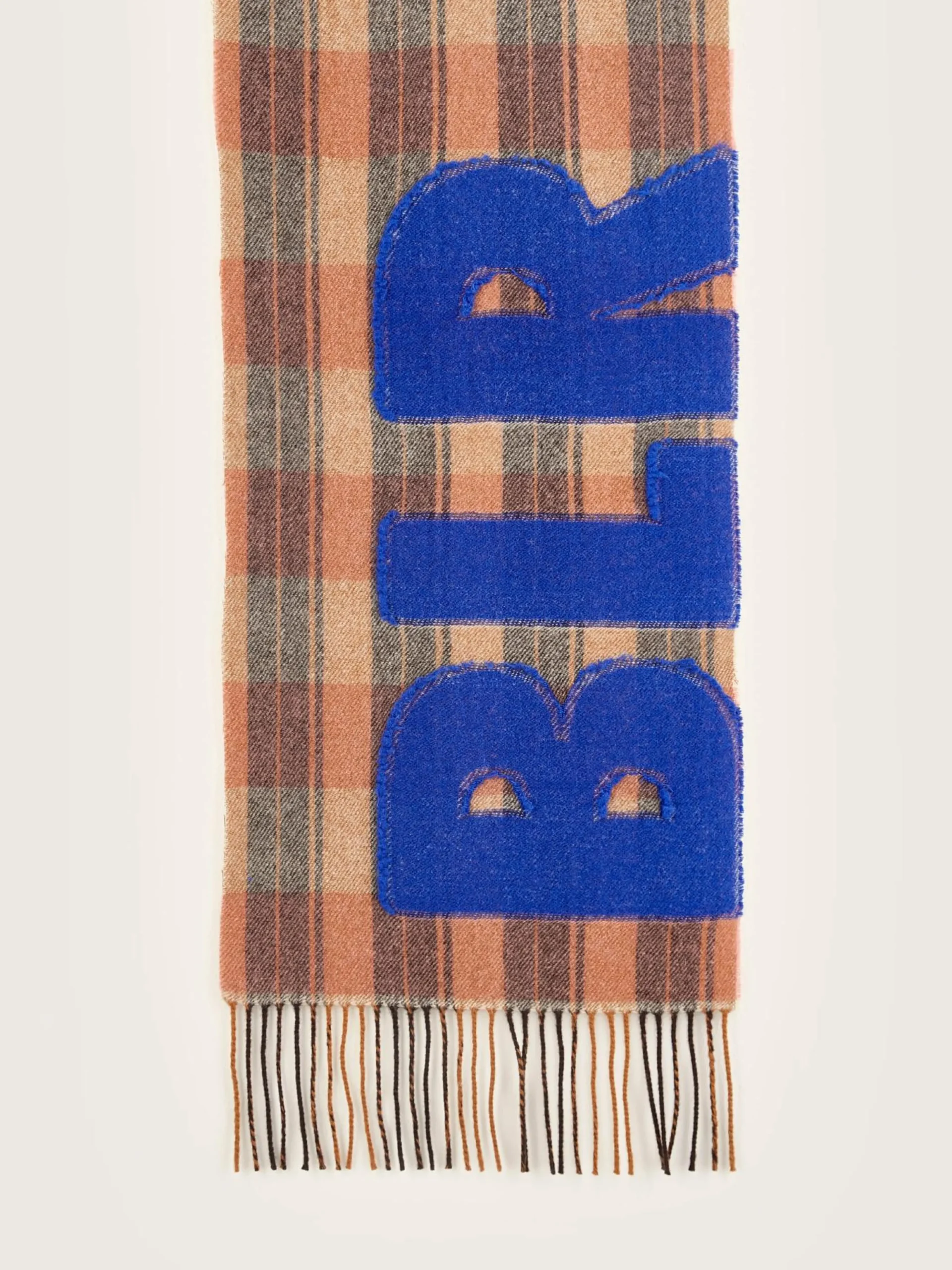 Sjaal in Schotse ruit met dubbel geweven opschriften: ‘BLR’ en ‘1989’ in contrasterend blauw.