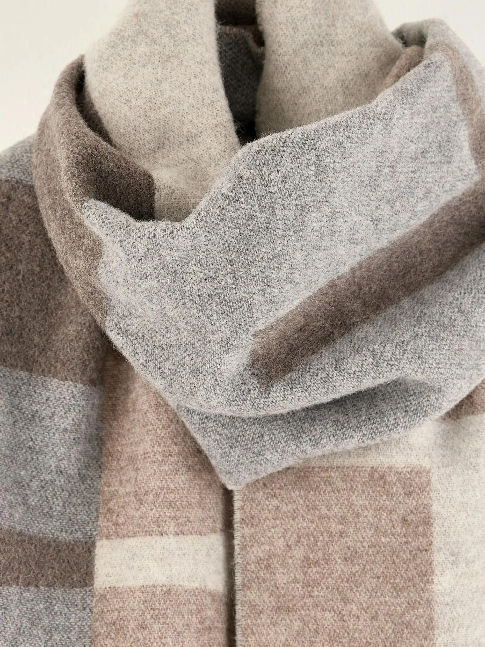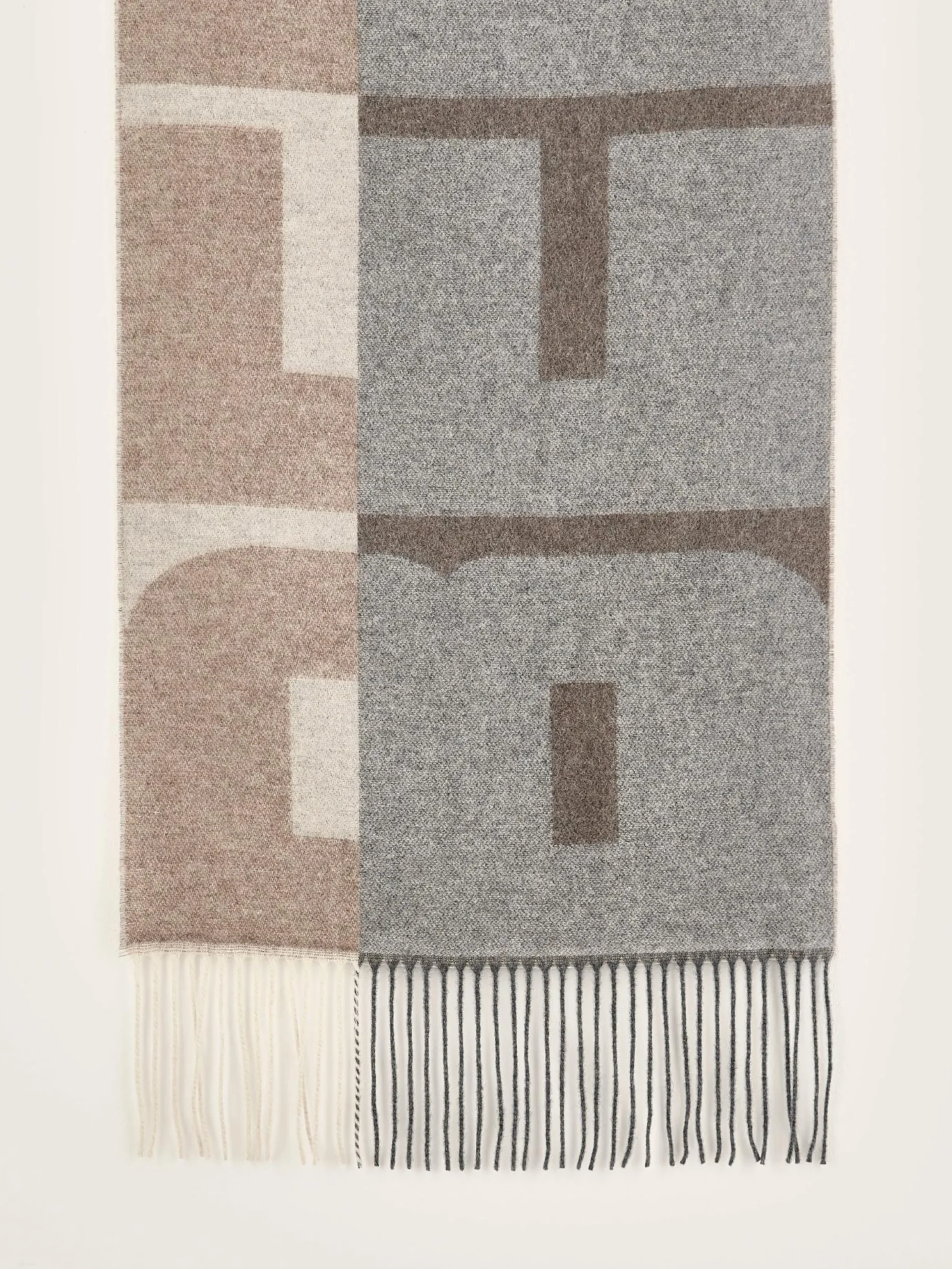 Geweven sjaal in neutrale tinten, met reusachtig groot logo.