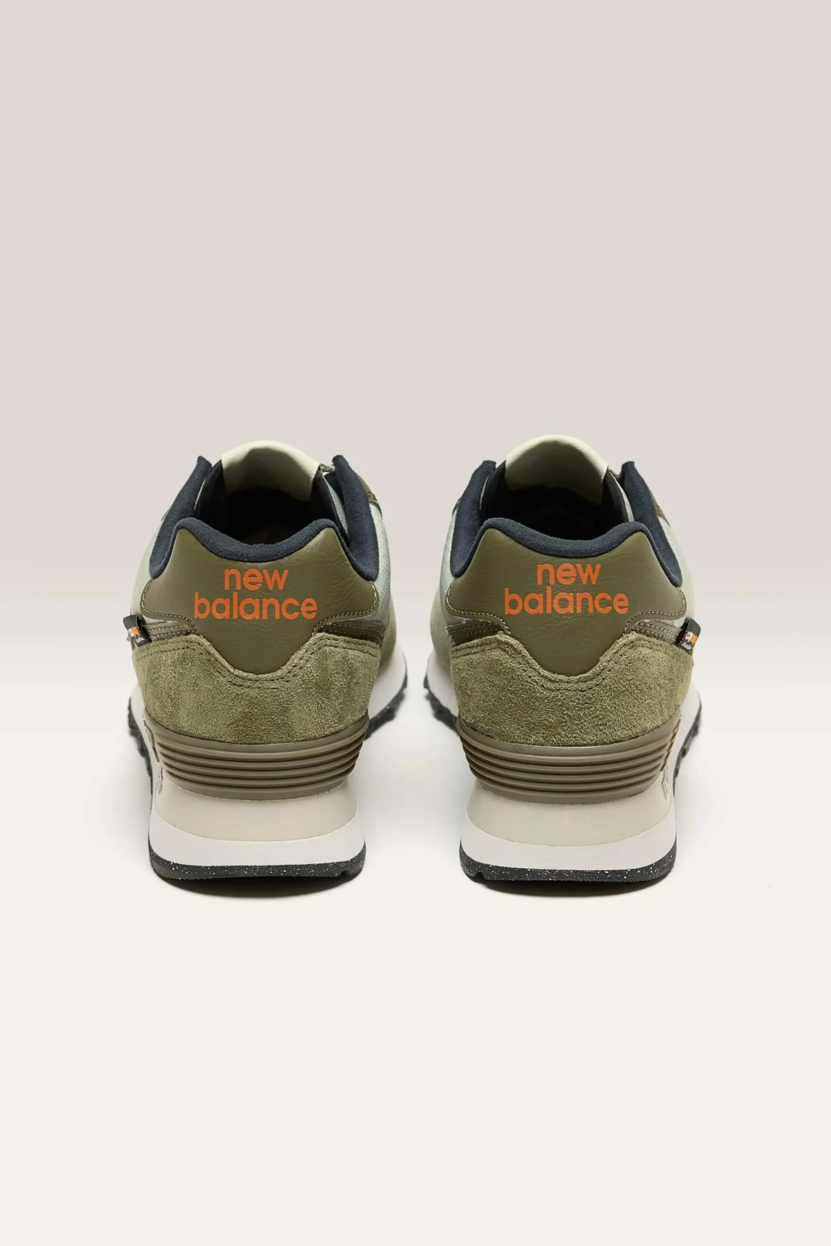 The New Balance 574 lifestyle sneaker features a suede hybrid road/trail design with lightweight EVA cushioning.