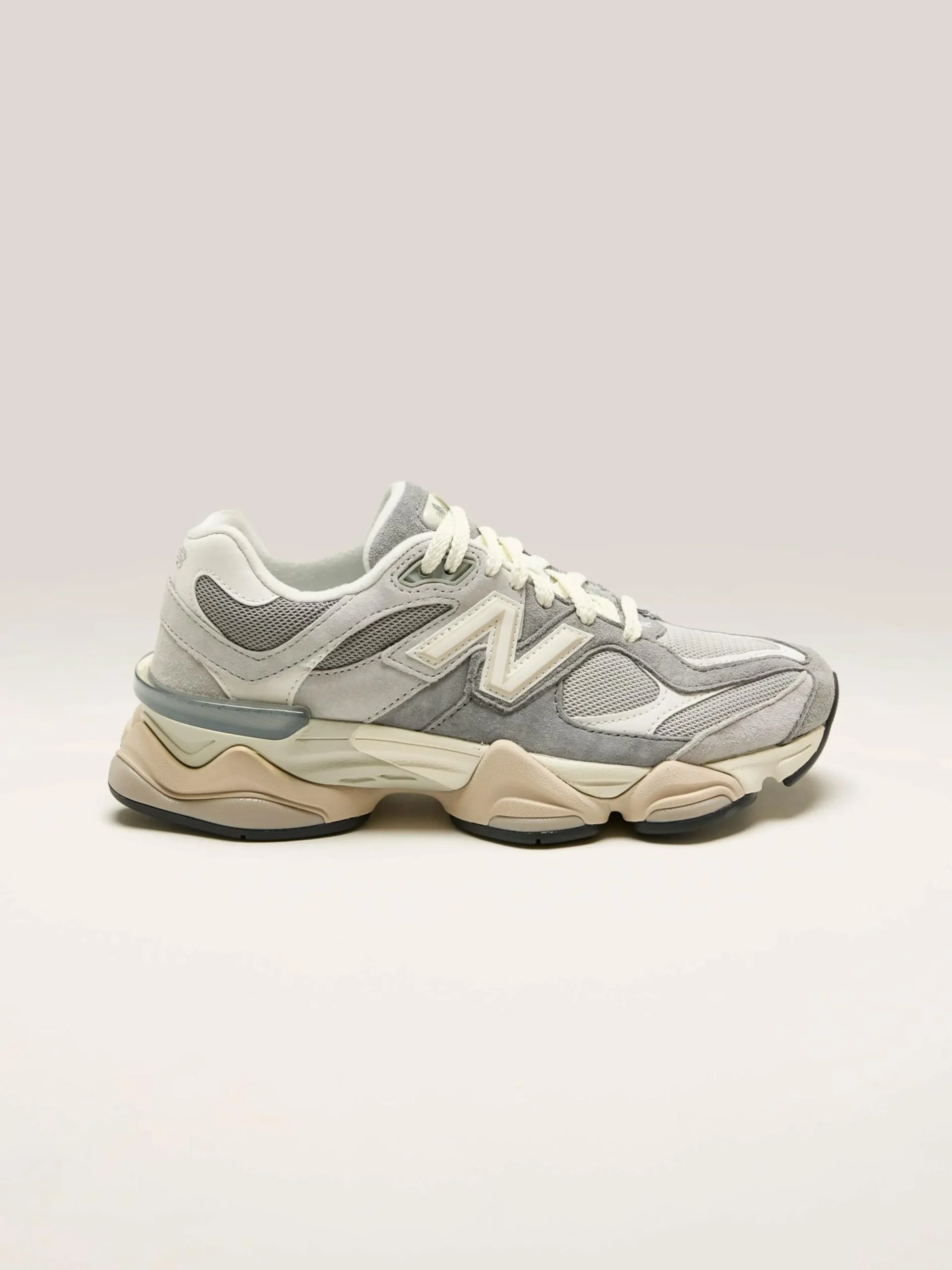 De New Balance 9060 sneakers hebben een technisch bovenwerk van leder, suède en mesh, een dempende middenzool en een buitenzool met een diamanten patroon.