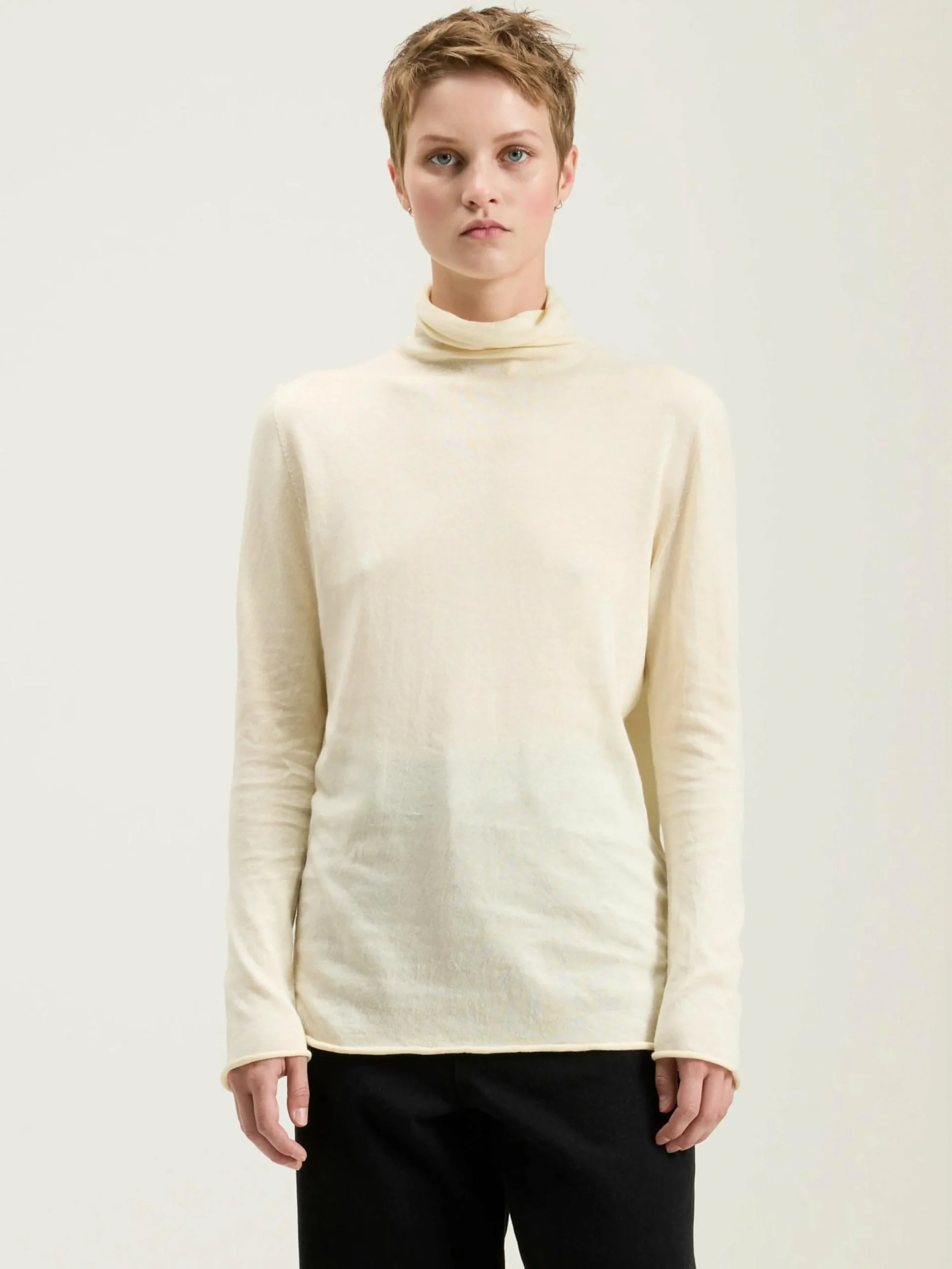 The Agnes Organic Cotton long-sleeve turtleneck from luxury Japanese brand Nicholson & Nicholson features a high-neck collar with roll-trim.
