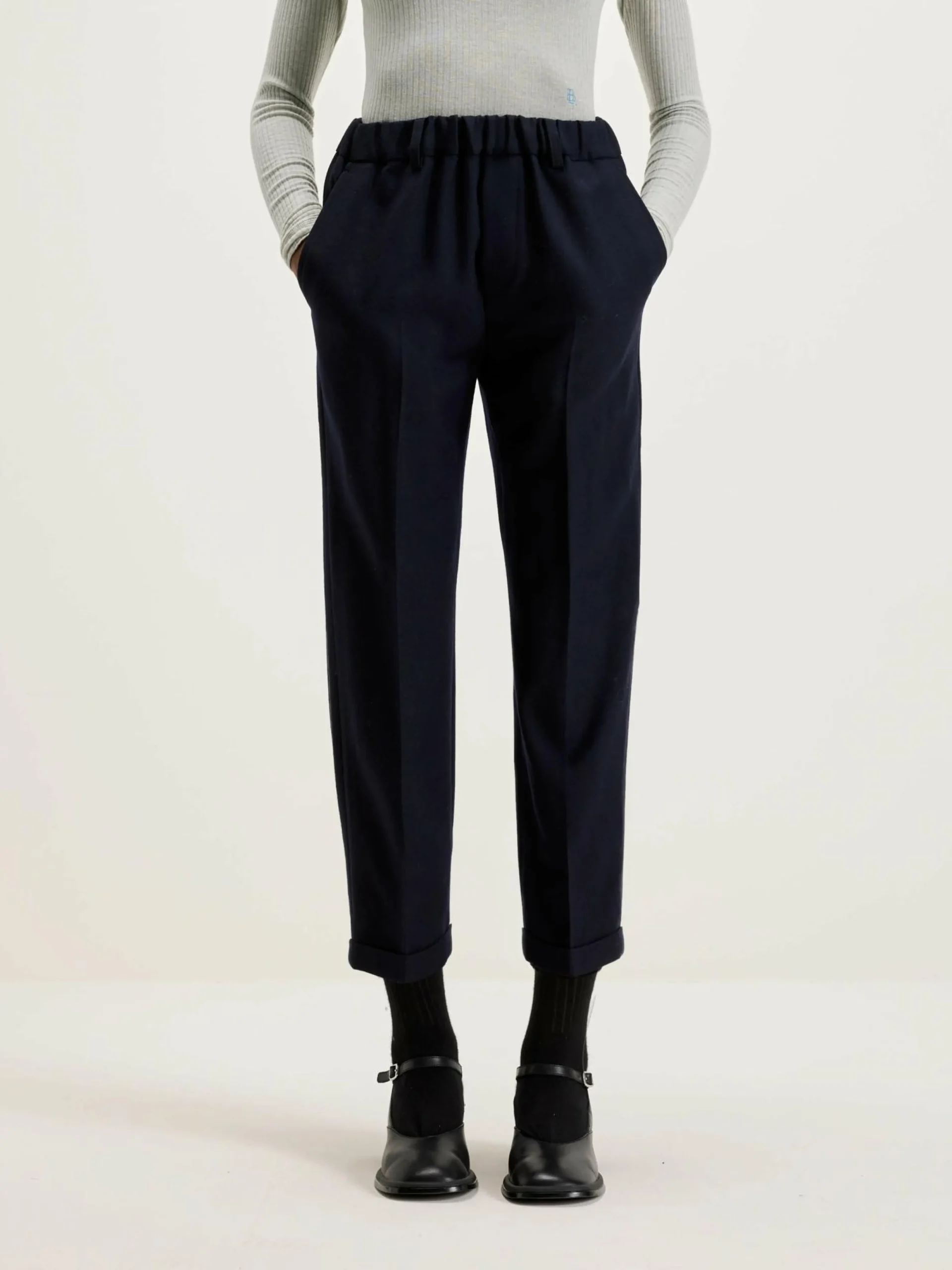 De Sand Boyfriend broek van het Japanse luxemerk Nicholson & Nicholson heeft een smal silhouet met een elastische tailleband in stretch twill wol.