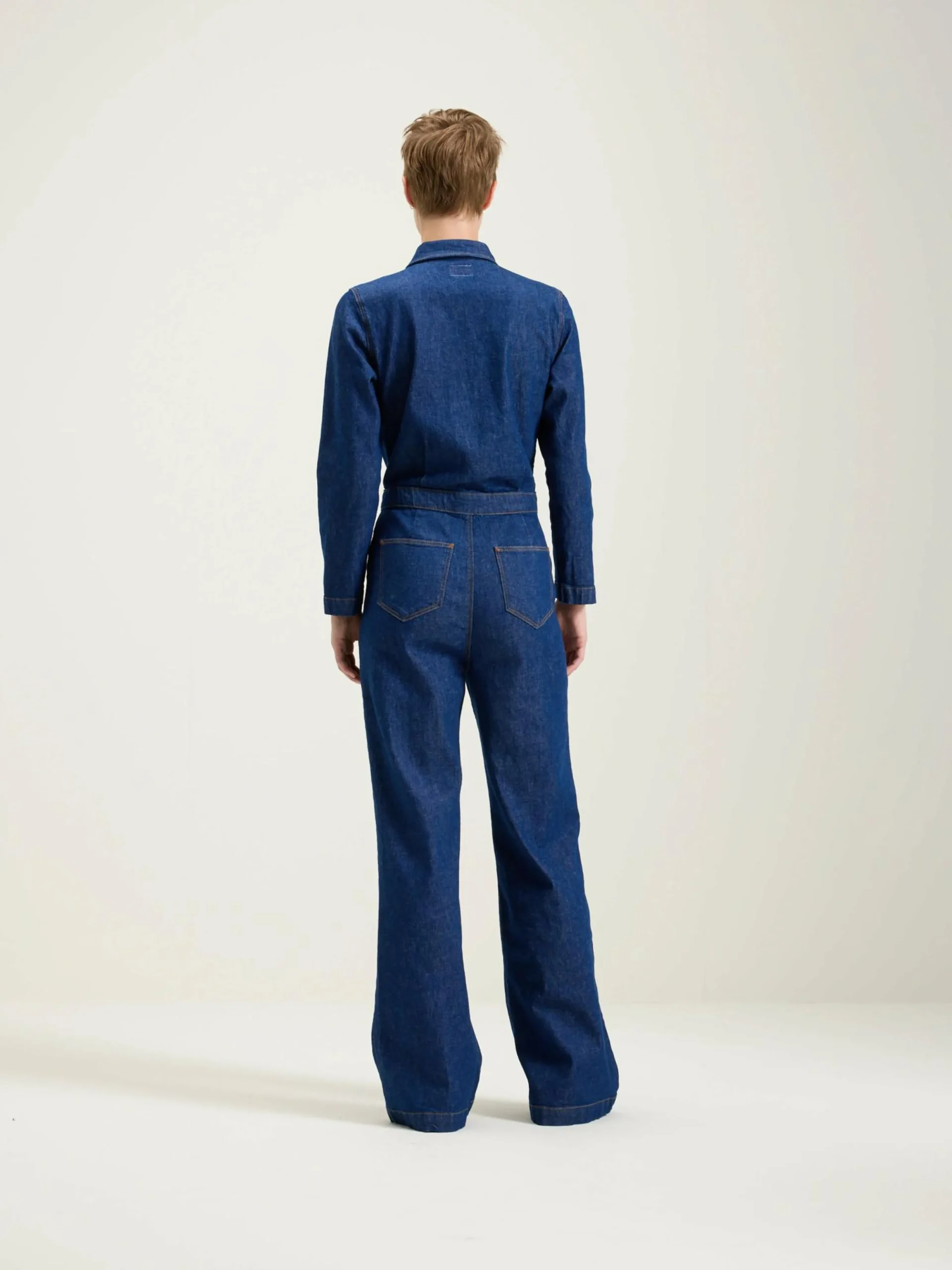Denim jumpsuit met aansluitende pasvorm en ritssluiting vooraan, met wijd uitlopende pijpen en opgestikte zakjes op de taille.