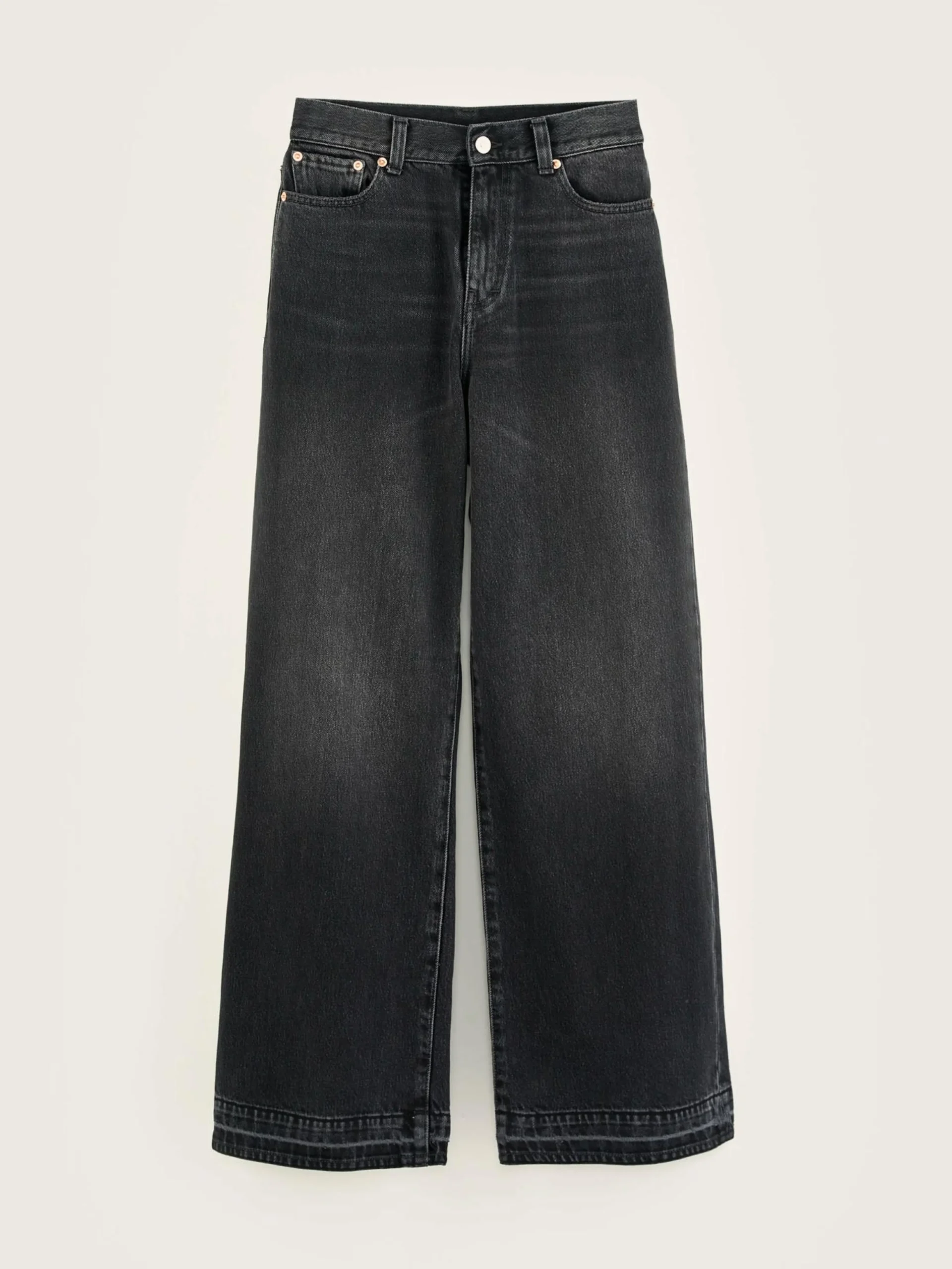 High-waist boyfriend jeans met wijde pijpen en gerafelde details op de zoom, van zwart denim met een versleten look.