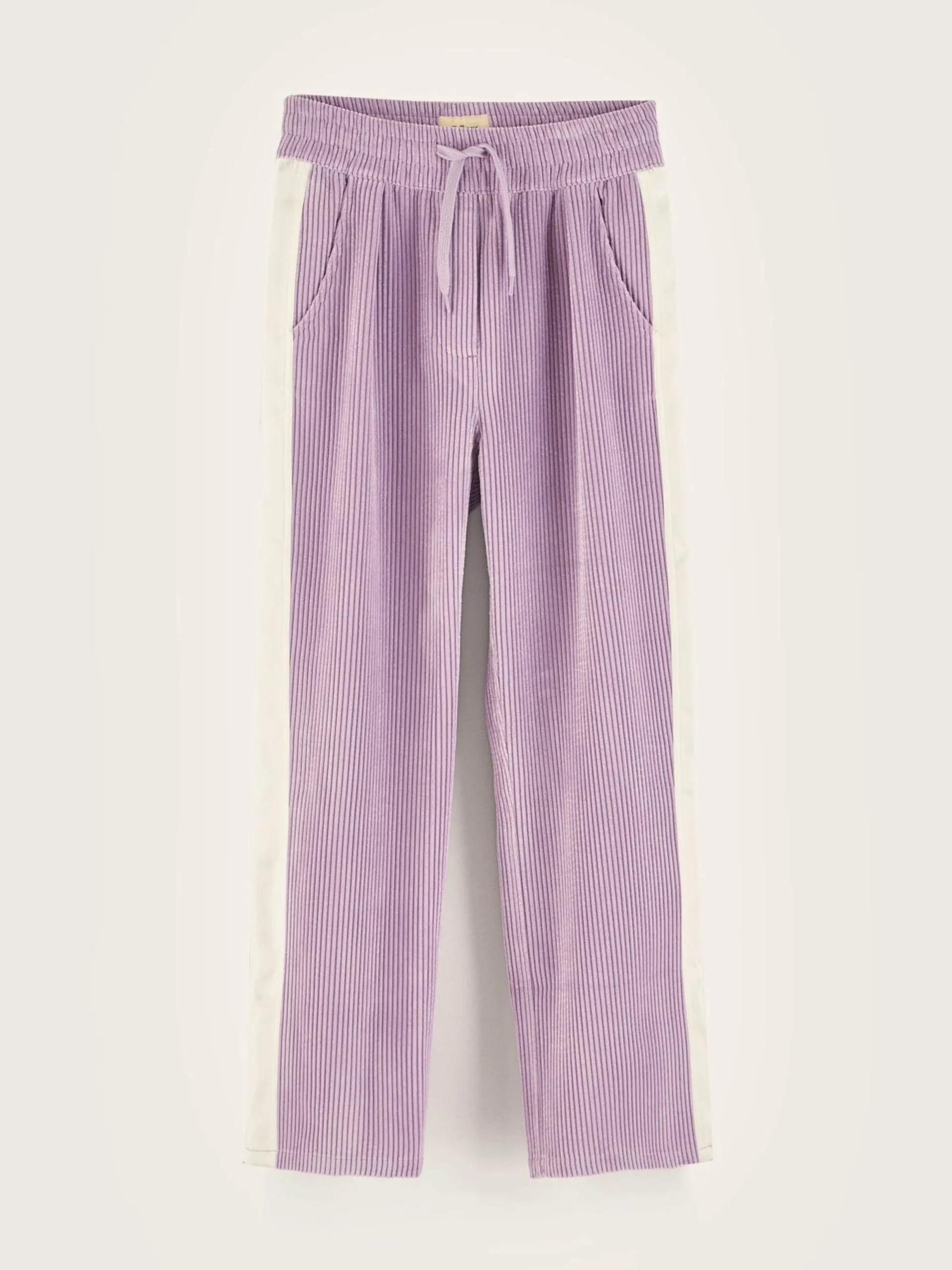 Lavendelkleurige, sportieve broek met hoge taille, van corduroy met brede rib.