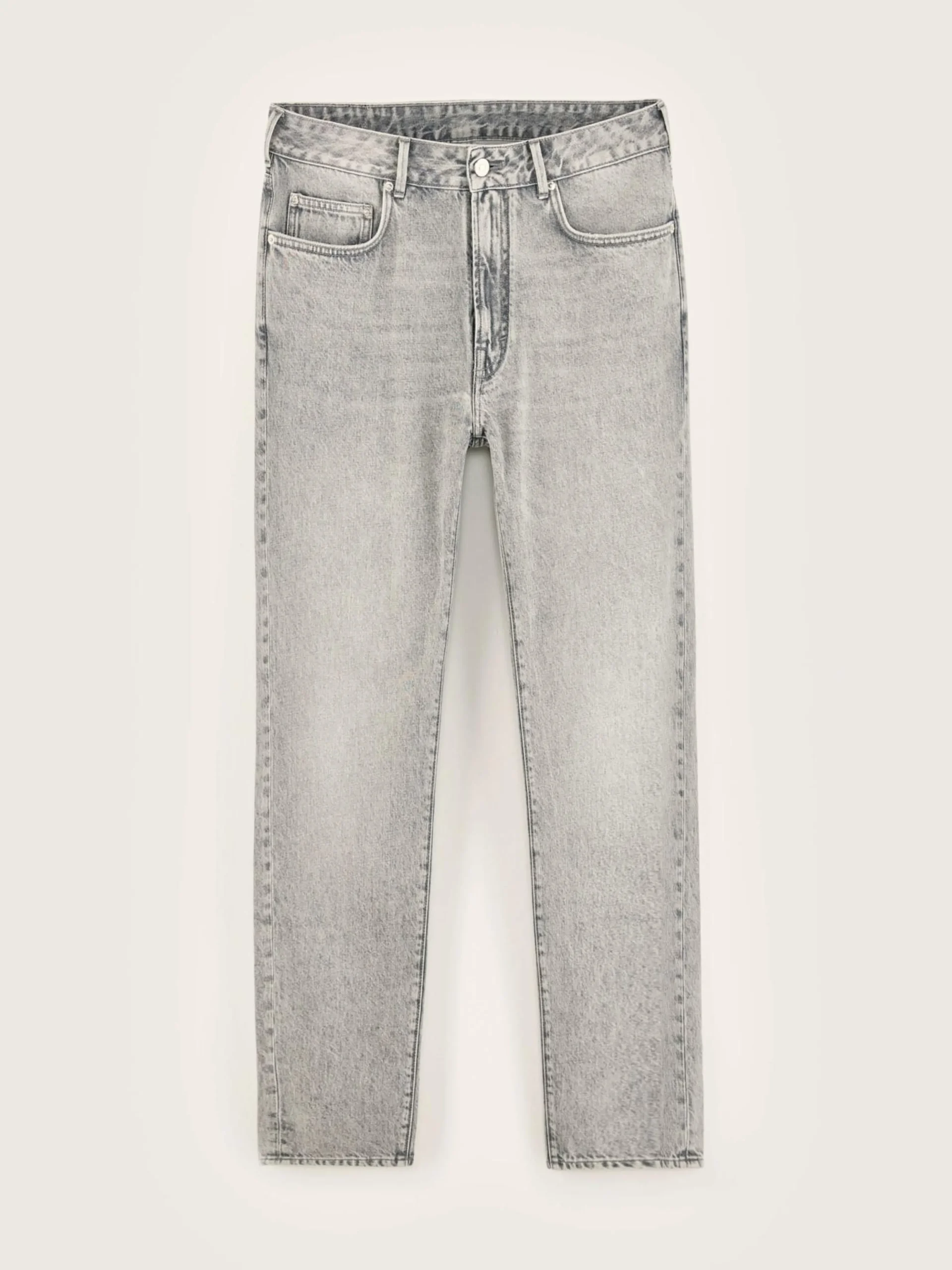 Slim fit jeans met hoge taille en taps toelopende pijpen, van versleten grijs katoendenim.