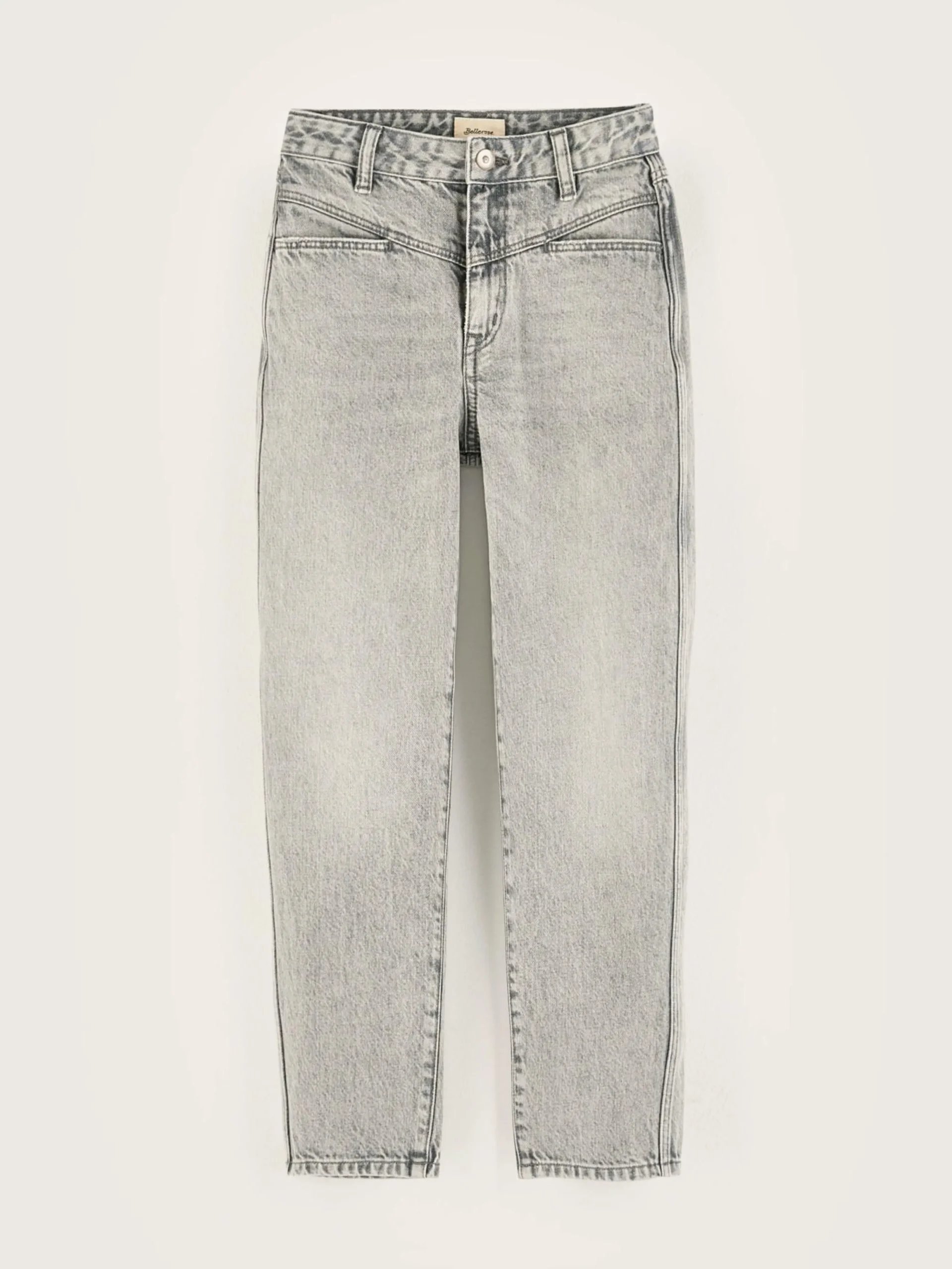 Hoge taille grijze jeans met taps toelopende pijpen en een versleten look.