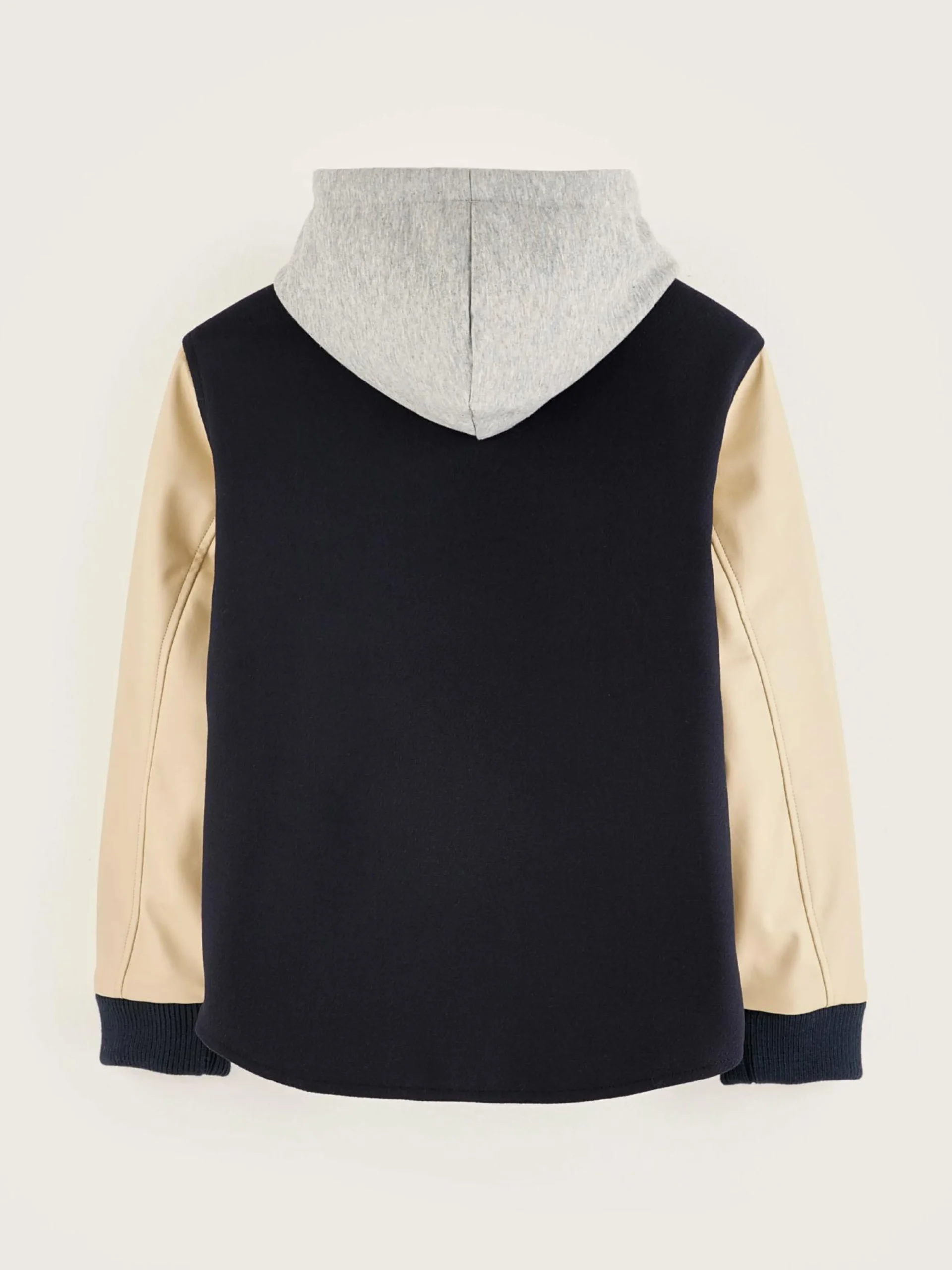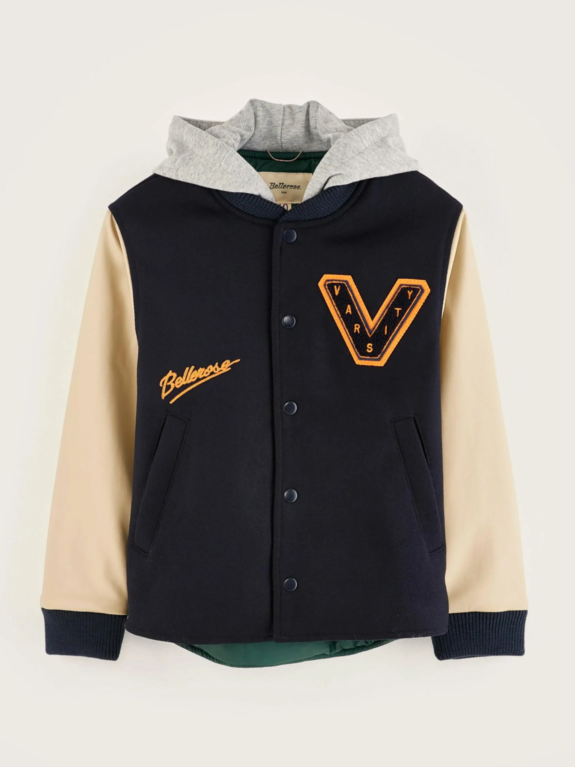 Varsity jacket met contrasterende mouwen, capuchon in jersey stof, en contrasterende Bellerose embroidery.