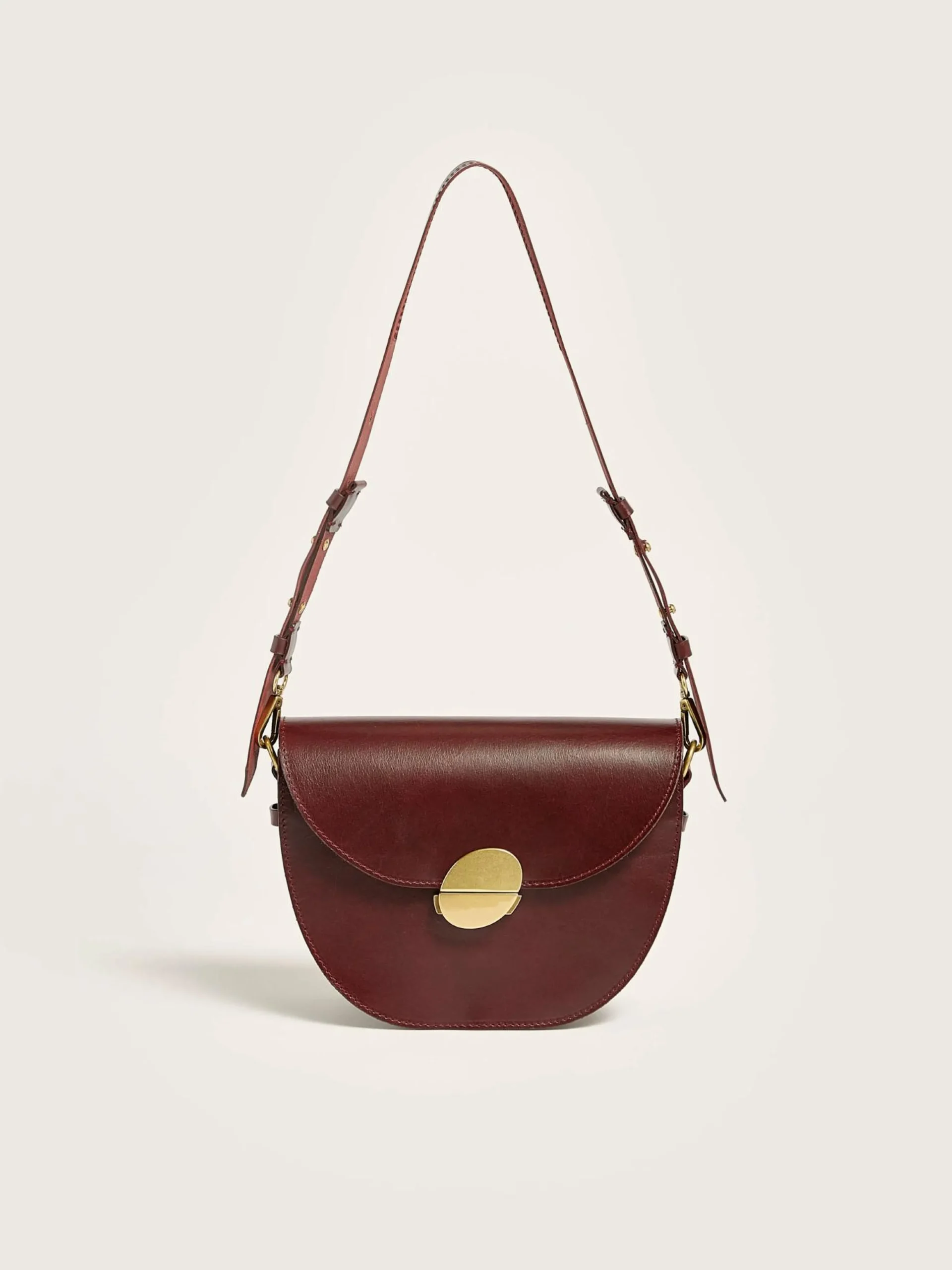 Halvemaanvormige schoudertas met gepolijste gesp, van wijnrood glad leer