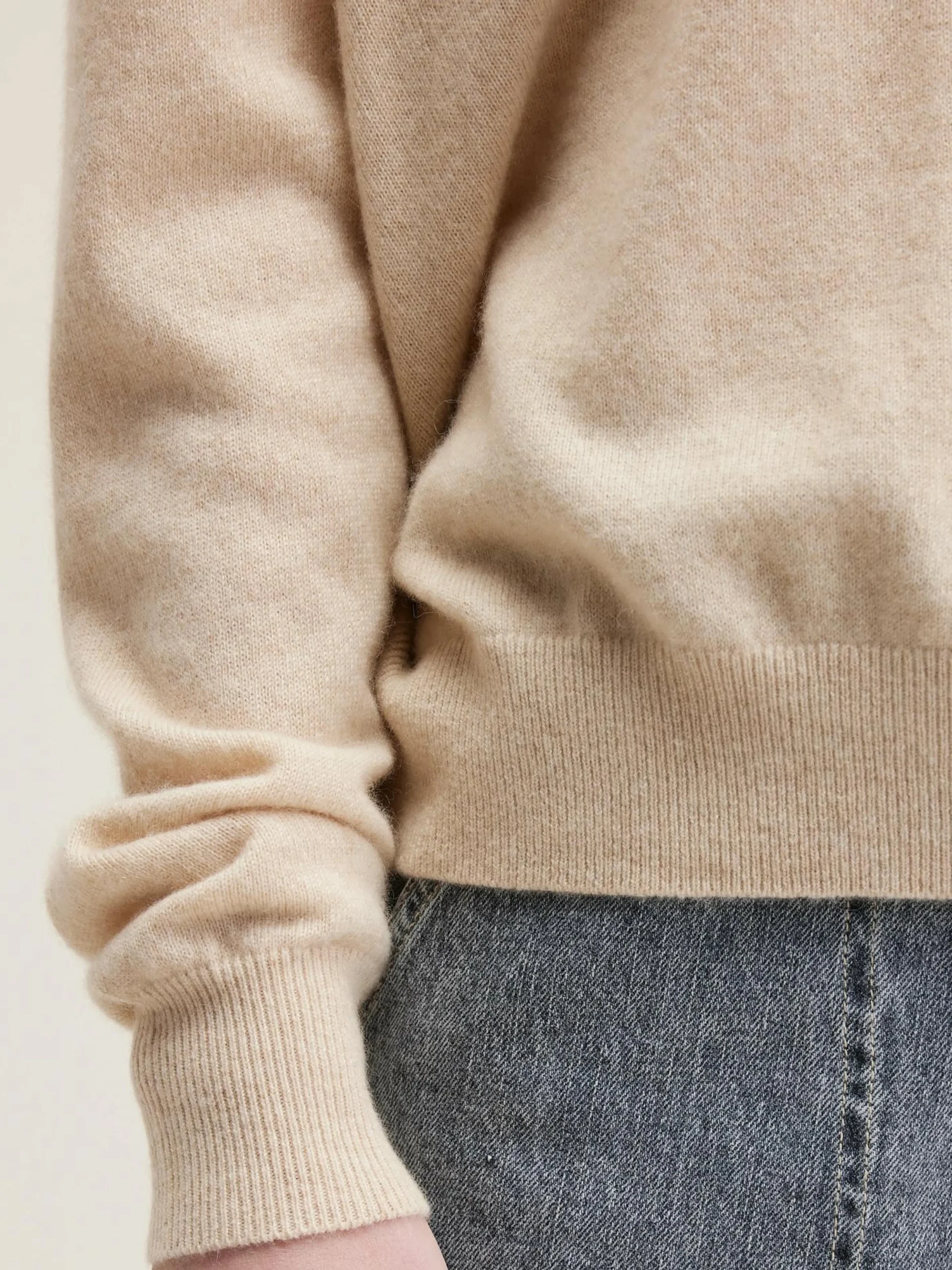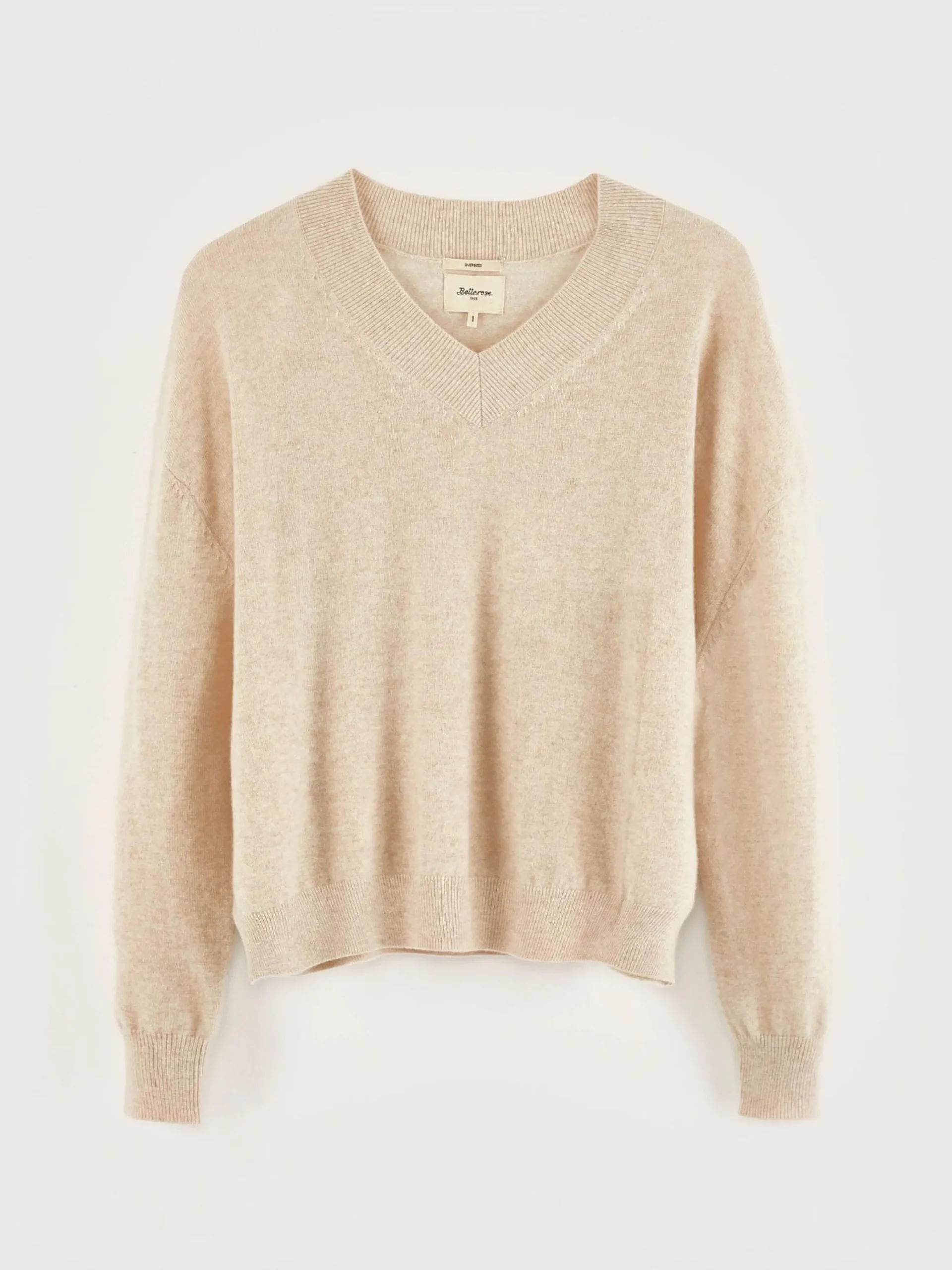 Oversizede havermoutkleurige trui van kasjmier, met V-hals.
