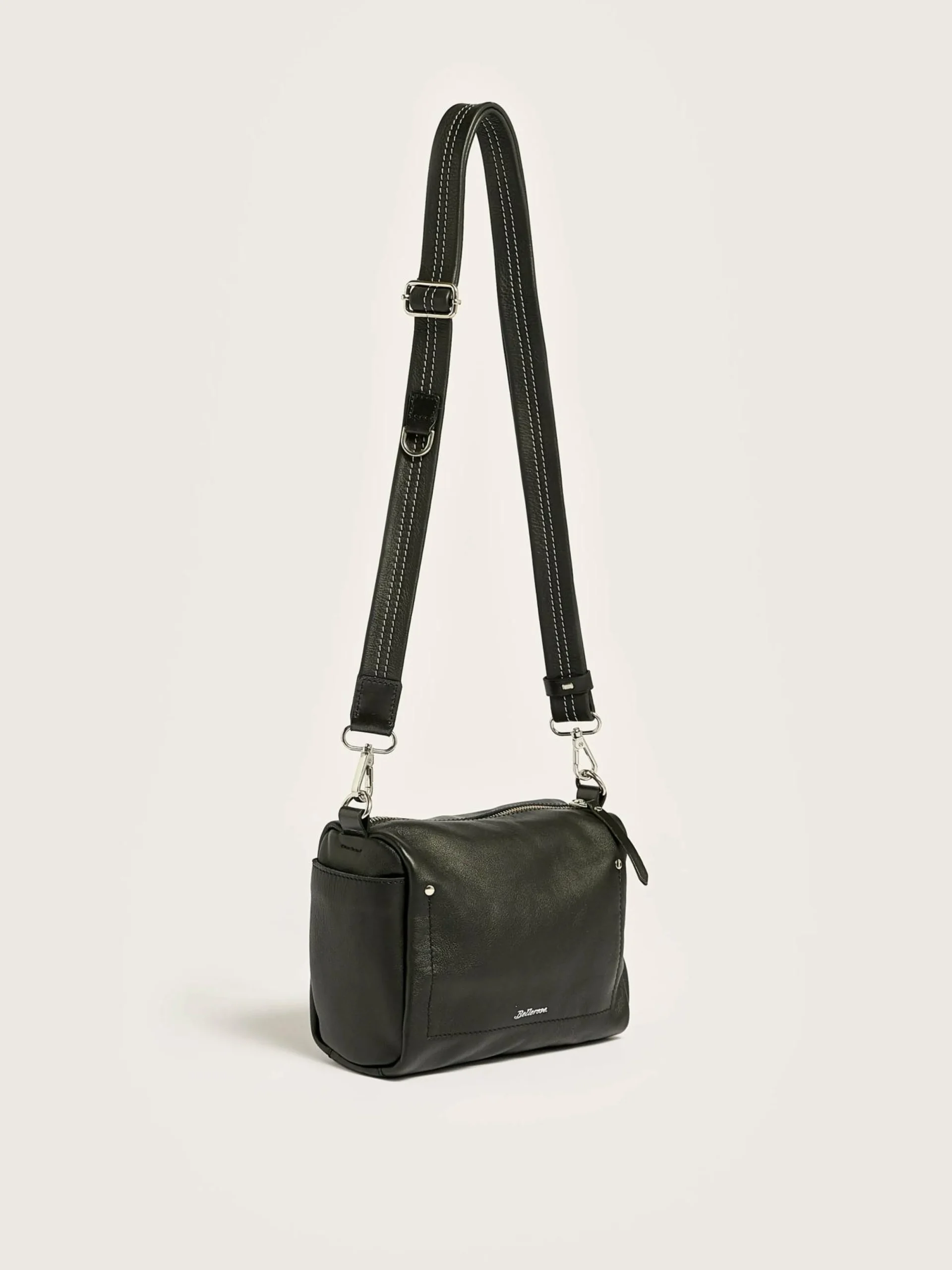 Verstelbare riem van zwart glad leer met zilverkleurige hardware.